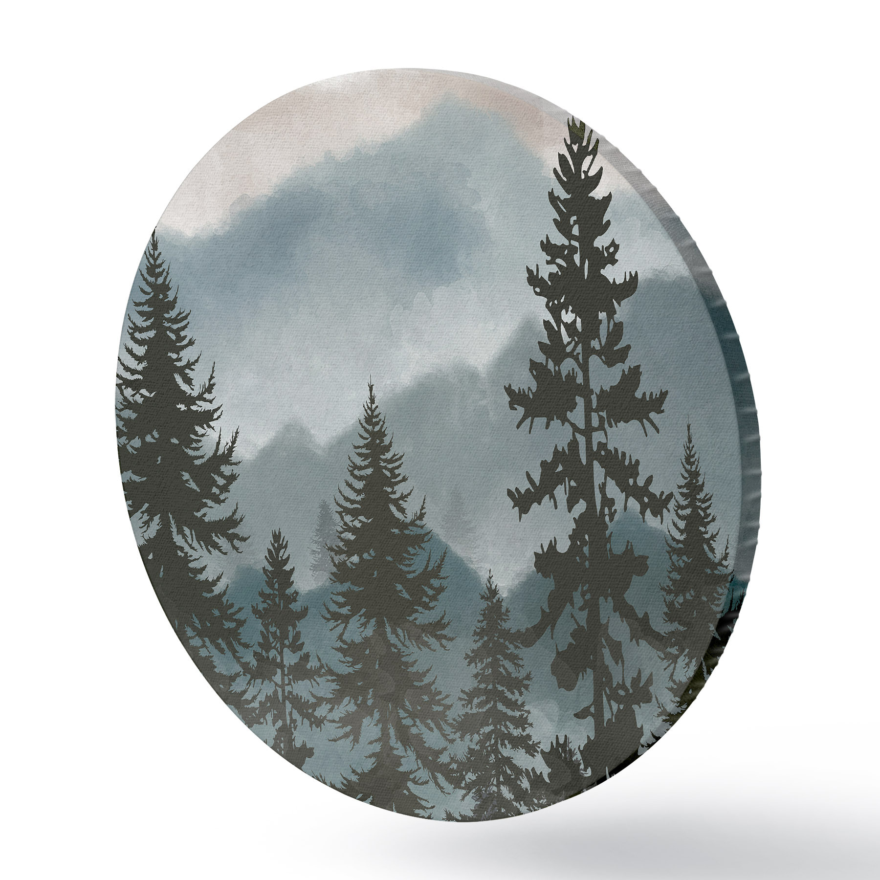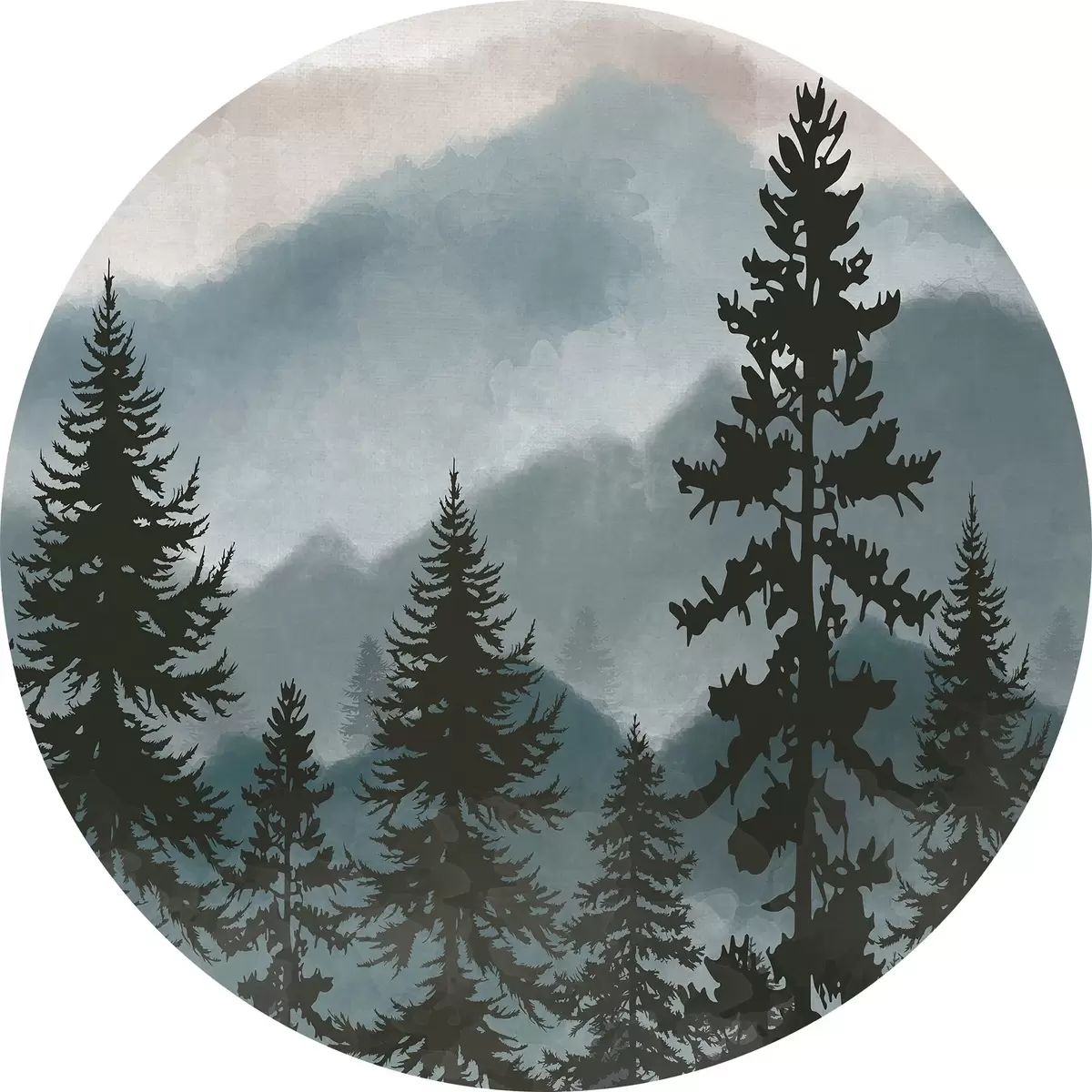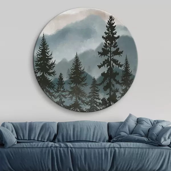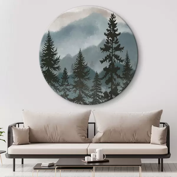 Apvalūs paveikslai Akvarele tapytas kalnų kraštovaizdis su eglėmis r37017