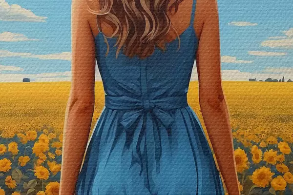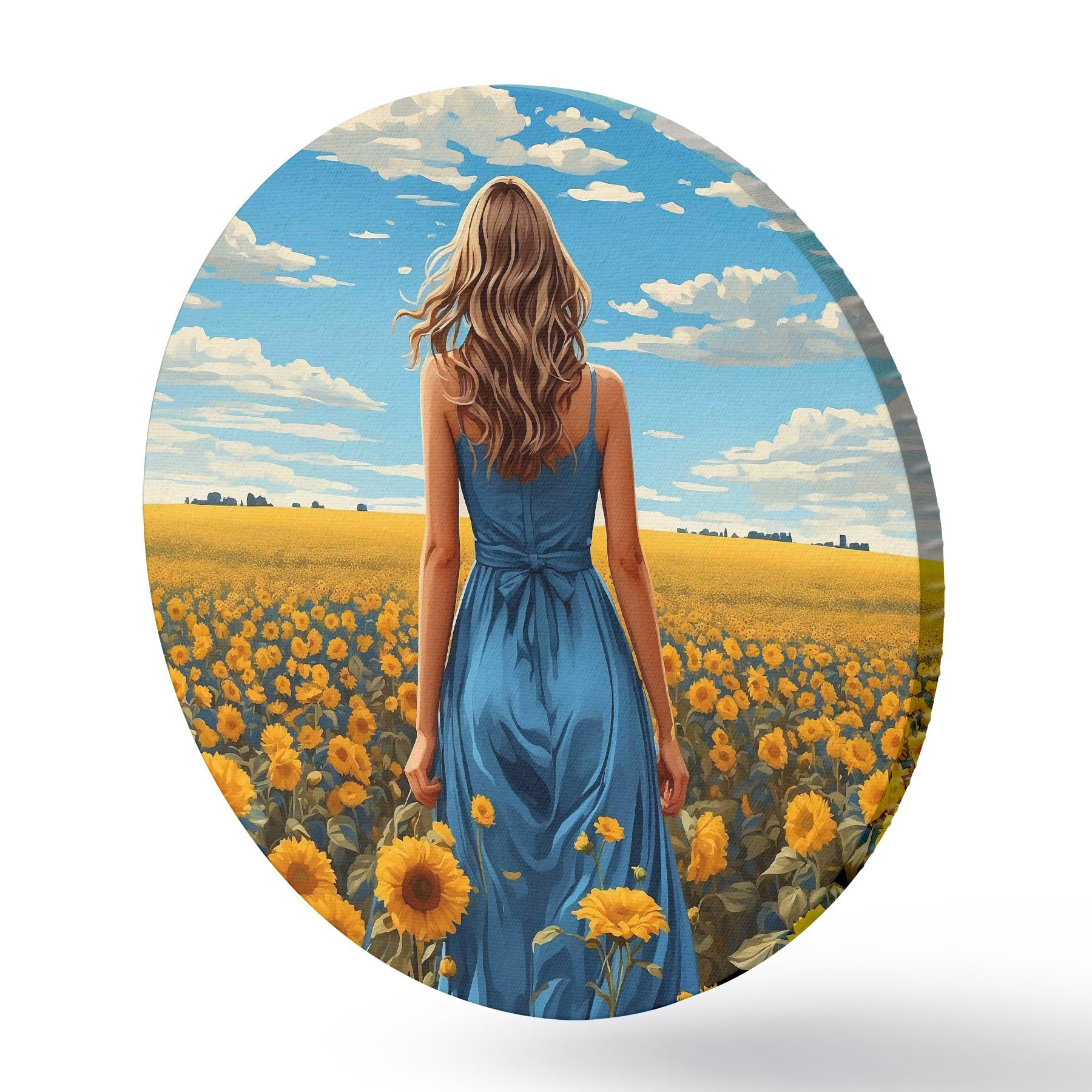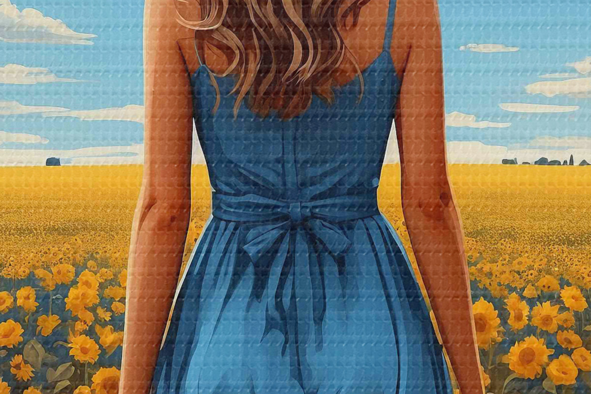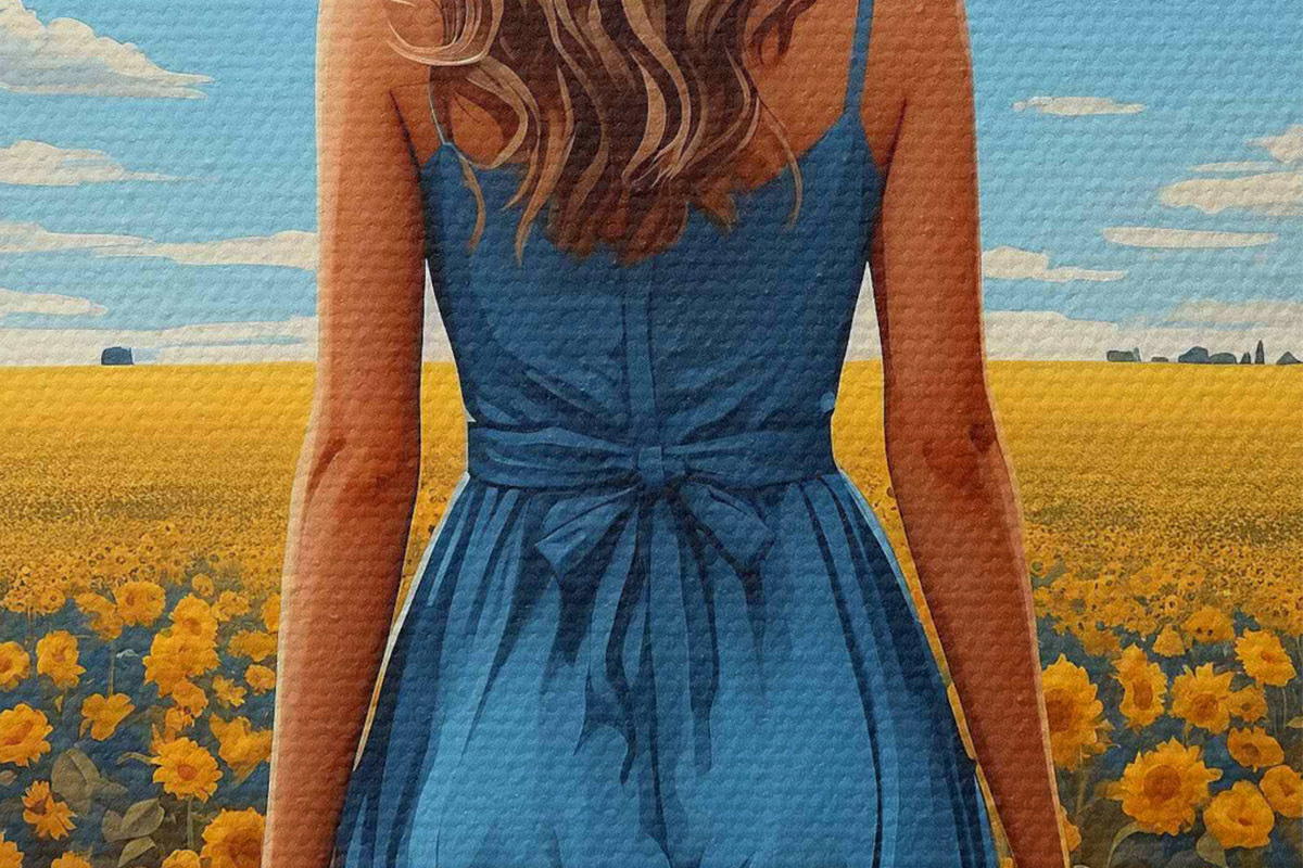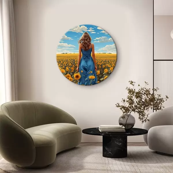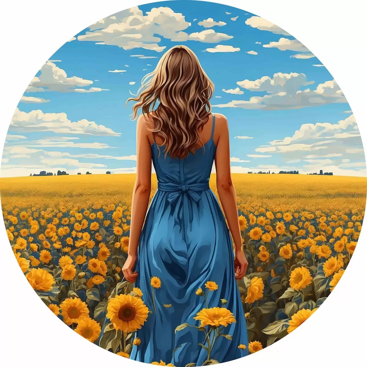 Nuotrauka Moteris mėlyna suknele saulėgrąžų lauke Nr r37164