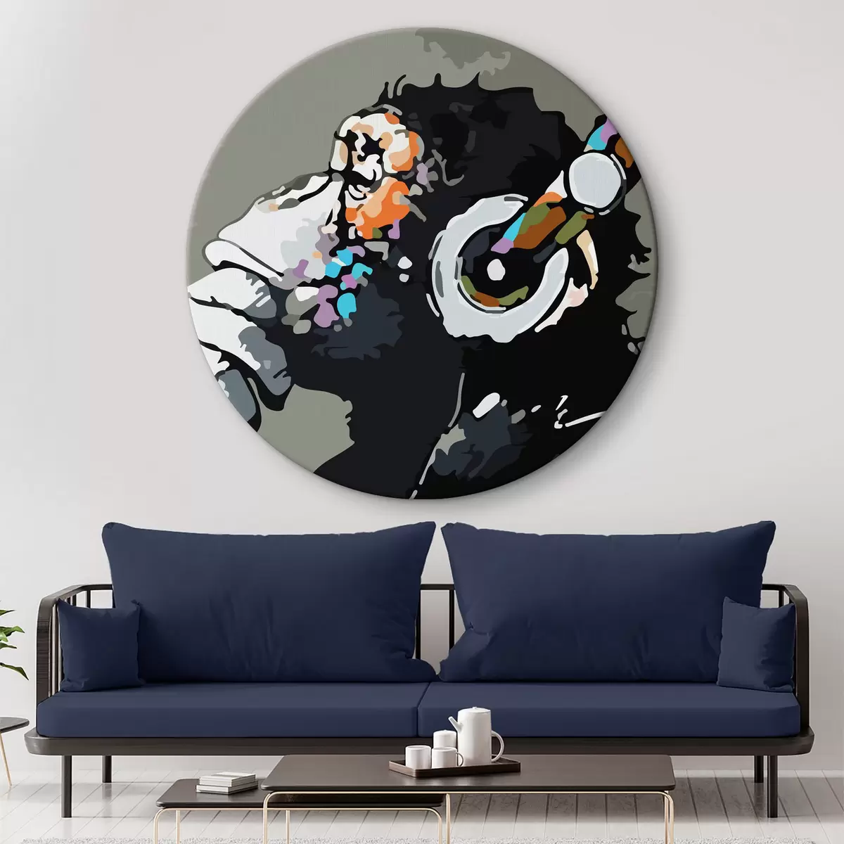 Nuotrauka Beždžionė su ausinėmis pilkame fone Nr r37269
