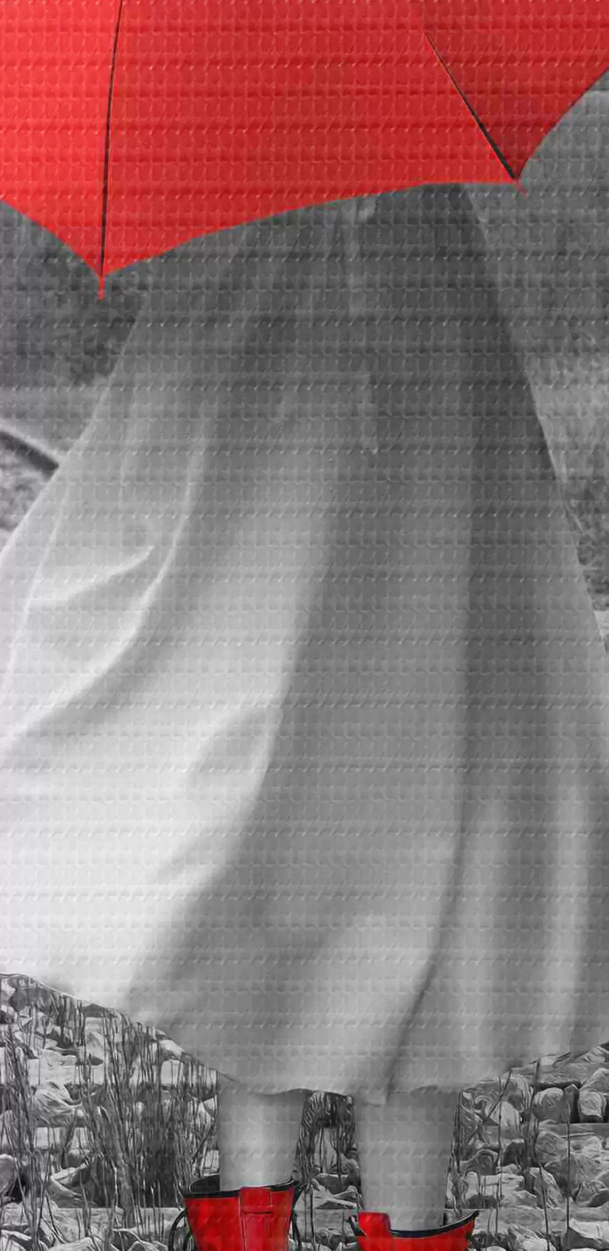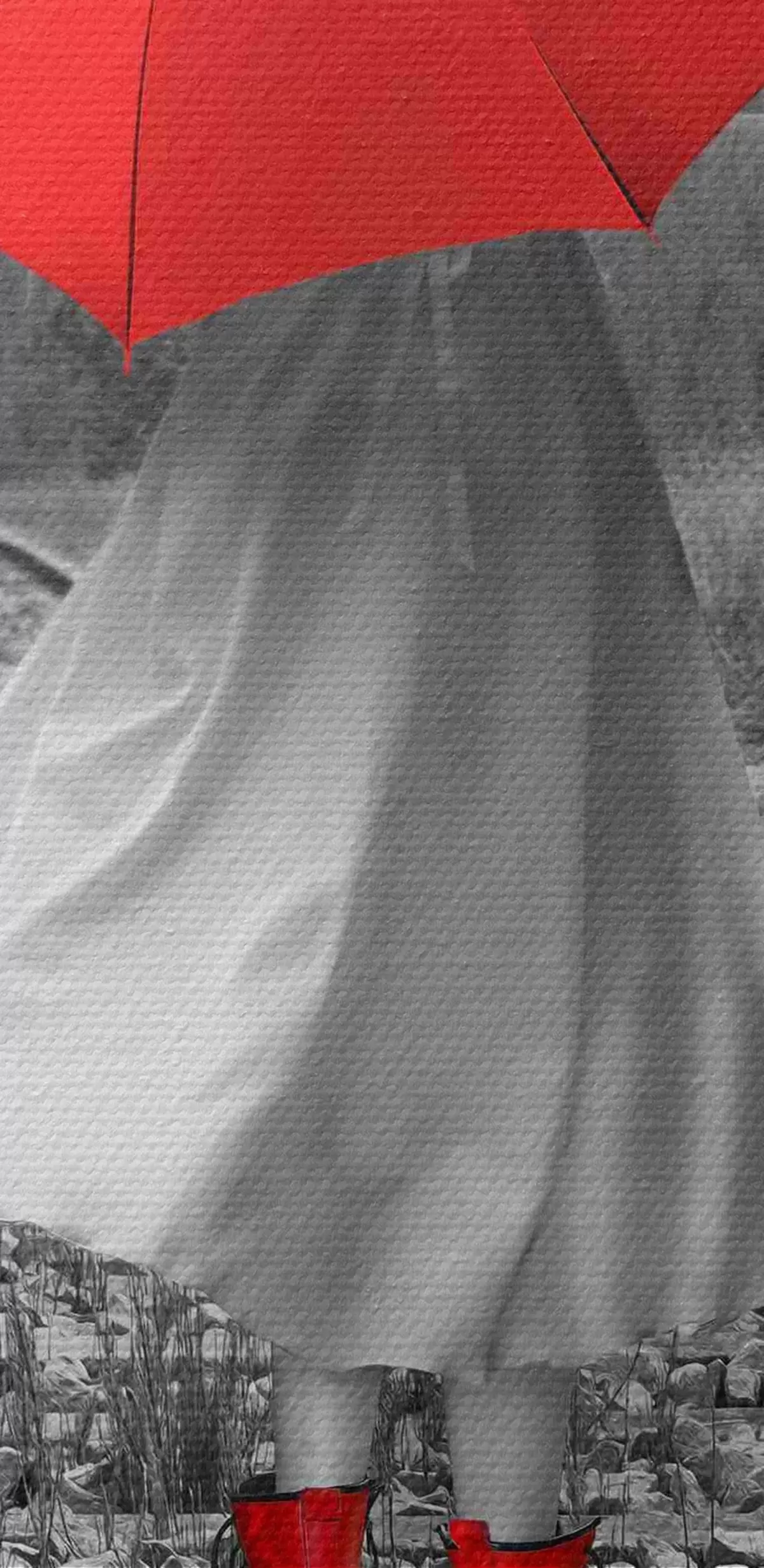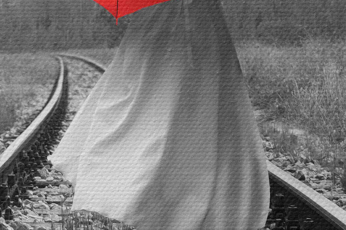 Nuotrauka Asmuo su raudonu skėčiu ant geležinkelio bėgių Nr r37301