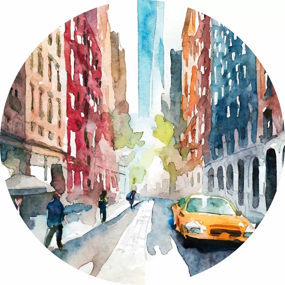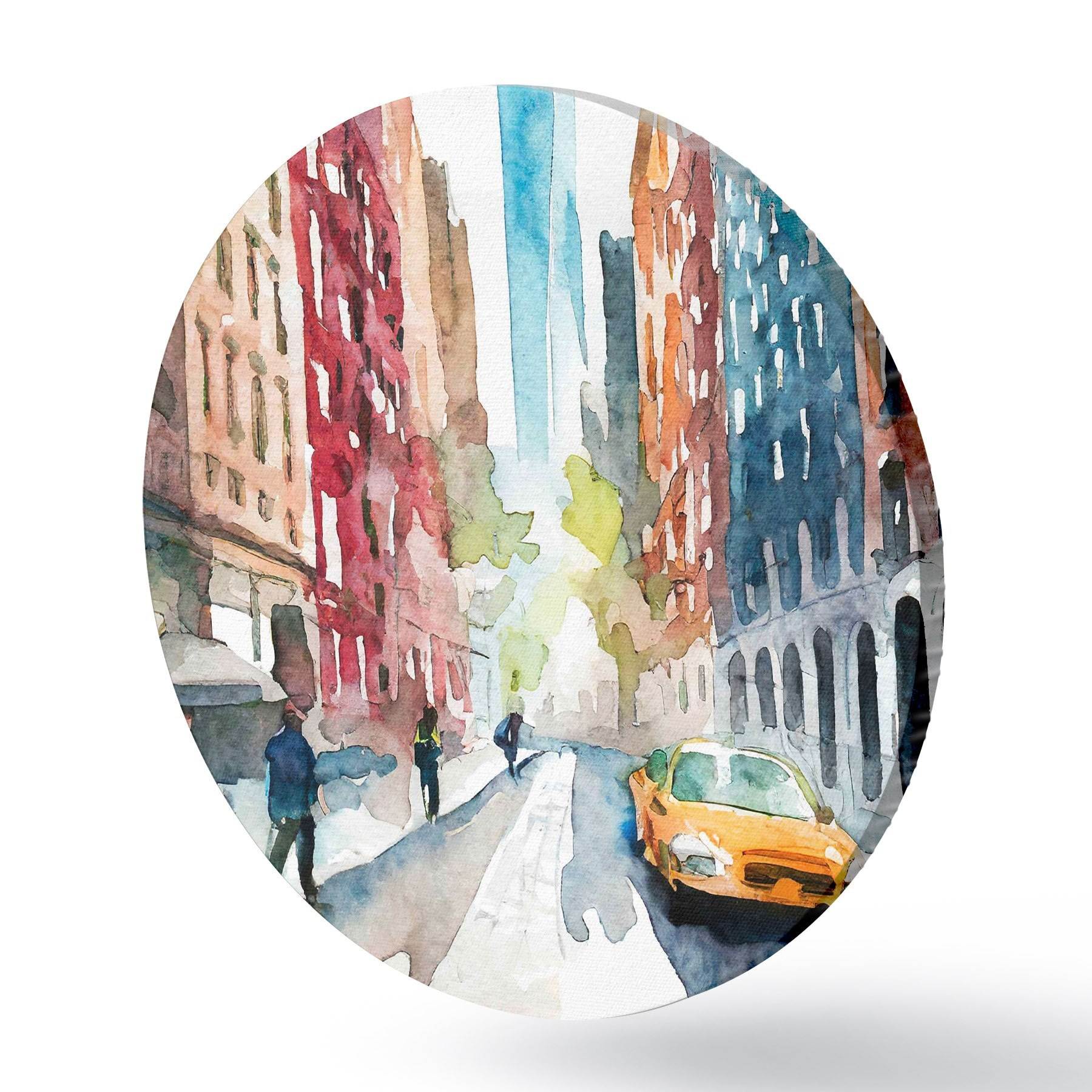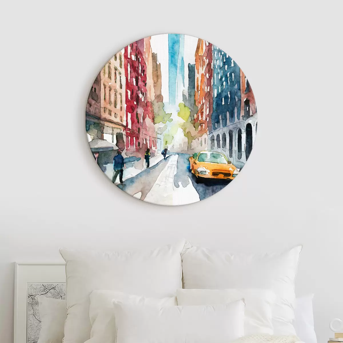Apvalūs paveikslai Akvarelė, vaizduojanti gatvę su pastatais ir aukštu bokštu fone r37346