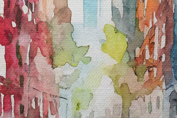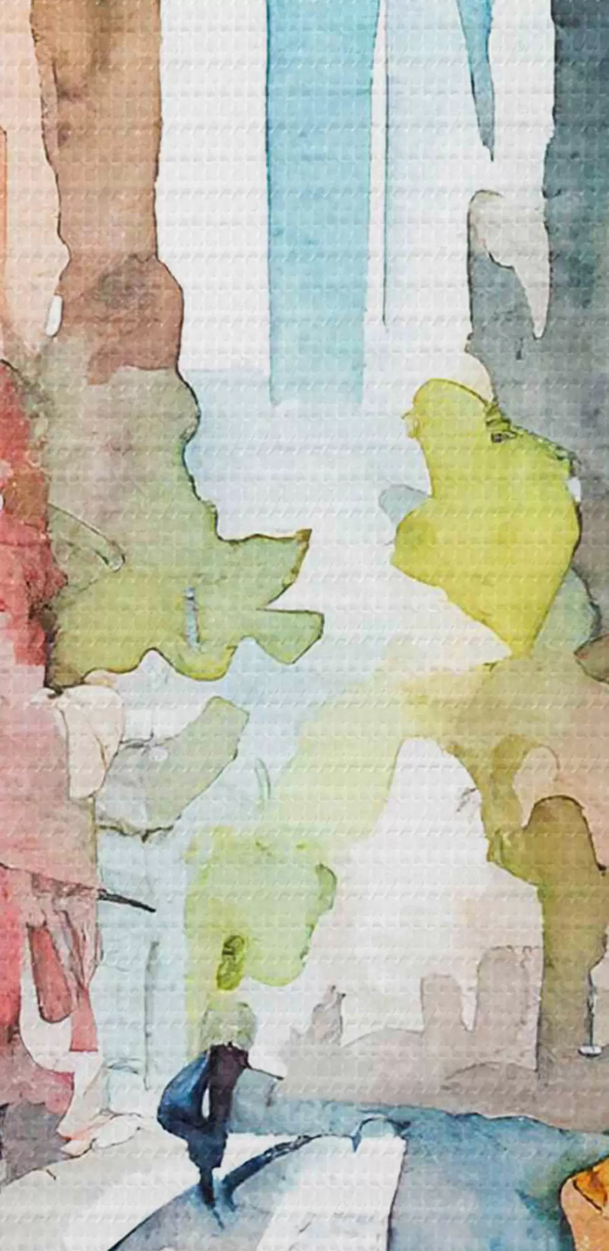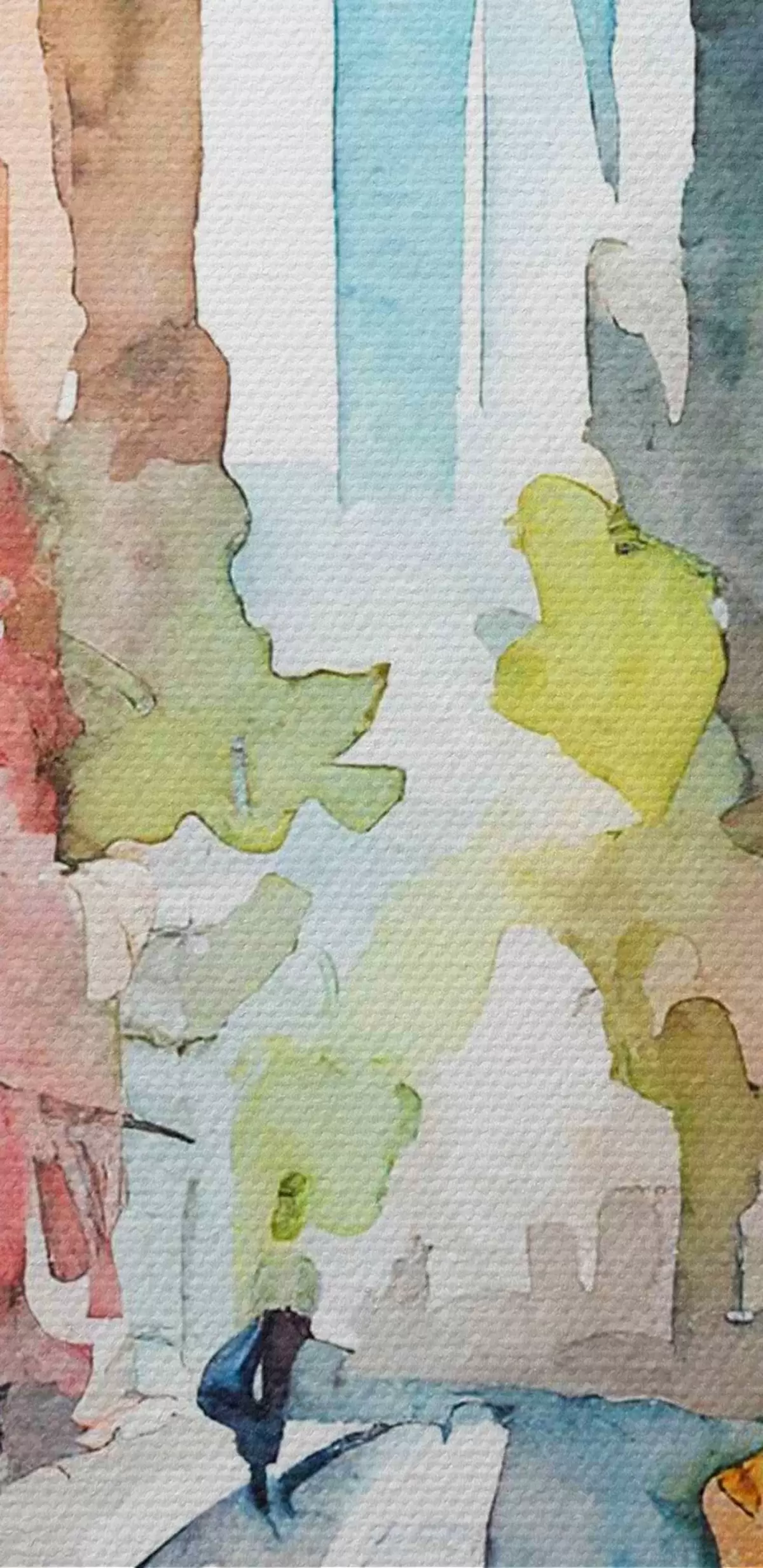 Nuotrauka Akvarelė, vaizduojanti gatvę su pastatais ir aukštu bokštu fone Nr r37346