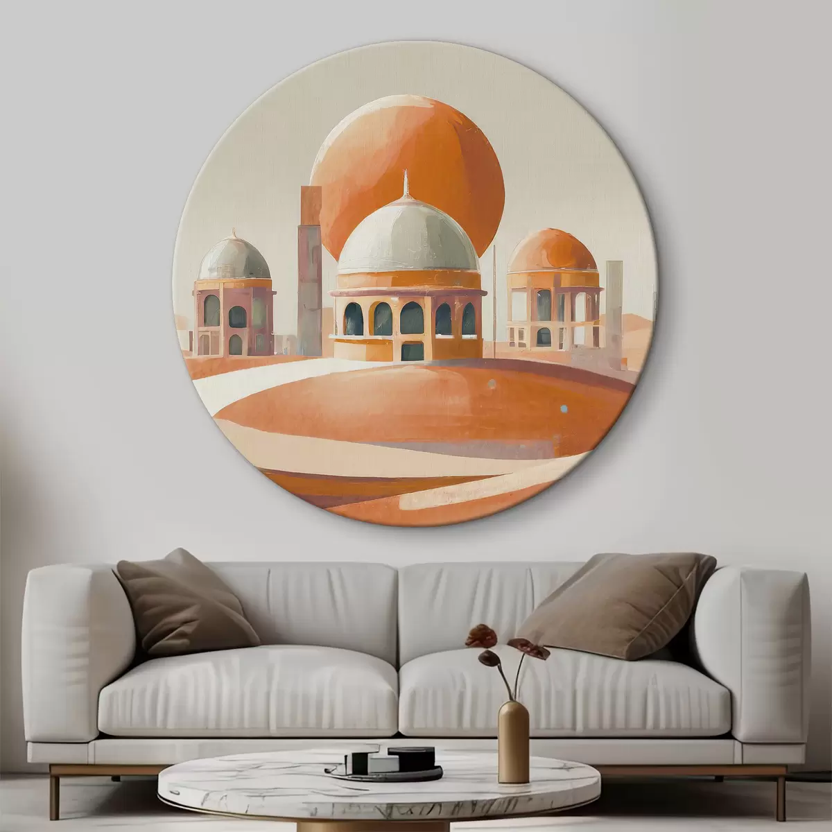 Nuotrauka Dykumos kraštovaizdis su pastatais ir dideliu oranžiniu kamuoliu Nr r37812