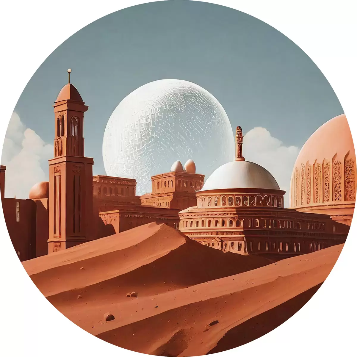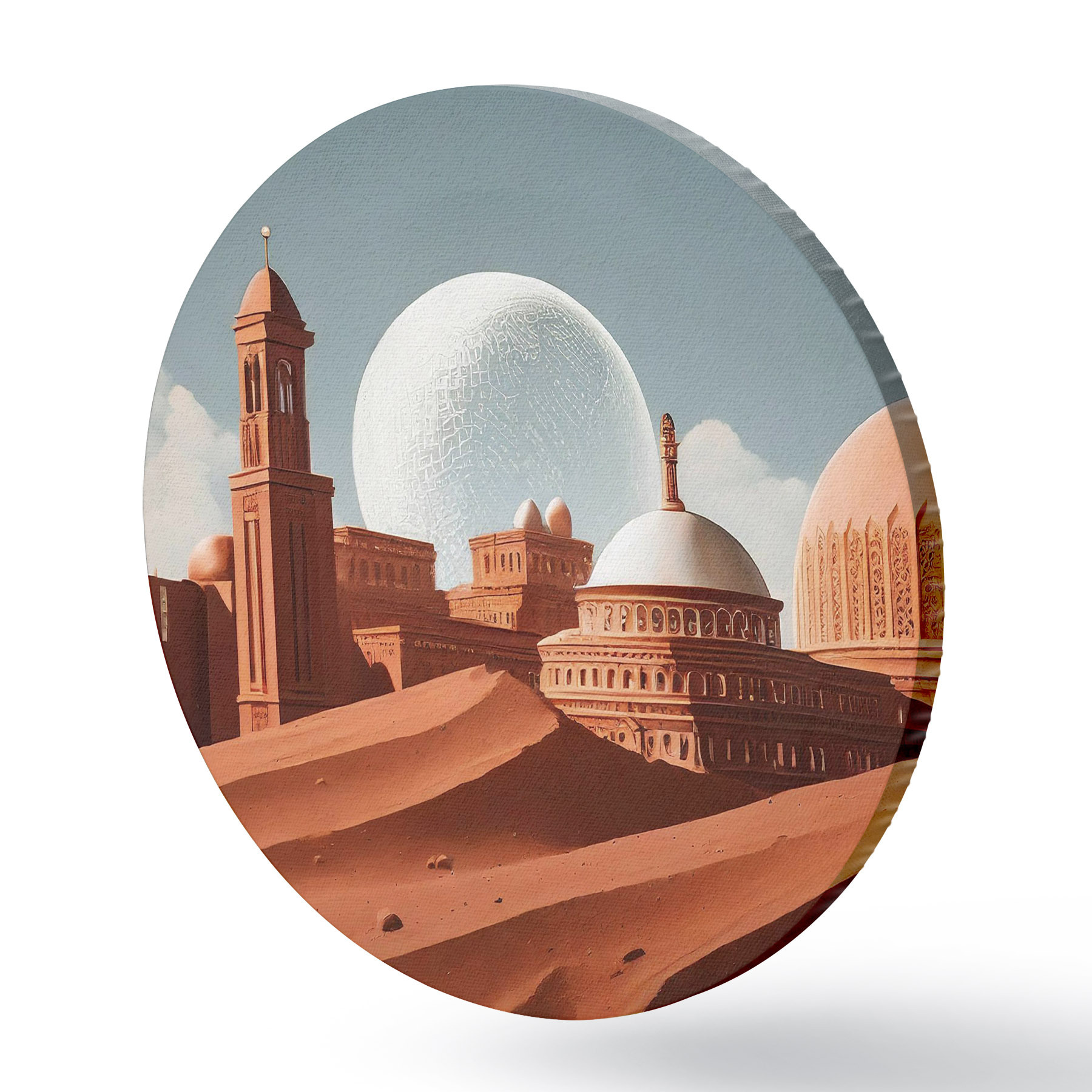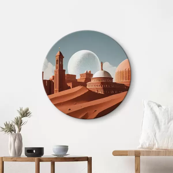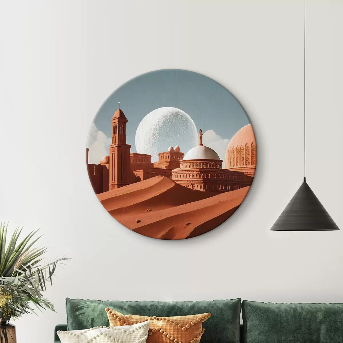 Nuotrauka Dykumos kraštovaizdis su pastatais ir dideliu baltu kamuoliu Nr r37814