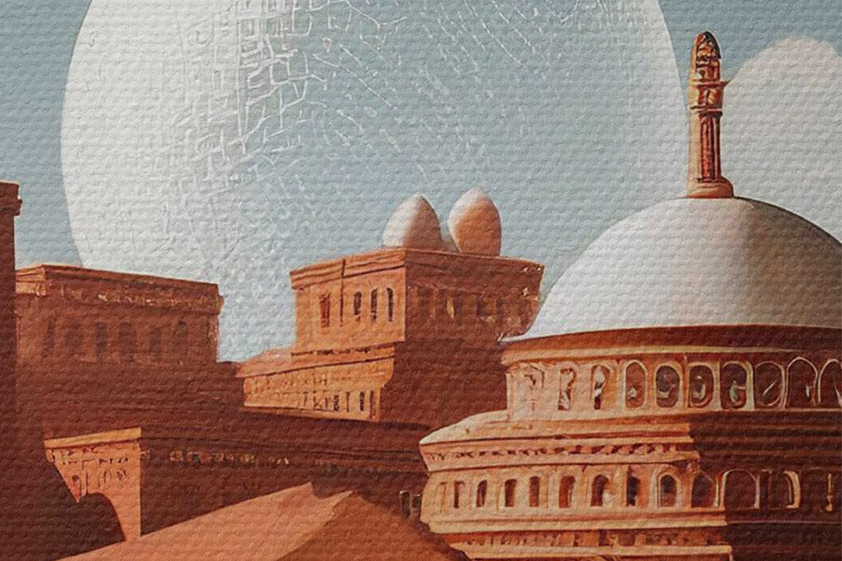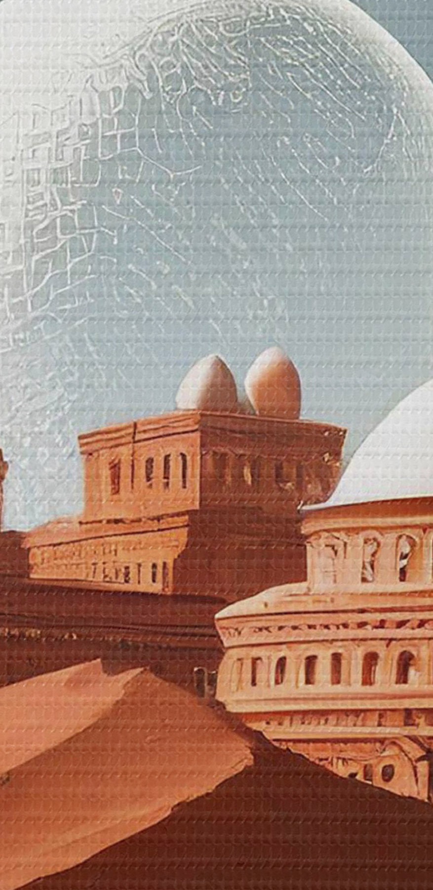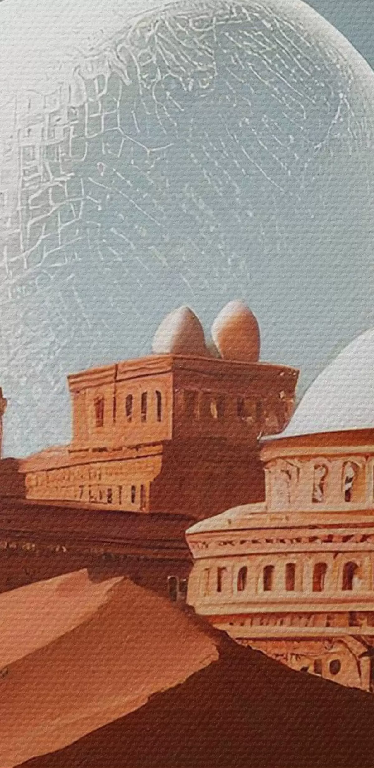 Nuotrauka Dykumos kraštovaizdis su pastatais ir dideliu baltu kamuoliu Nr r37814