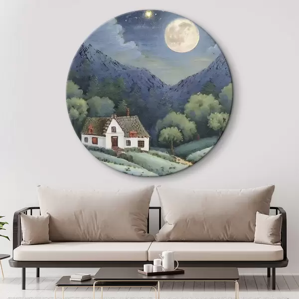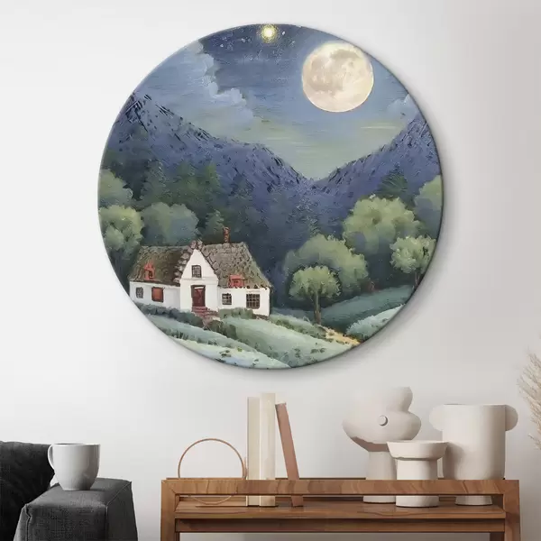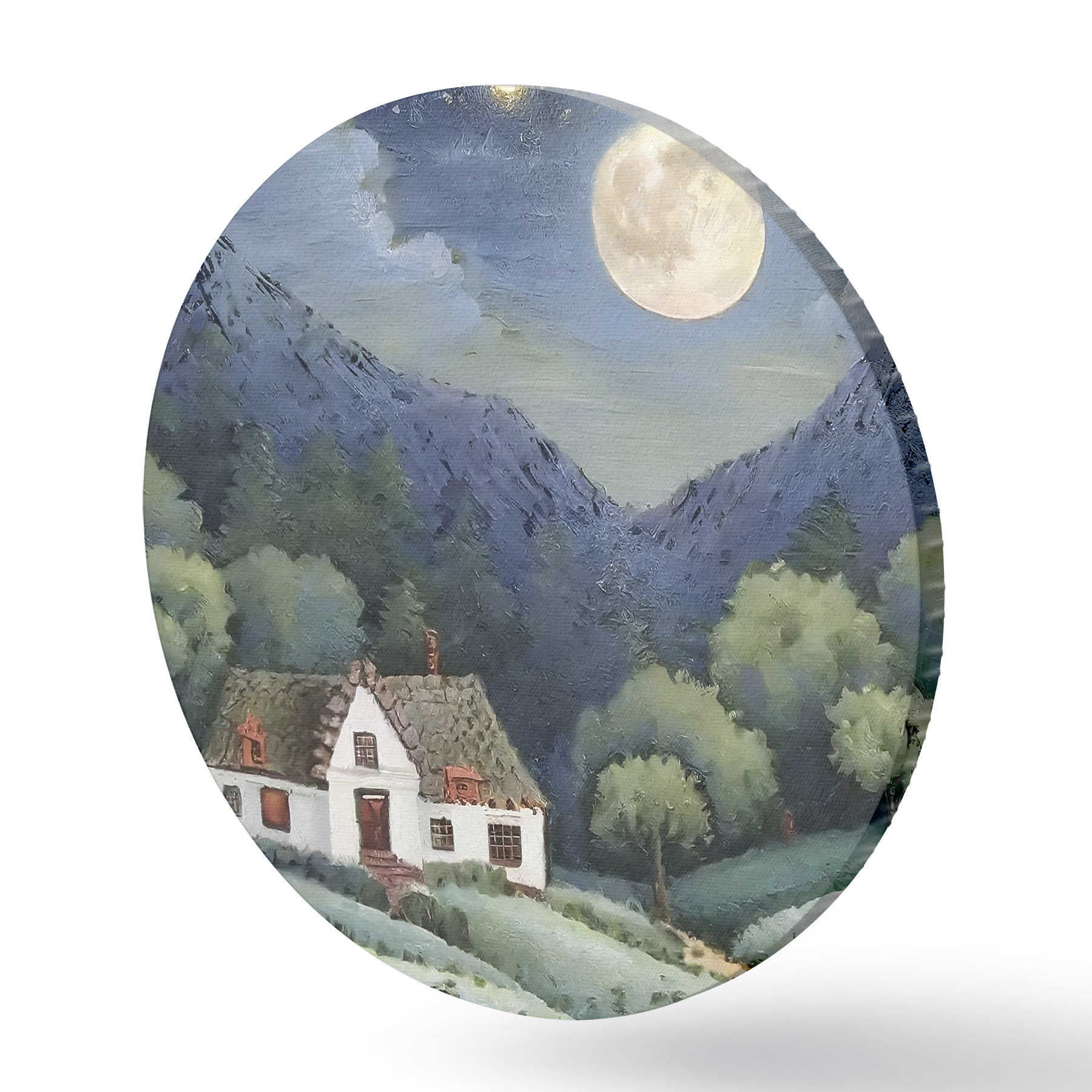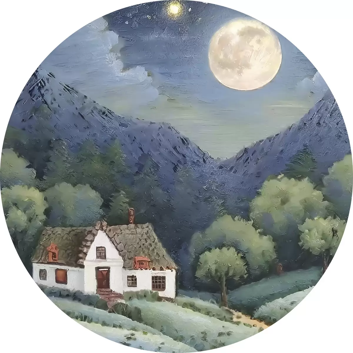 Nuotrauka Sodas su gėlėmis, kaimo namas, kalnai, naktinis dangus, tapyba aliejiniais dažais, potėpiai teptuku Nr r37821