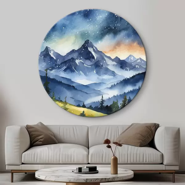 Nuotrauka Akvarelė kalnų kraštovaizdis, miškas, žvaigždėtas nakties dangus, saulėlydžio spalvos Nr r37946
