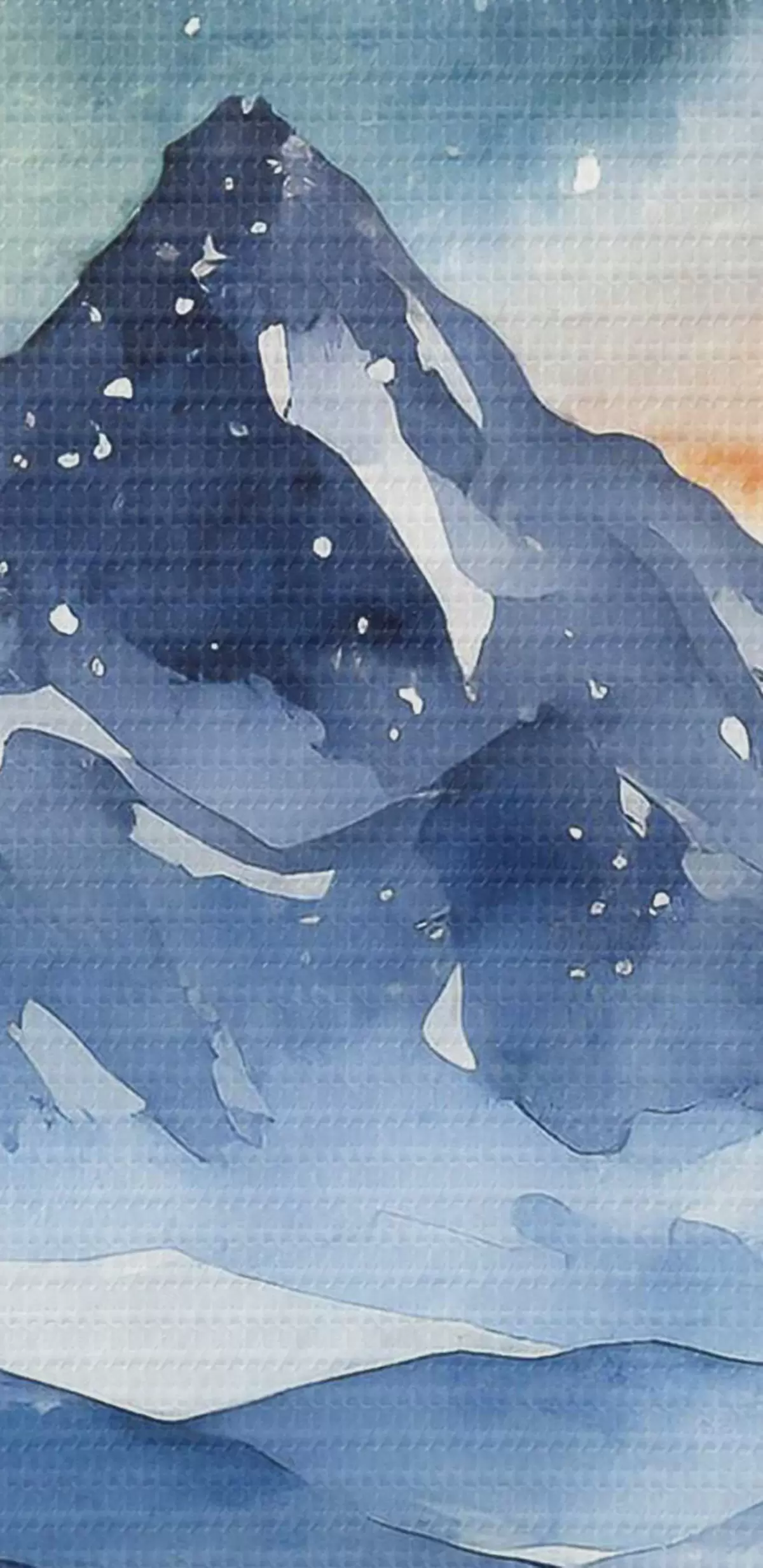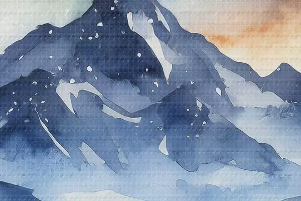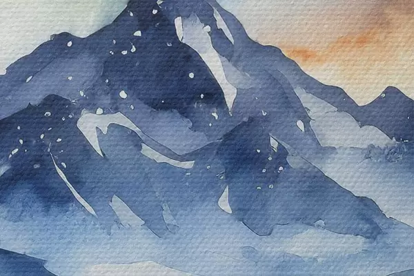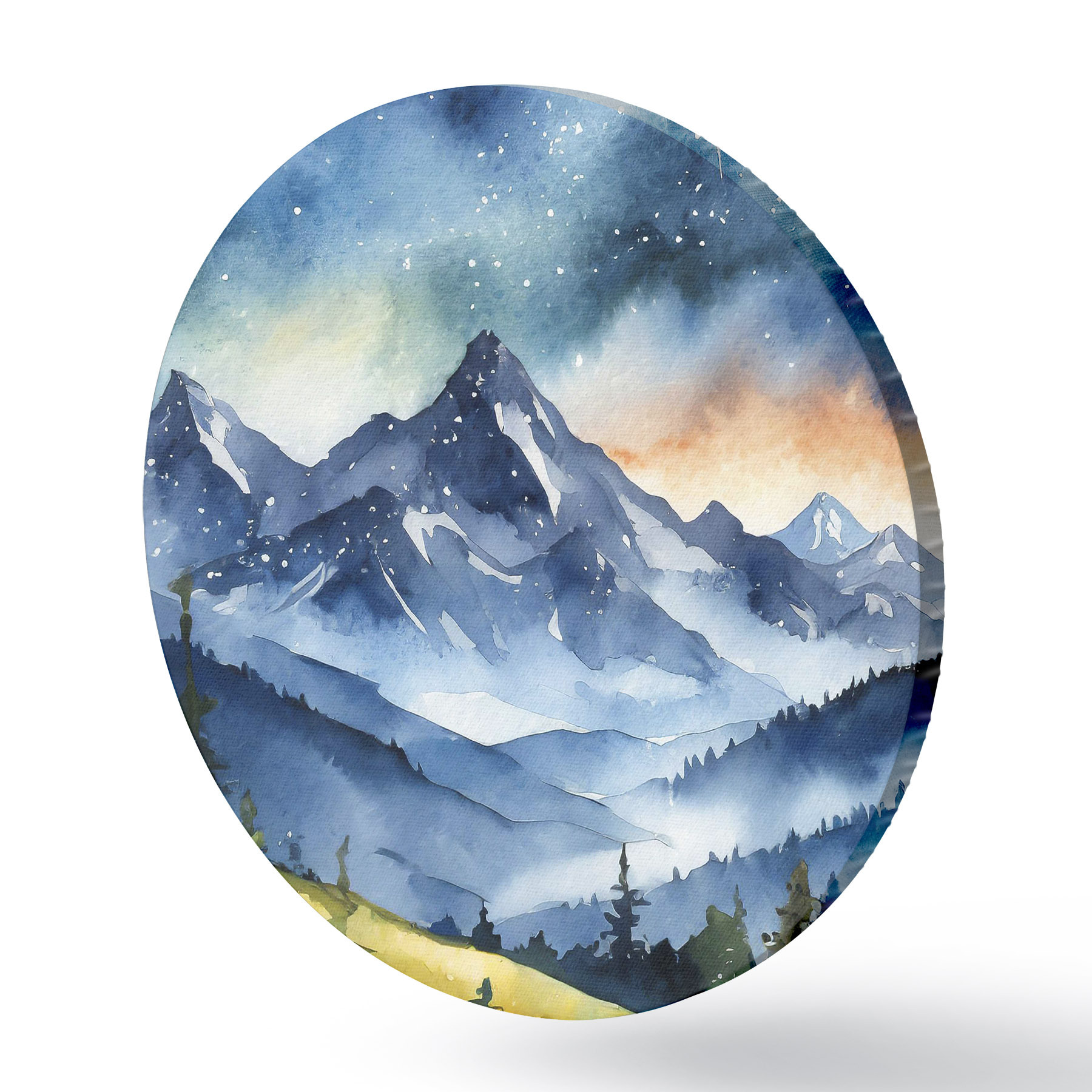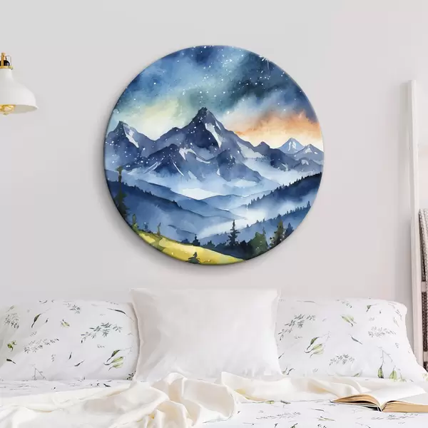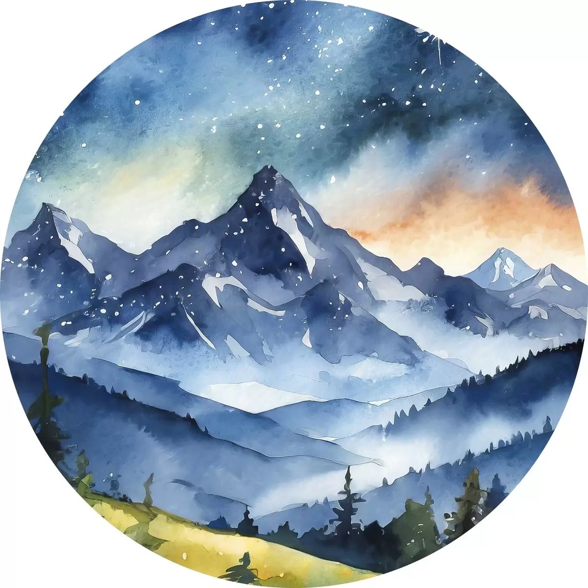 Nuotrauka Akvarelė kalnų kraštovaizdis, miškas, žvaigždėtas nakties dangus, saulėlydžio spalvos Nr r37946