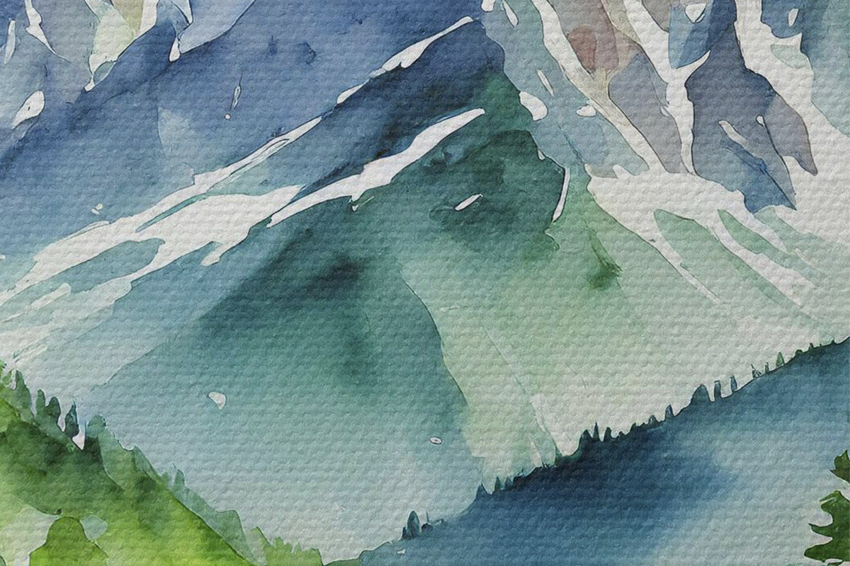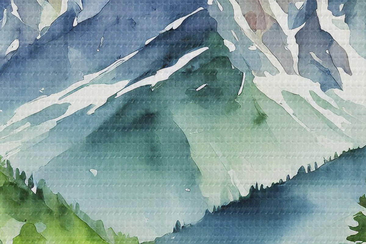 Nuotrauka Kalnų kraštovaizdis su upe, vasara, žaluma, miškas, akvarelė, saulėlydis Nr r37960