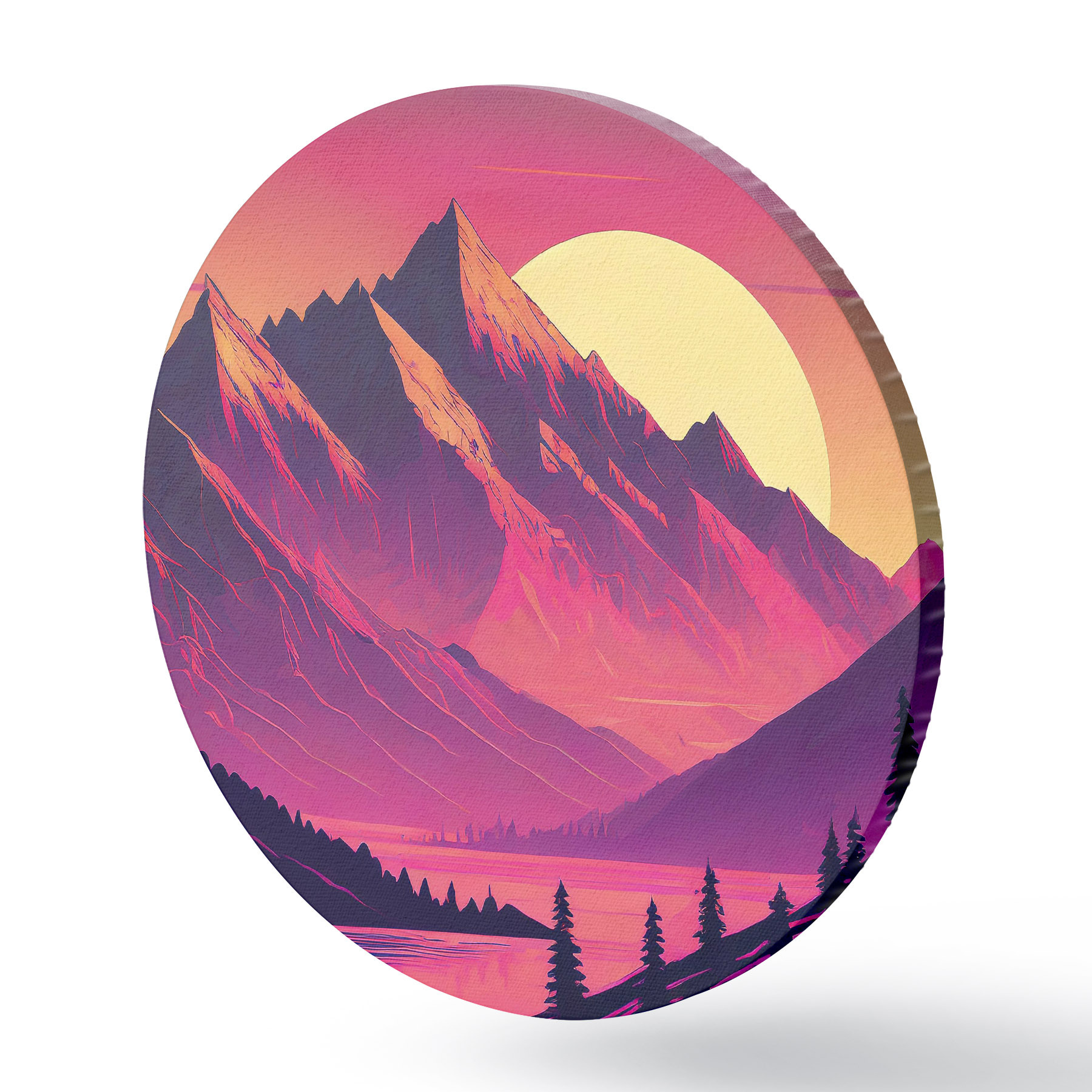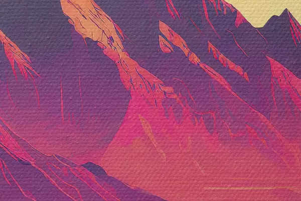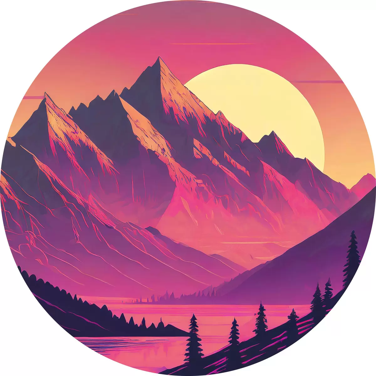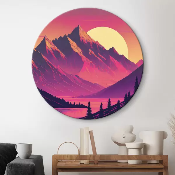 Nuotrauka Abstraktus kalnų kraštovaizdis, ryškios spalvos, rožinė, saulėlydžio dangus, futuristinis, saulė, miškas Nr r38000