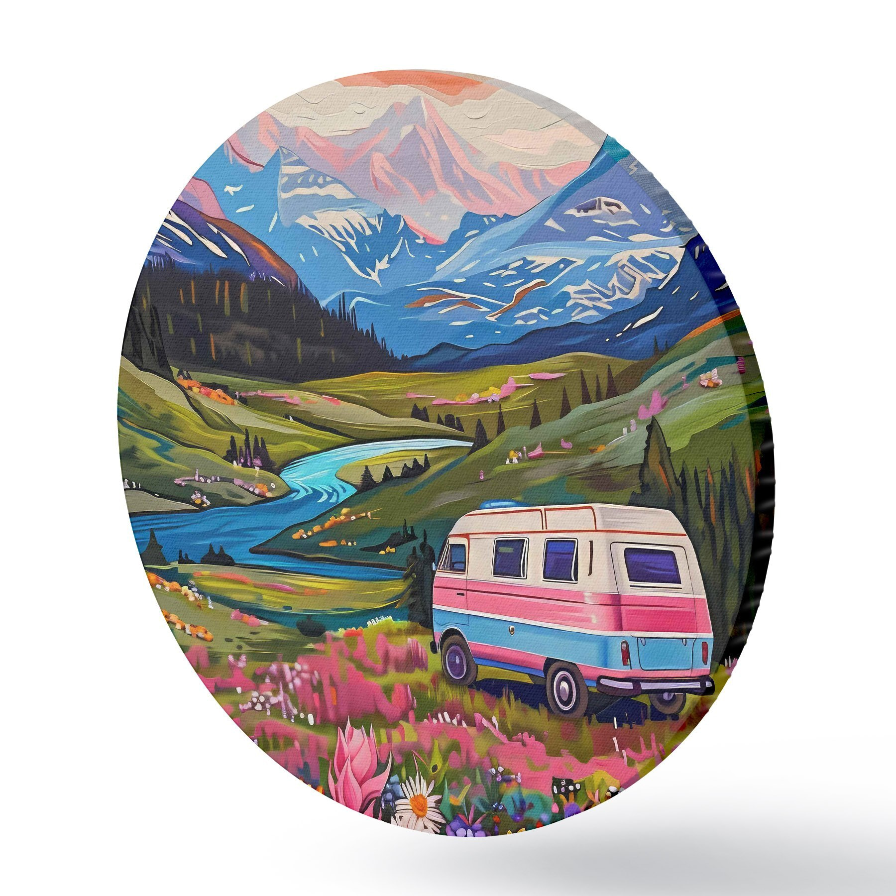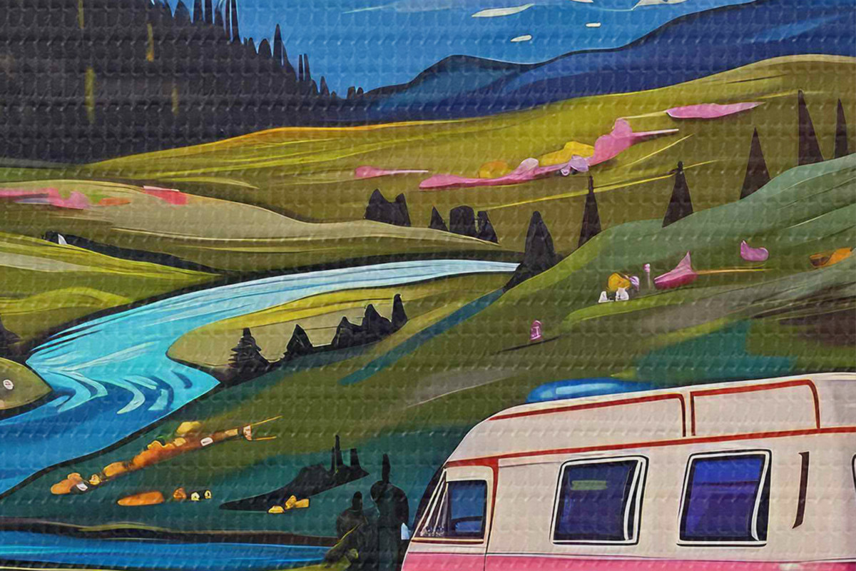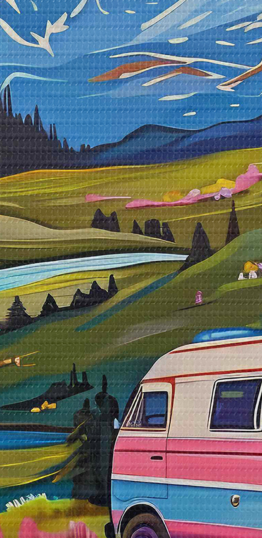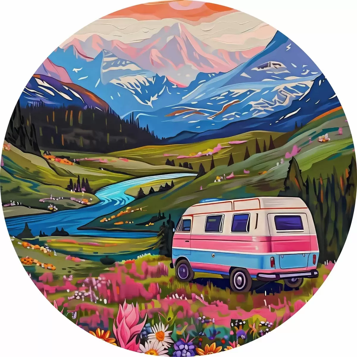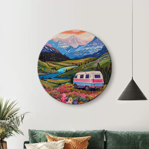 Nuotrauka Furgonas, važiuojantis per slėnį su gėlėmis ir kalnais Nr r38259