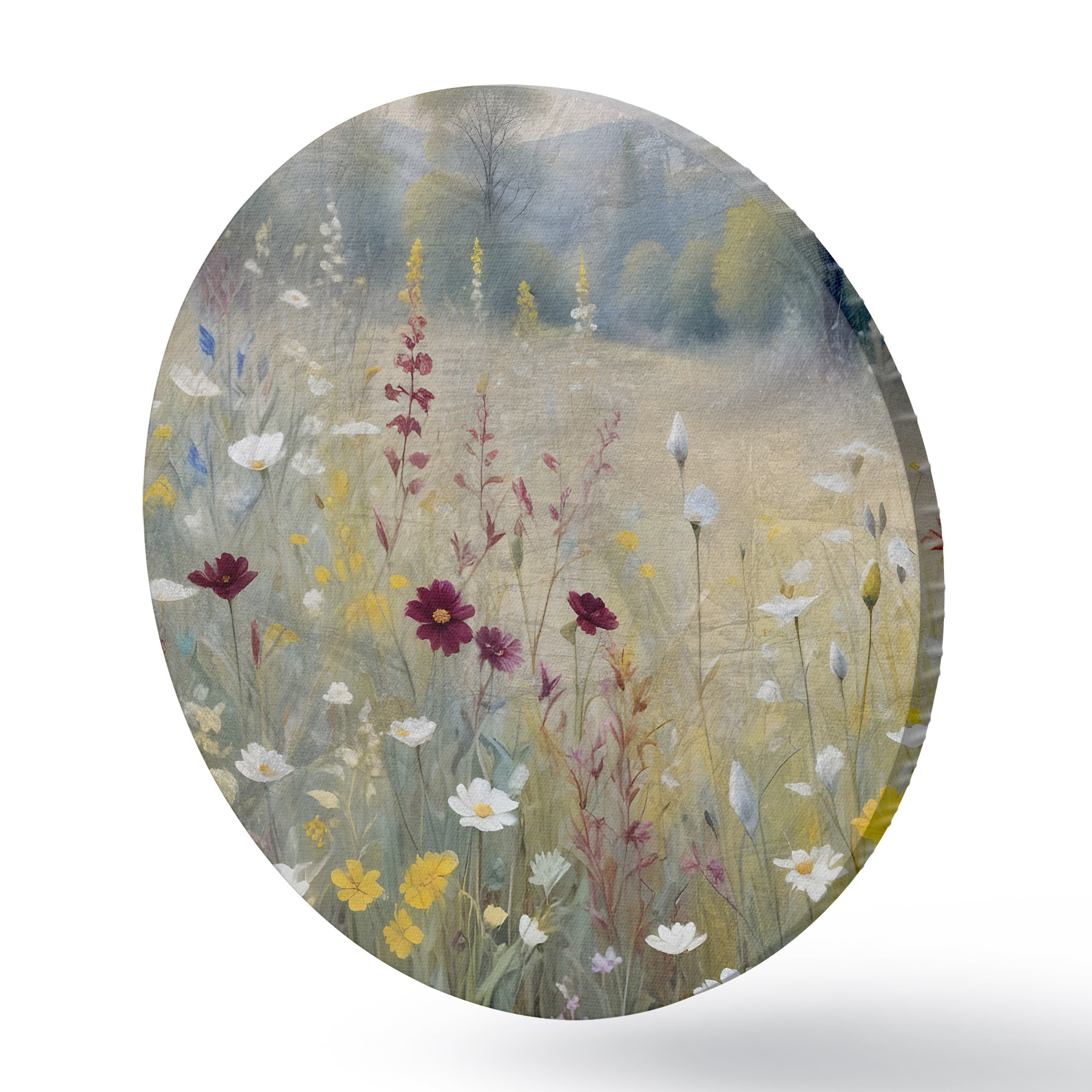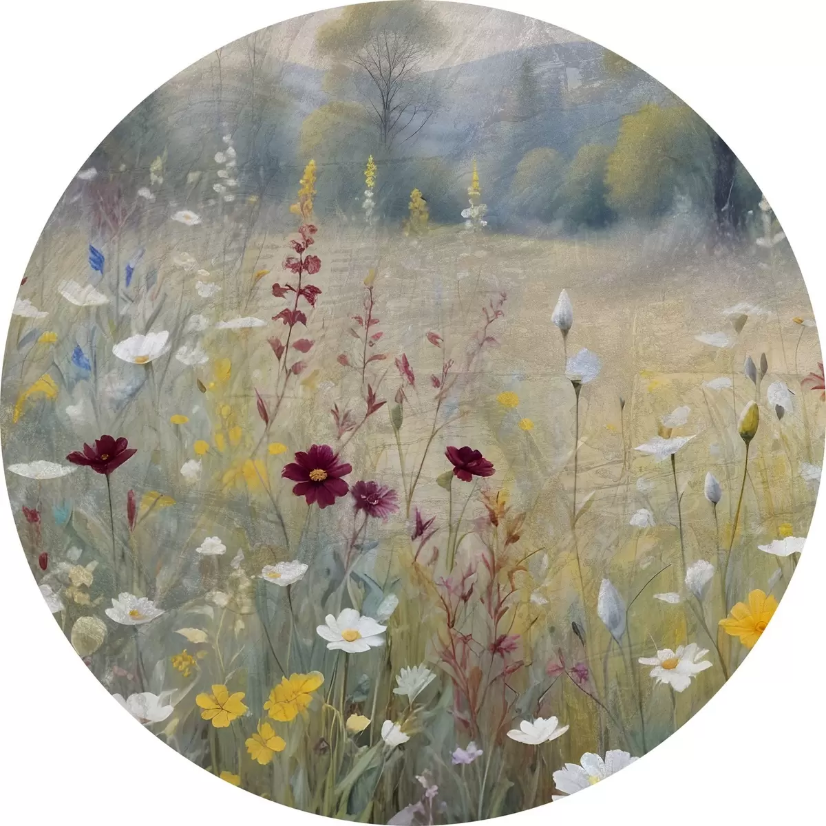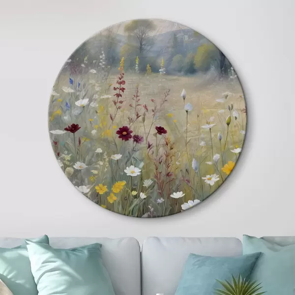 Apvalūs paveikslai Spalvinga pieva su lauko gėlėmis su neryškiu mišku fone r38368