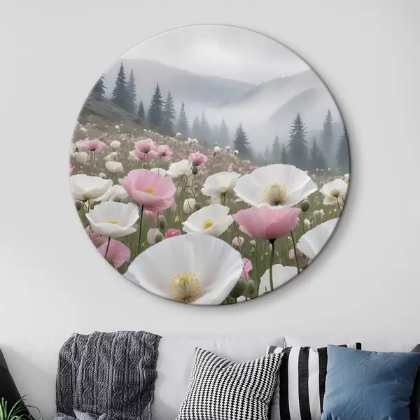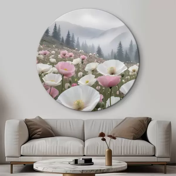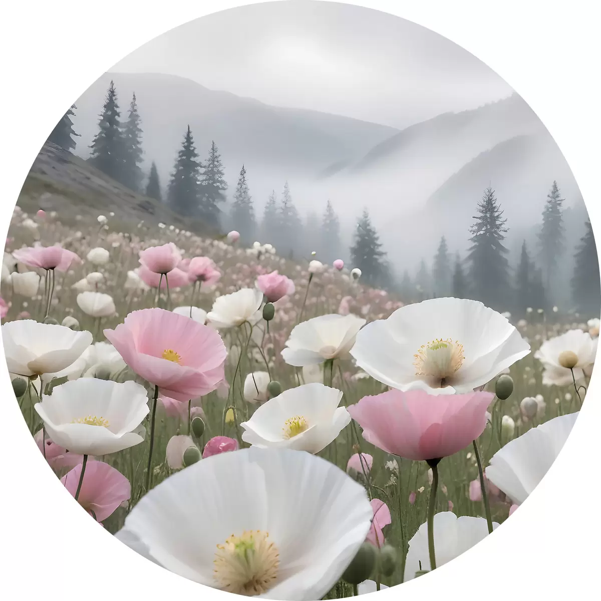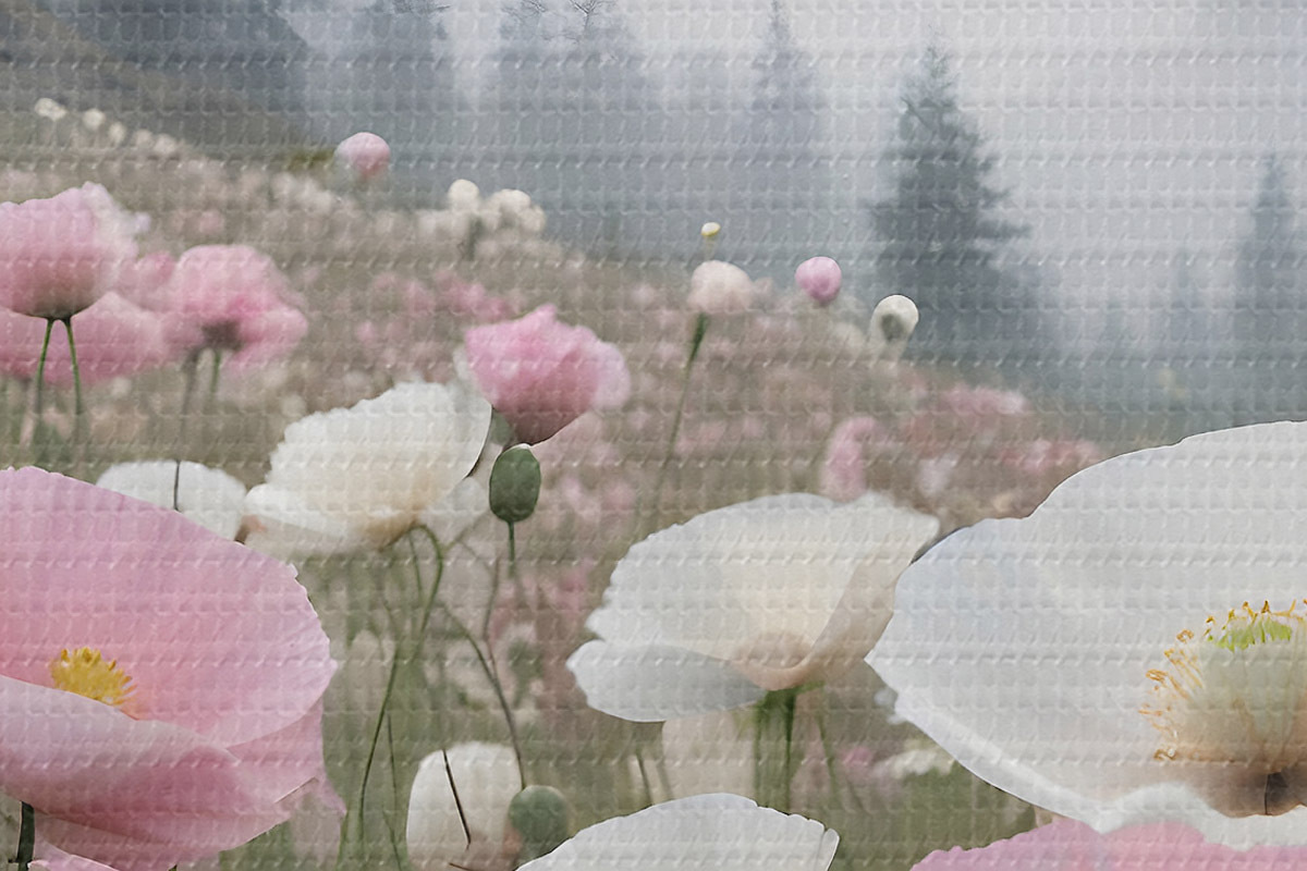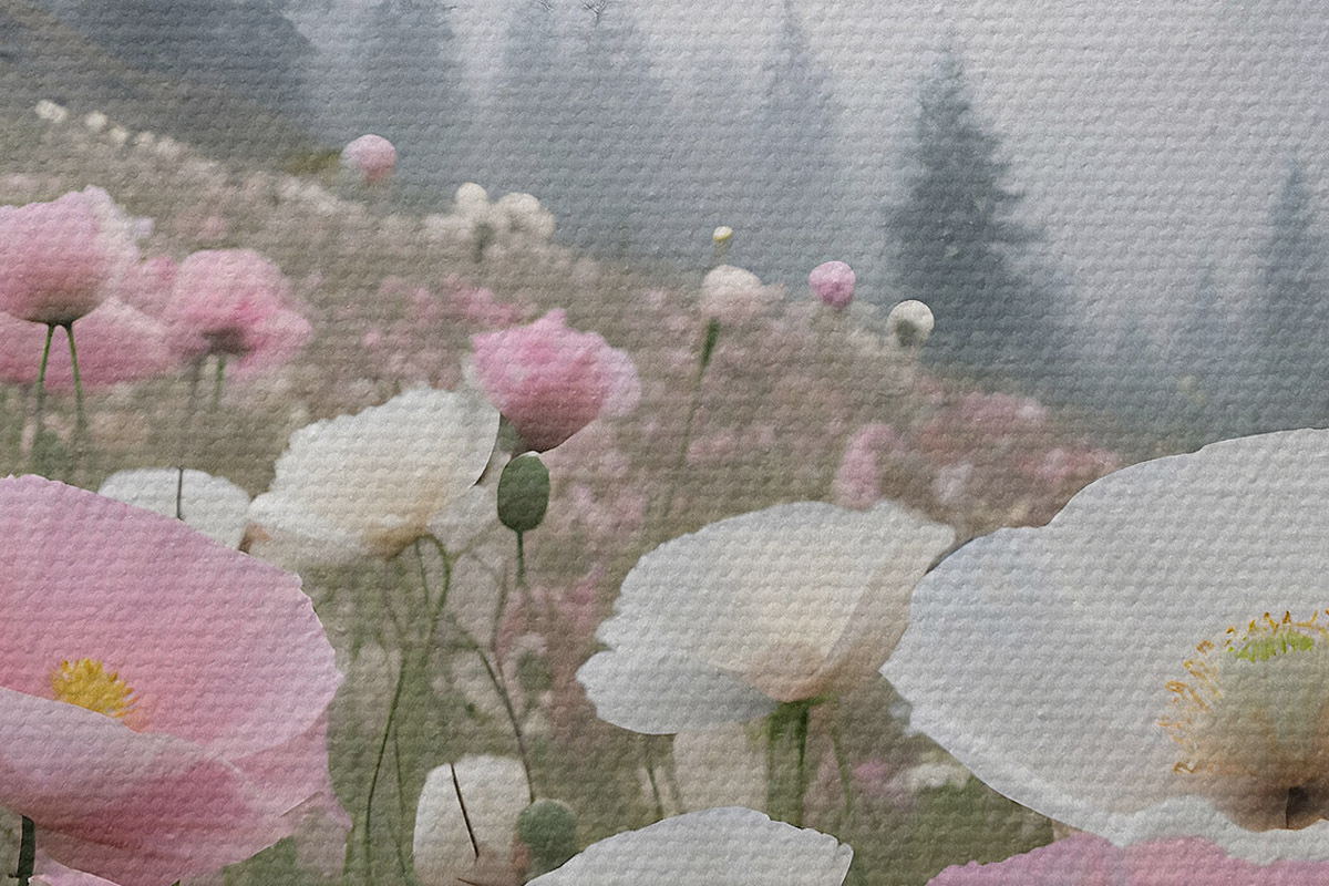 Nuotrauka Rožinių ir baltų aguonų laukas kalnų peizaže fone Nr r38369