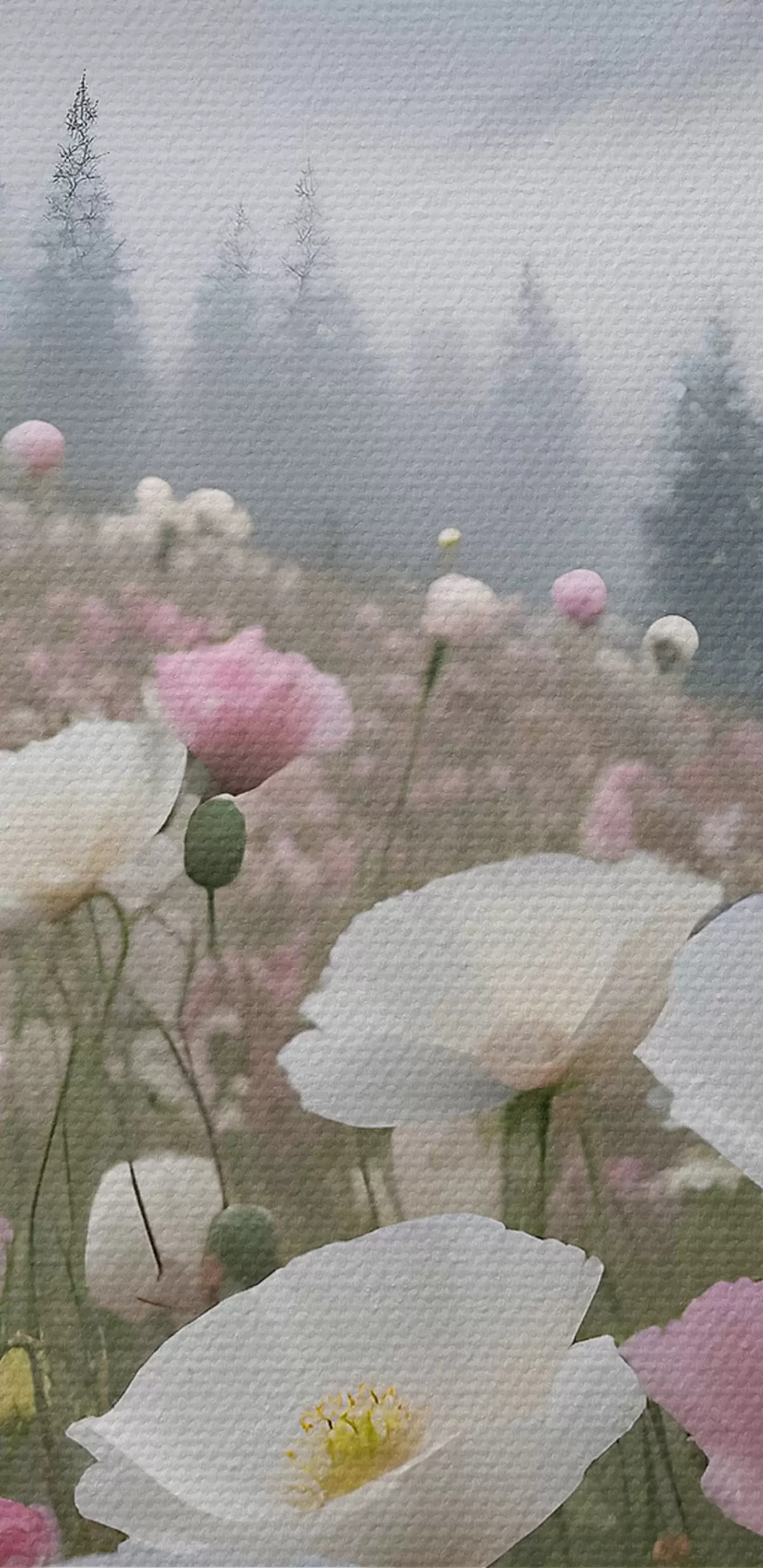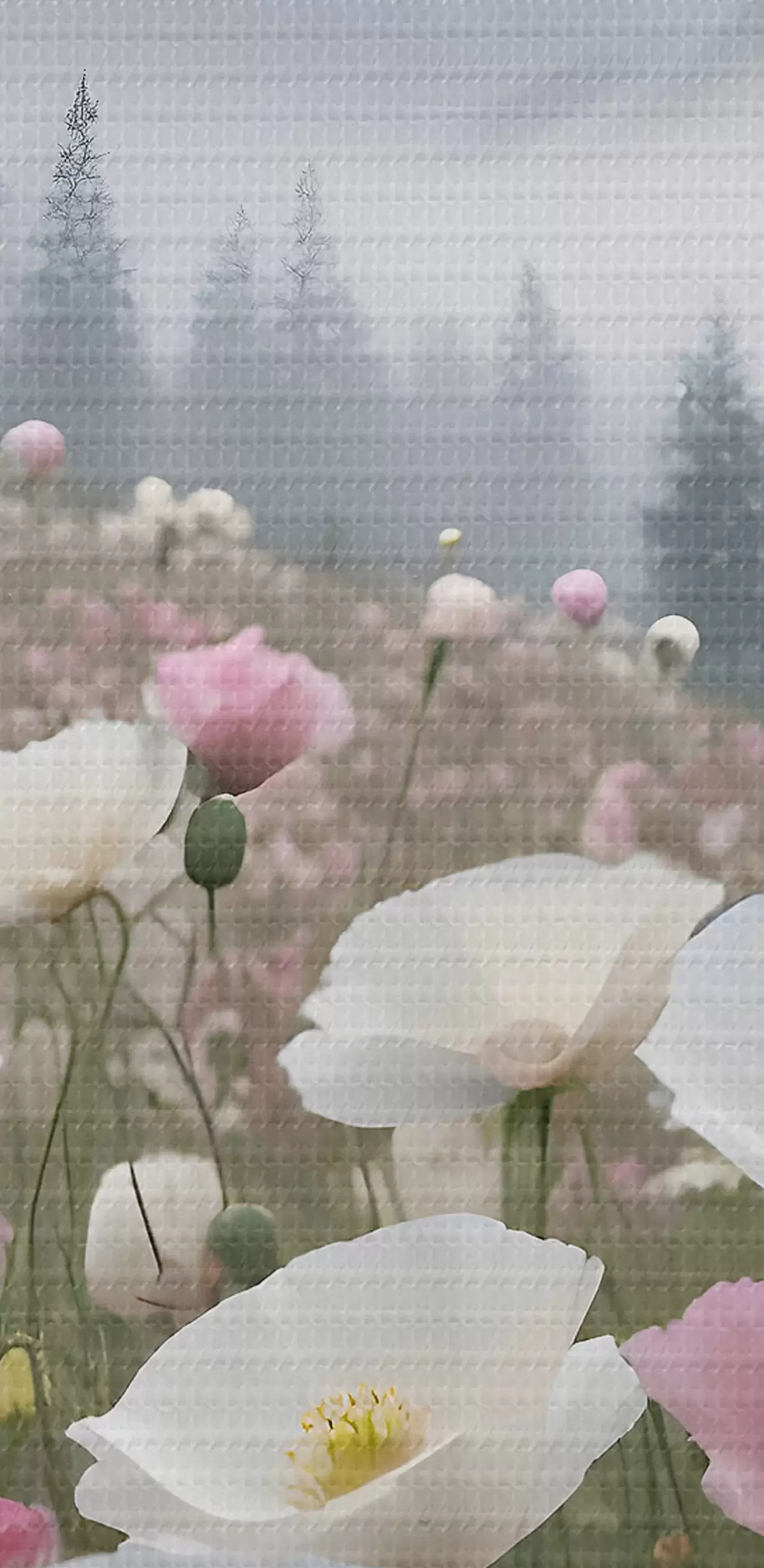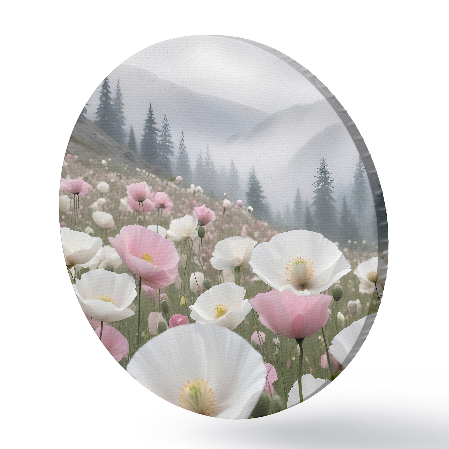 Nuotrauka Rožinių ir baltų aguonų laukas kalnų peizaže fone Nr r38369