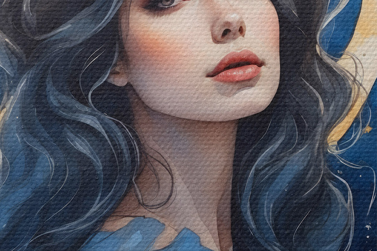 Nuotrauka Mergina mėlyna suknele mėnulio ir žvaigždžių fone Nr r38427