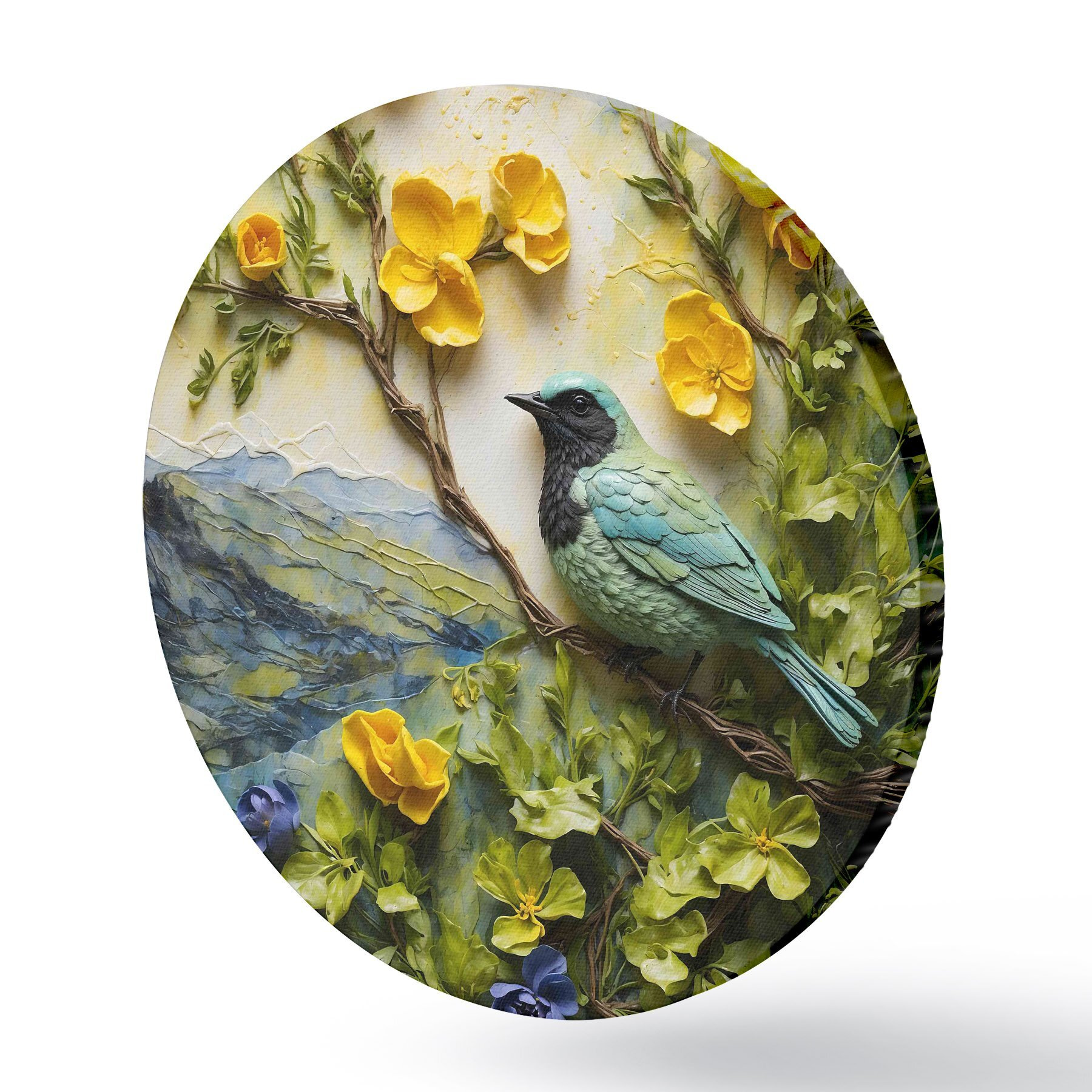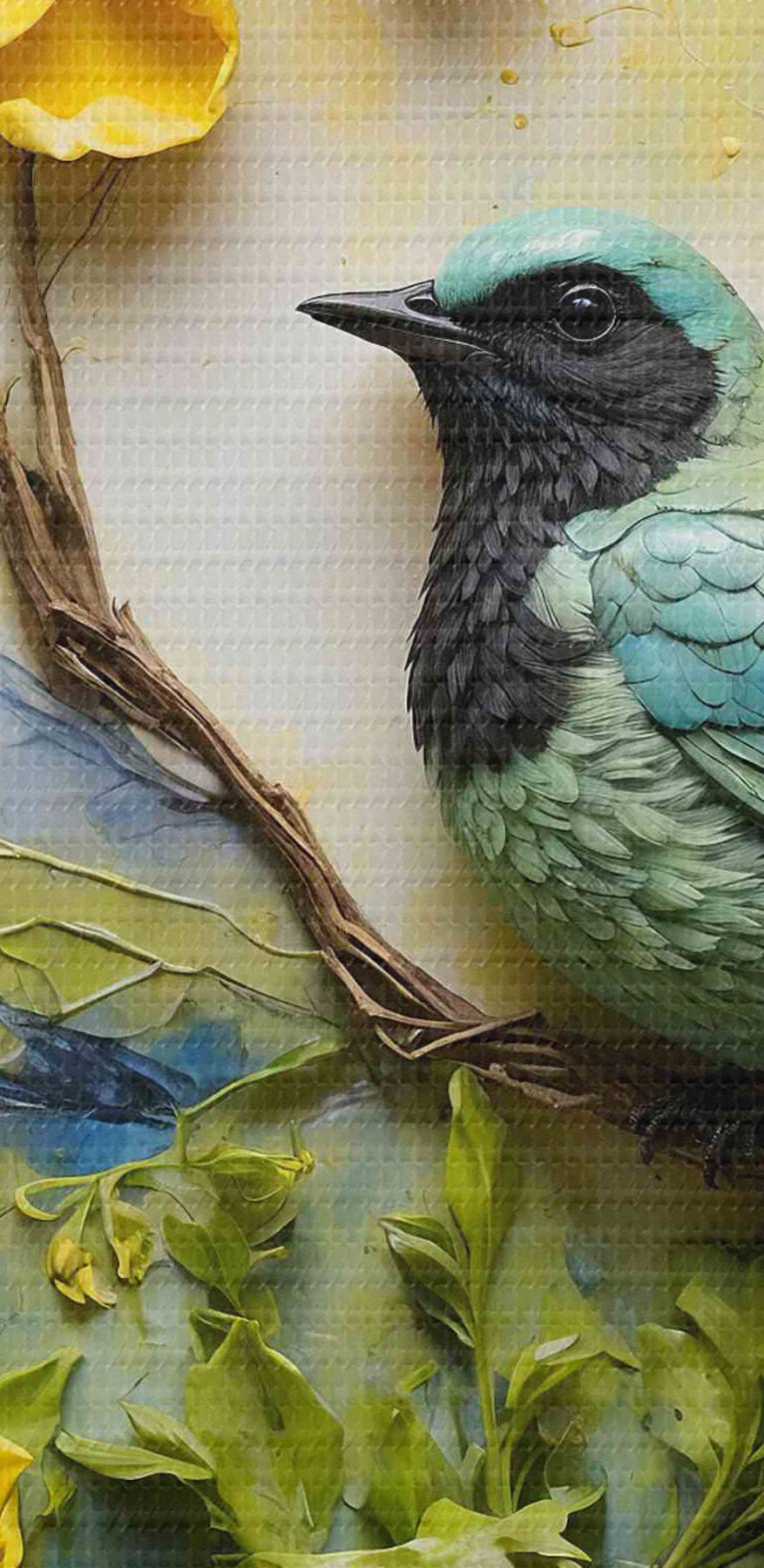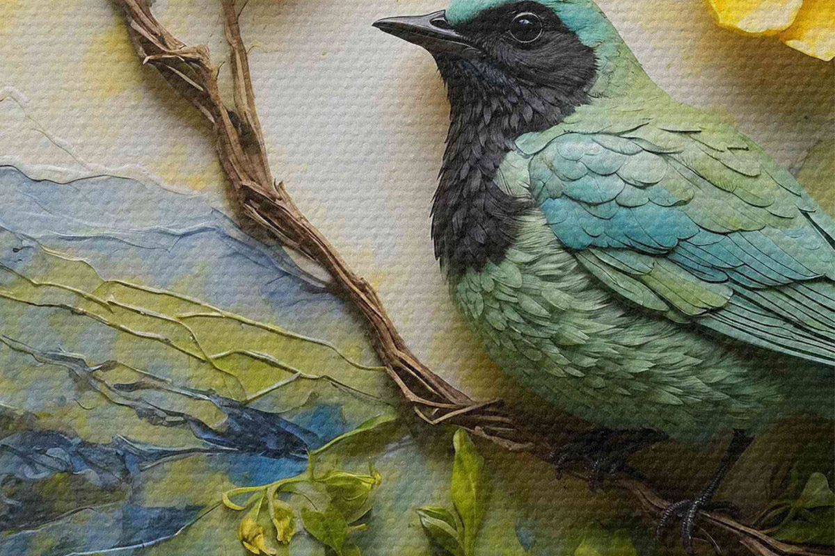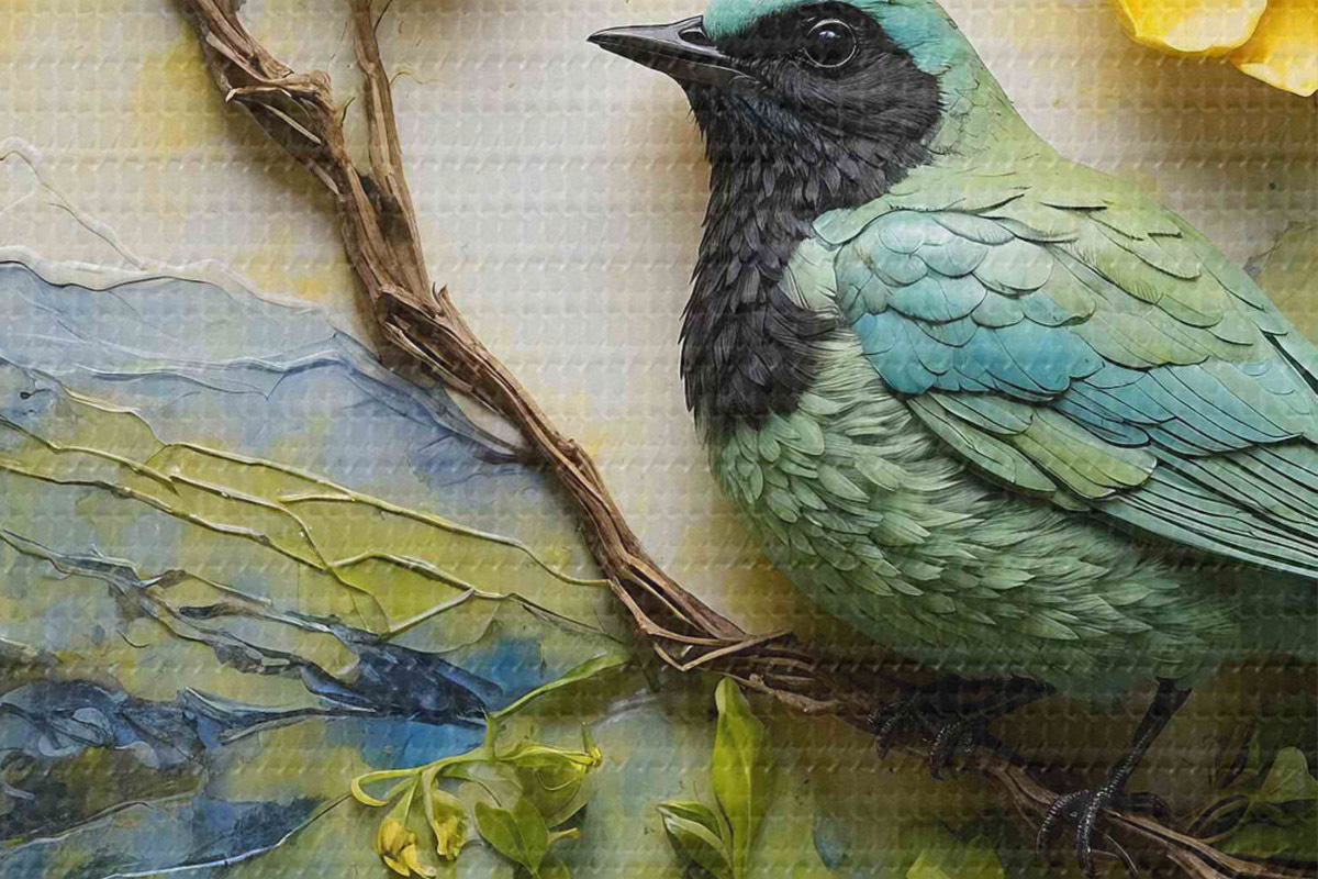 Nuotrauka Paukštis ant medžio šakos, apsuptas gėlių Nr r38431