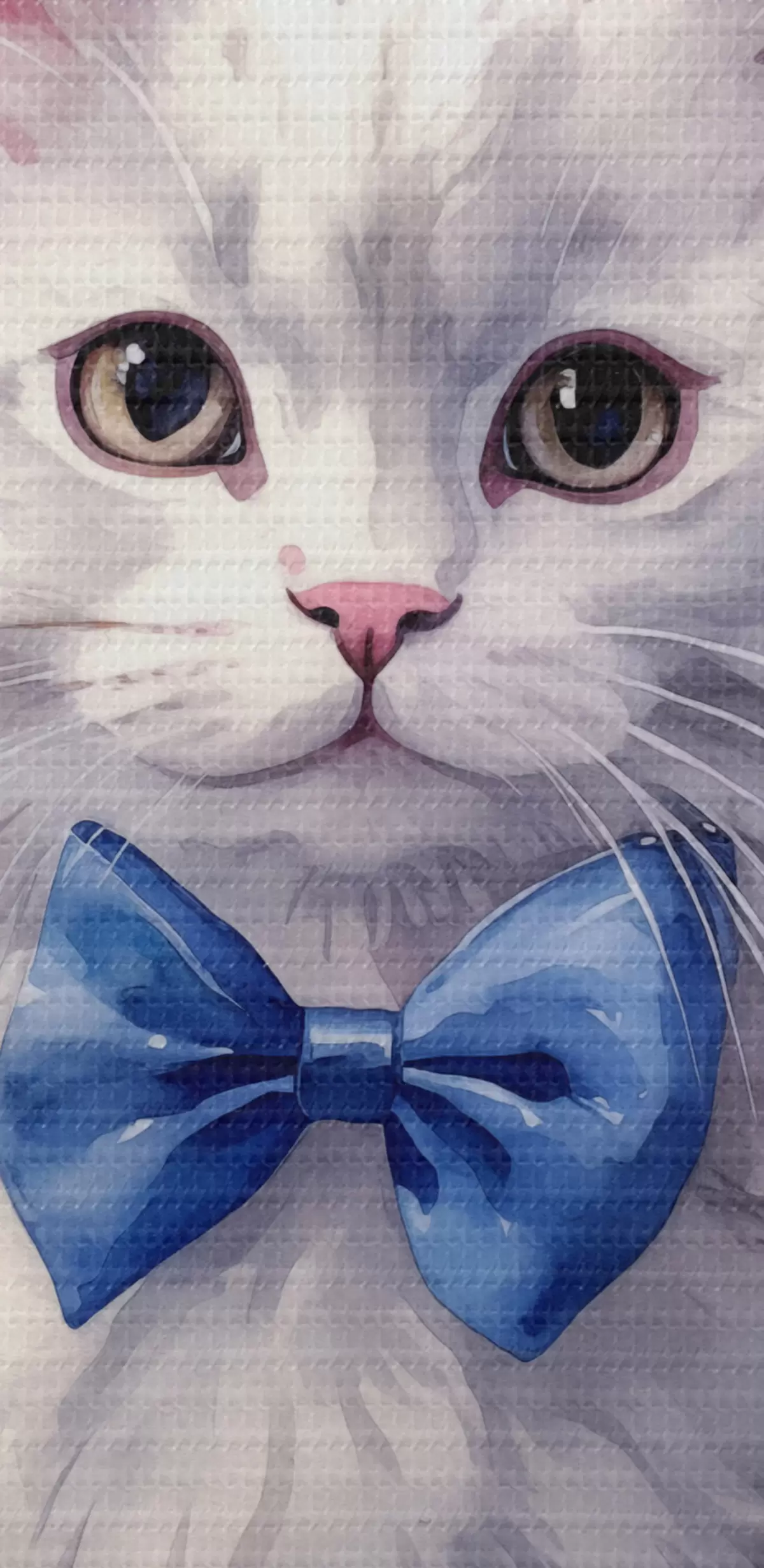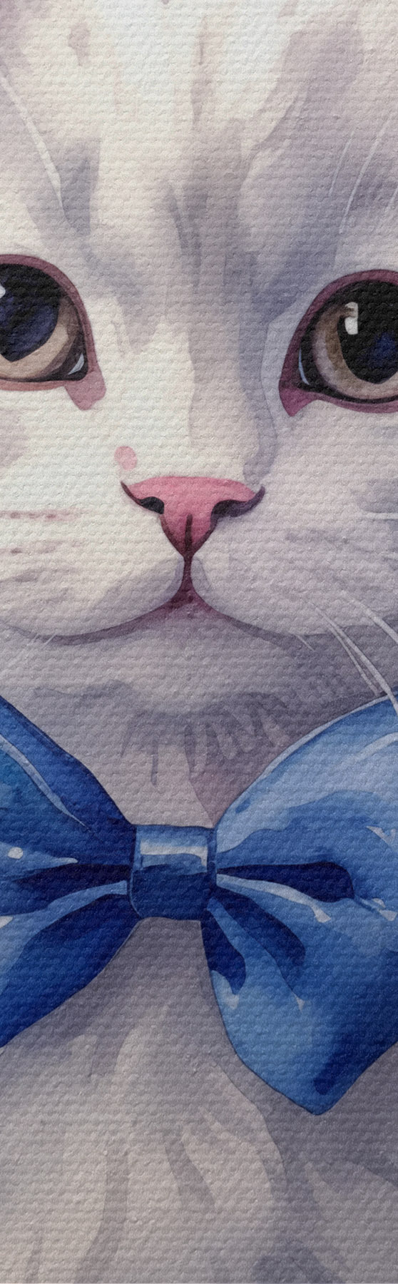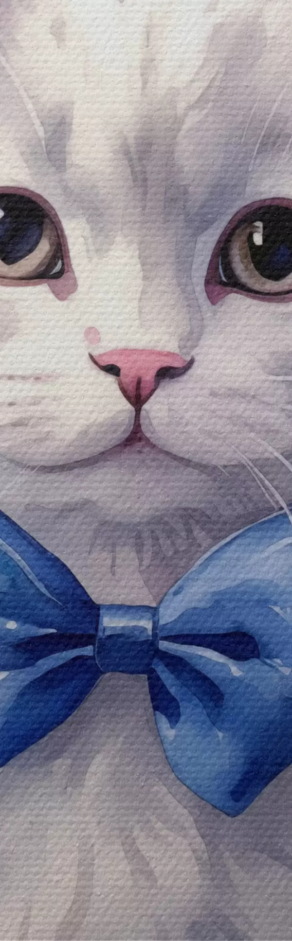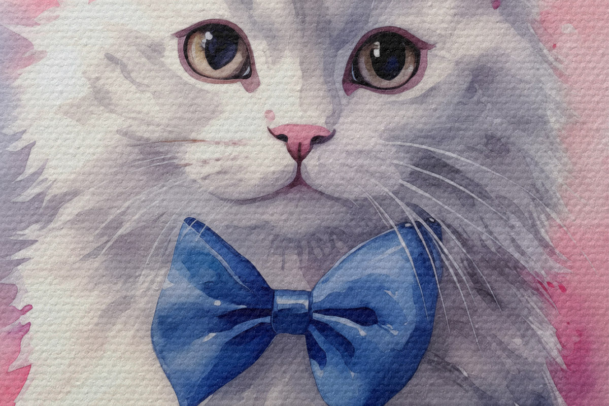 Nuotrauka Balta pūkuota katė su mėlynu lankeliu ant kaklo, akvarelė, gyvūnas, pilka, balta, rožinė, mėlyna spalva Nr r38479