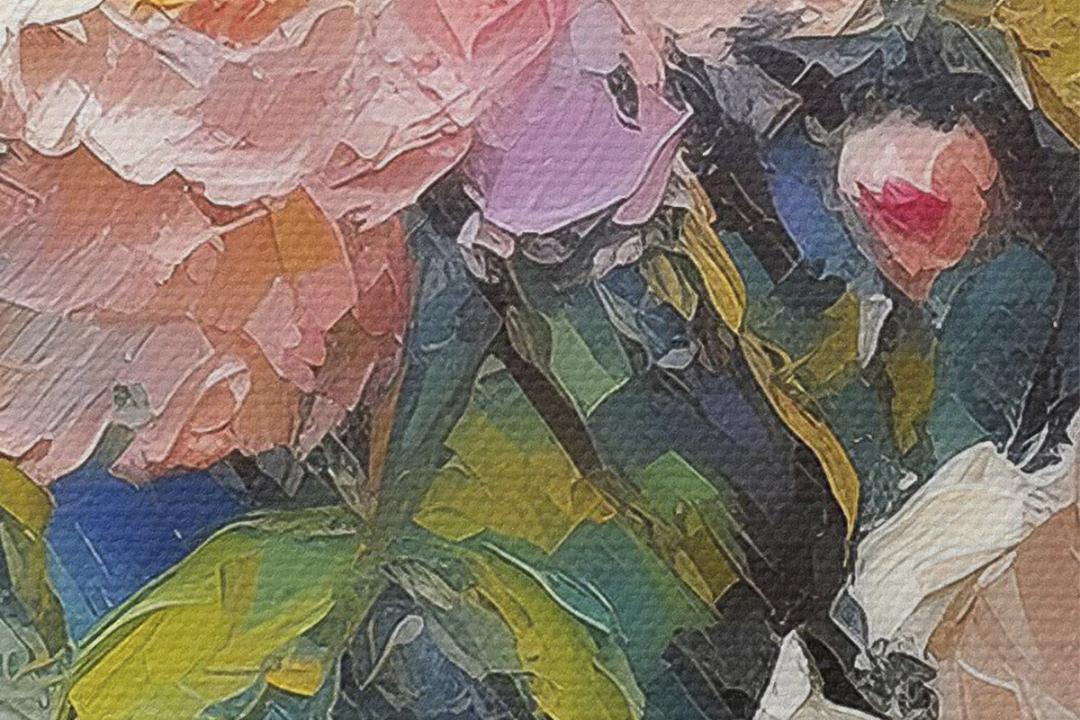 Nuotrauka Bijūnų aliejinė tapyba, vasaros gėlės, ryškūs teptuko potėpiai, rožinės gėlės, mėlynas fonas Nr r38497