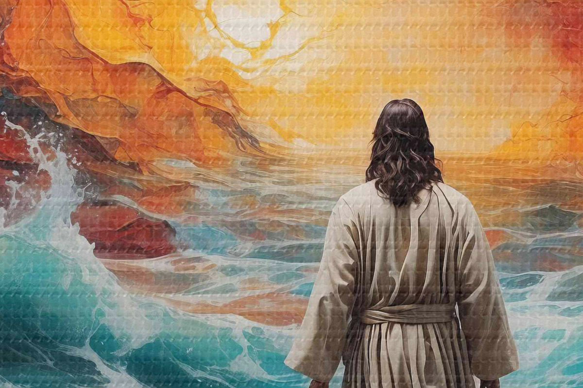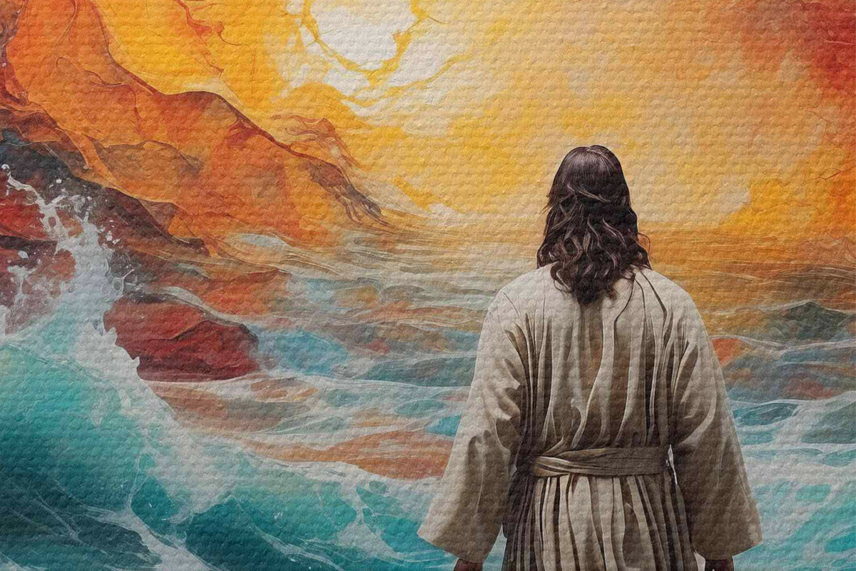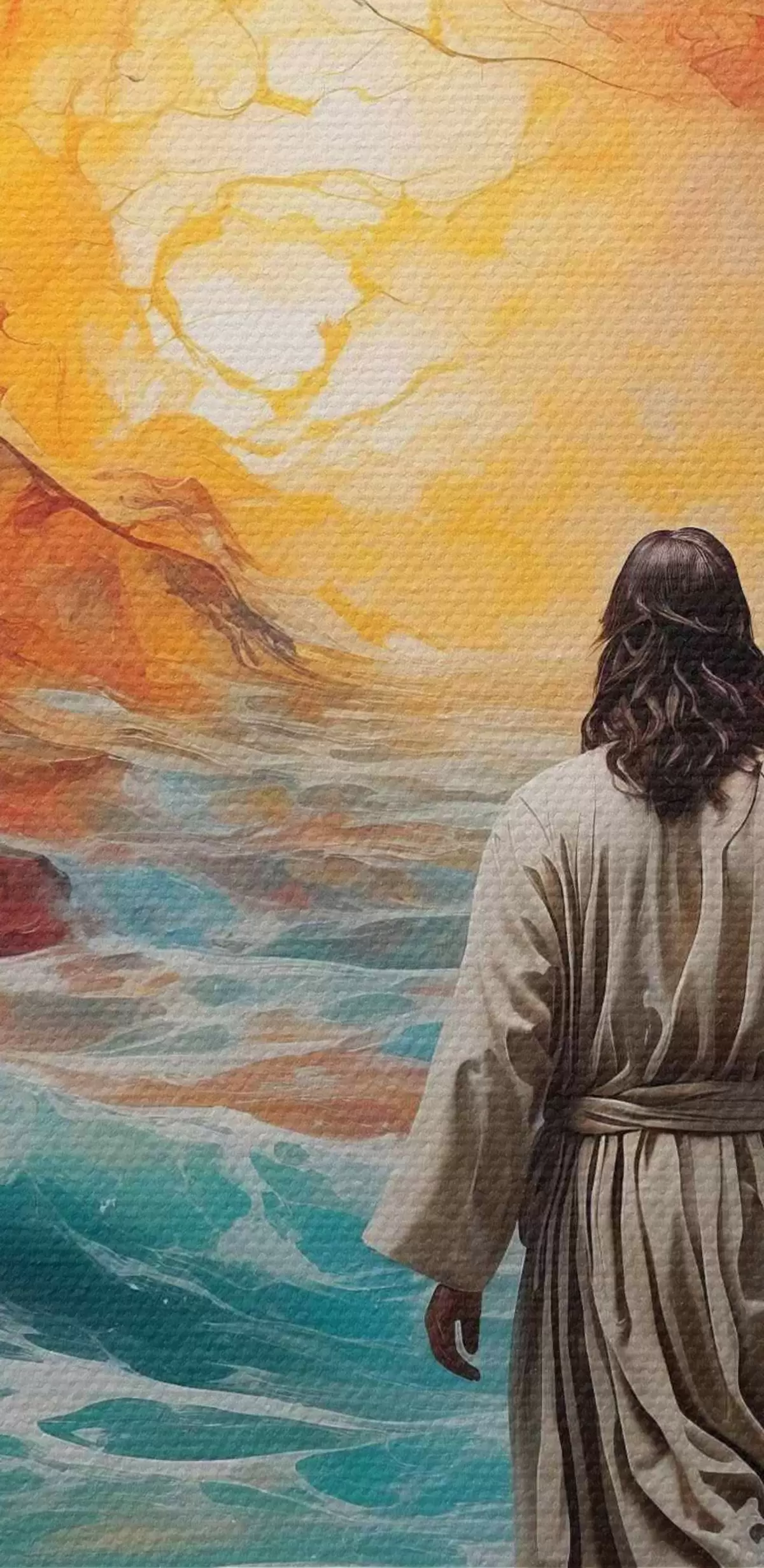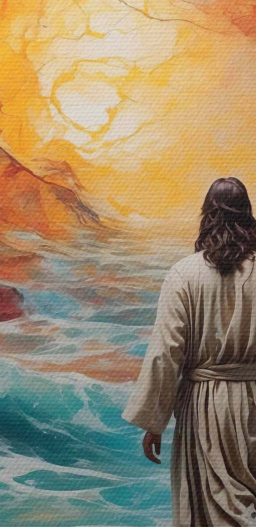 Nuotrauka Vyras vaikšto tarp ugninio dangaus ir jūros Nr r38612