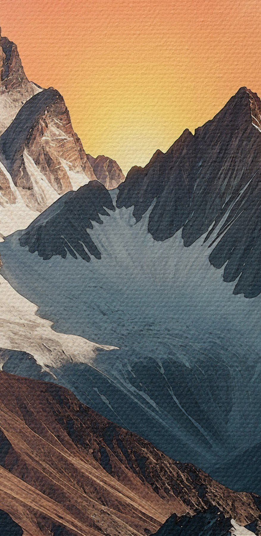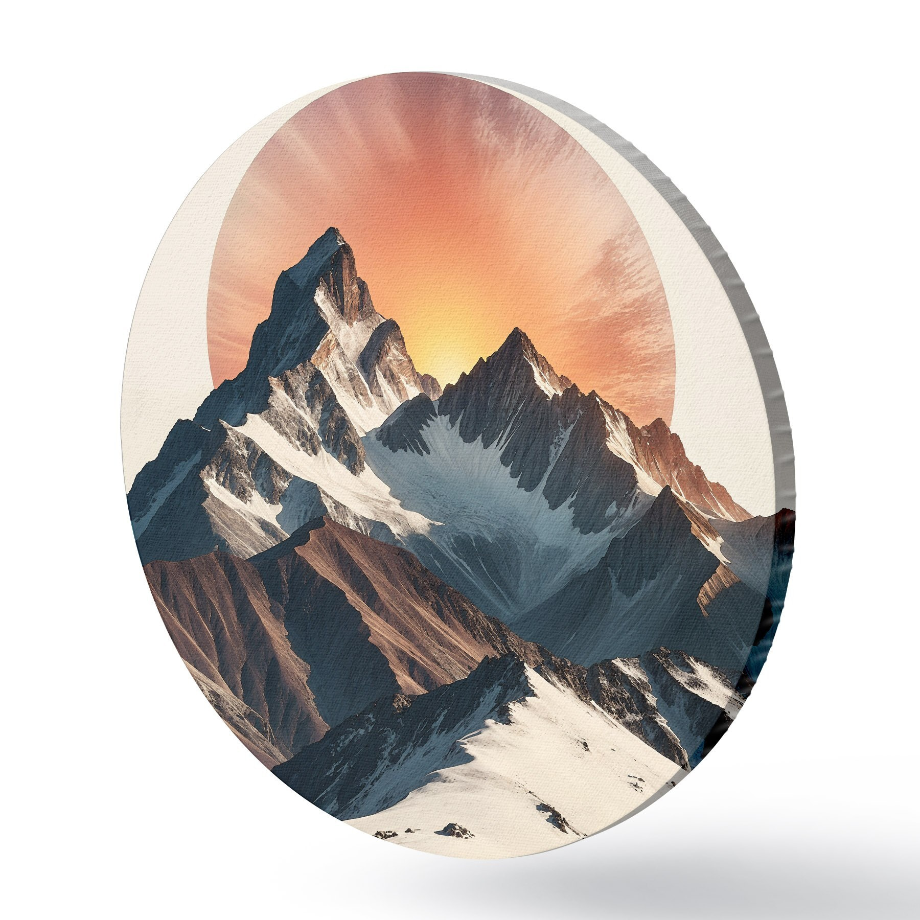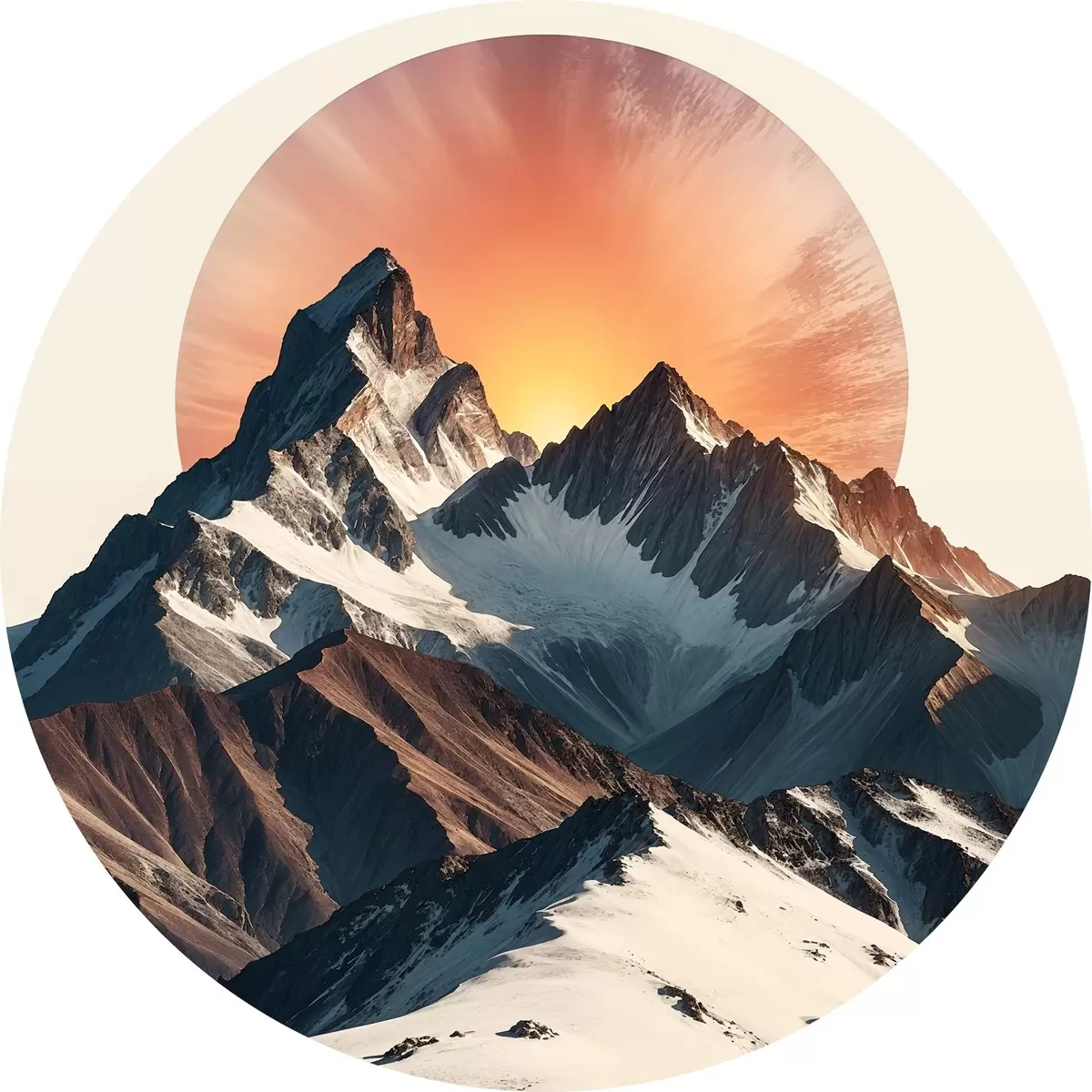 Nuotrauka Kalnų viršūnės ryškiame saulėlydžio danguje su didele saule fone Nr r38766