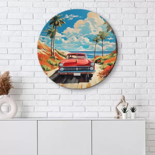 Apvalūs paveikslai Raudonas retro automobilis paplūdimyje r38806