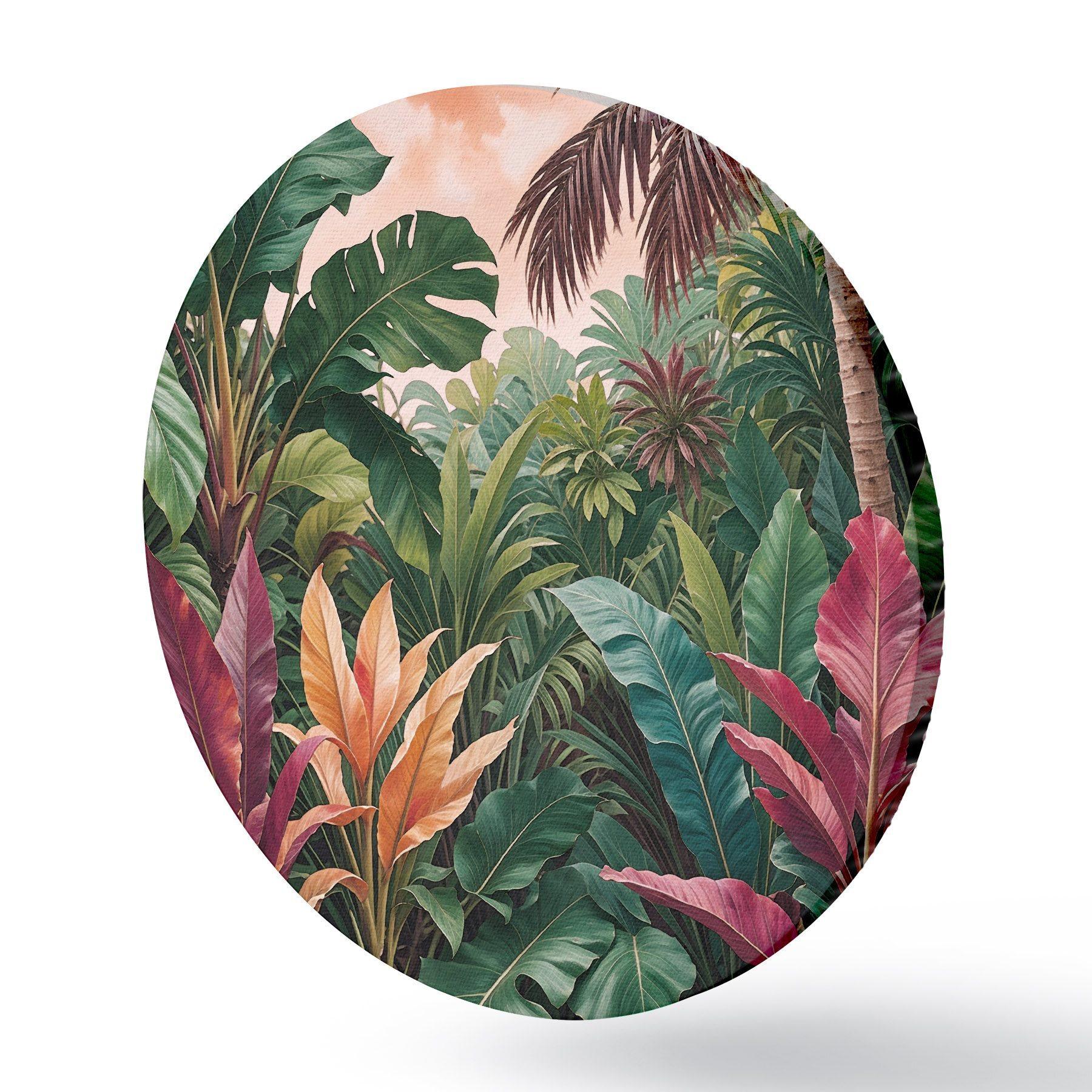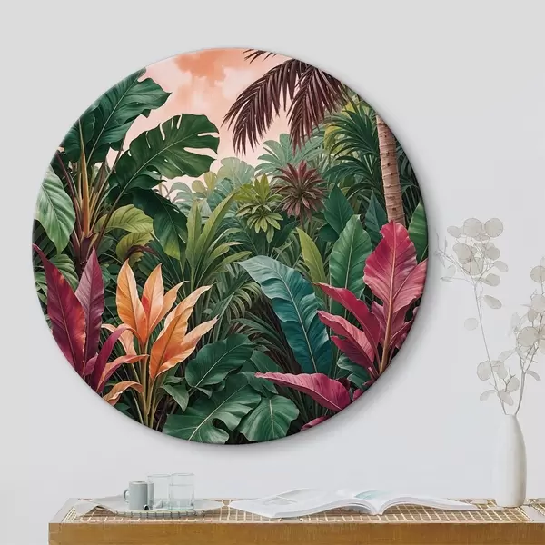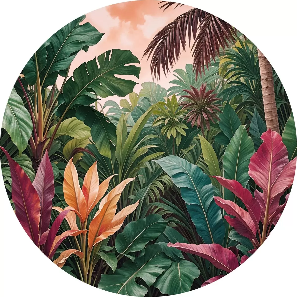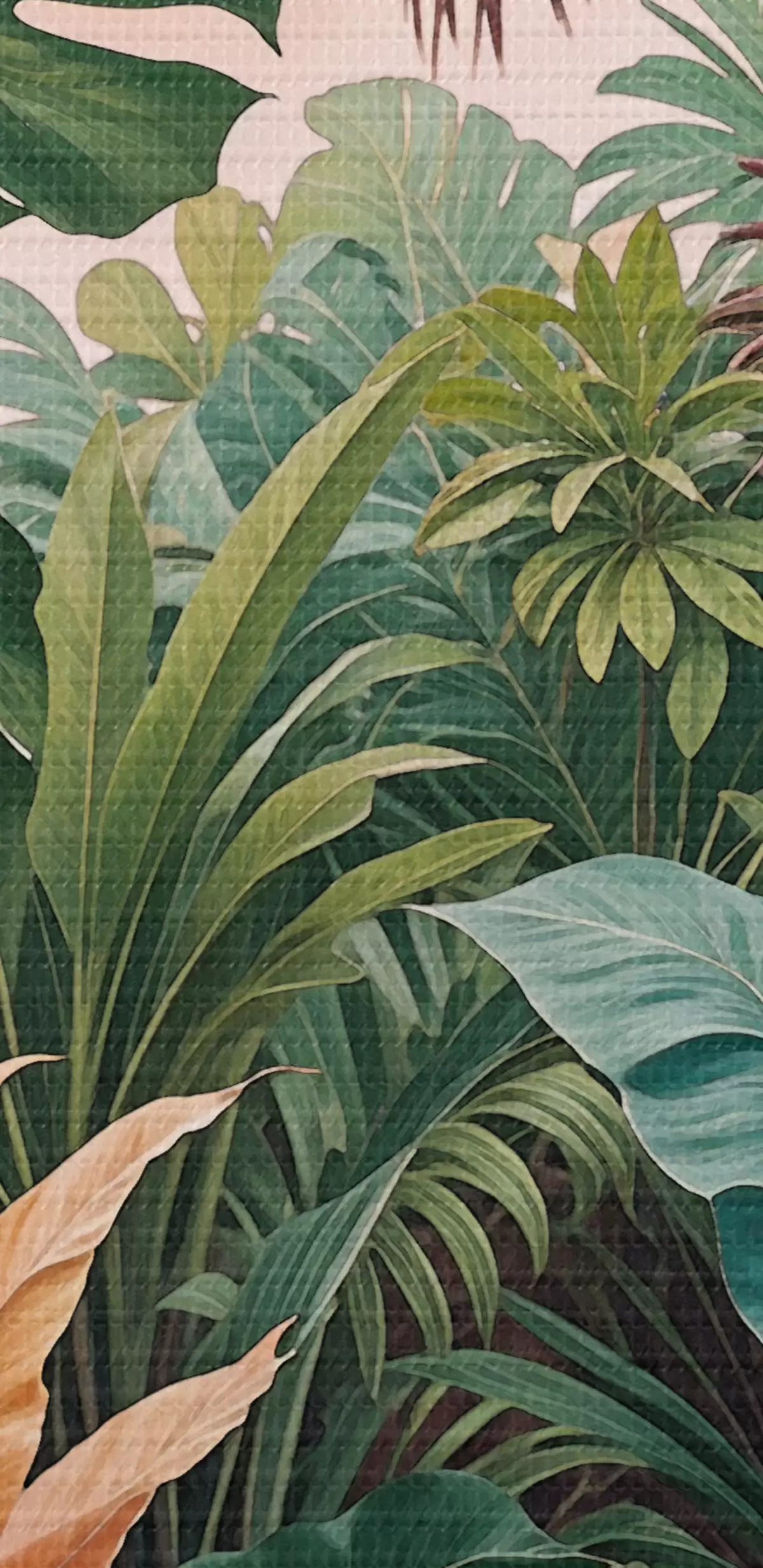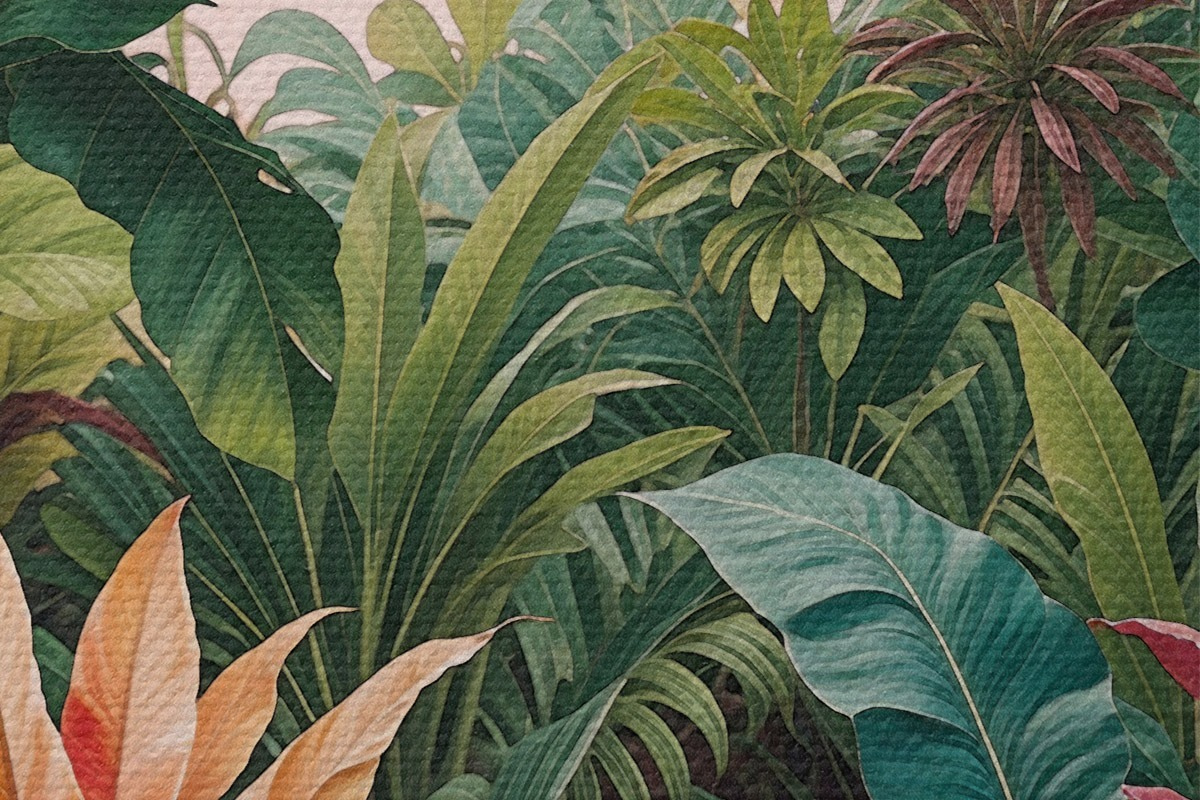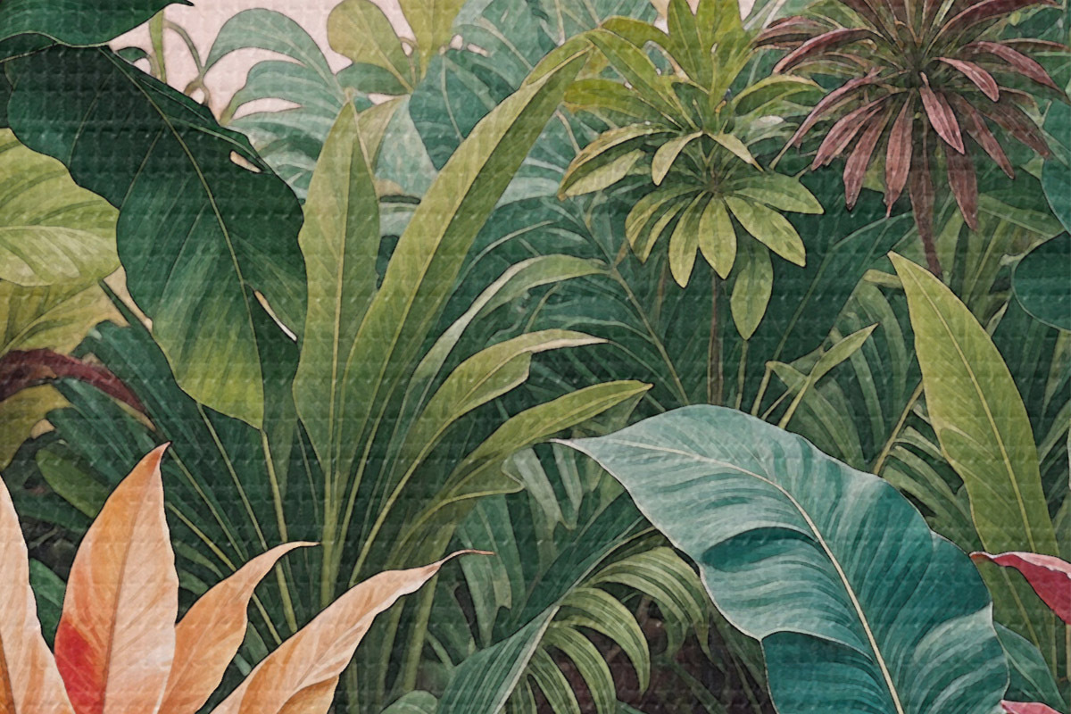 Nuotrauka Vešlios atogrąžų džiunglės su ryškiai žaliais lapais, palmių lapais ir spalvingomis gėlėmis Nr r38817