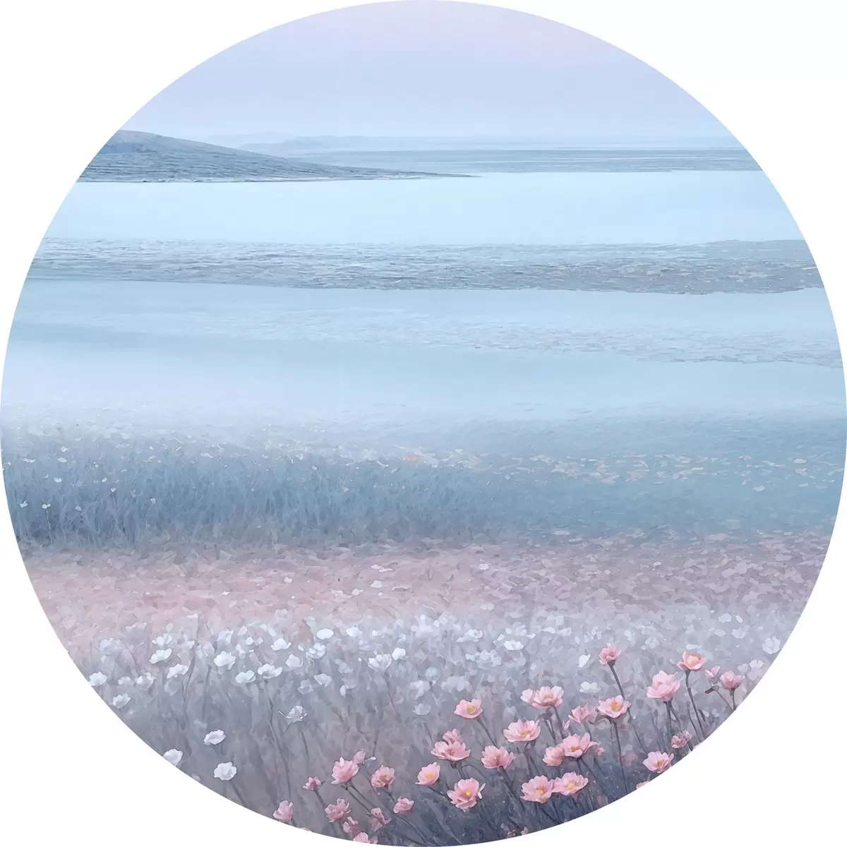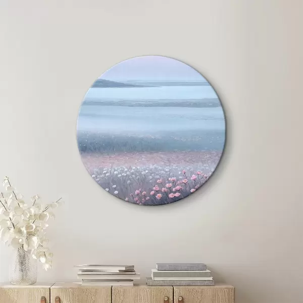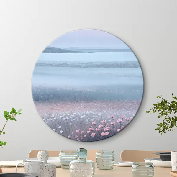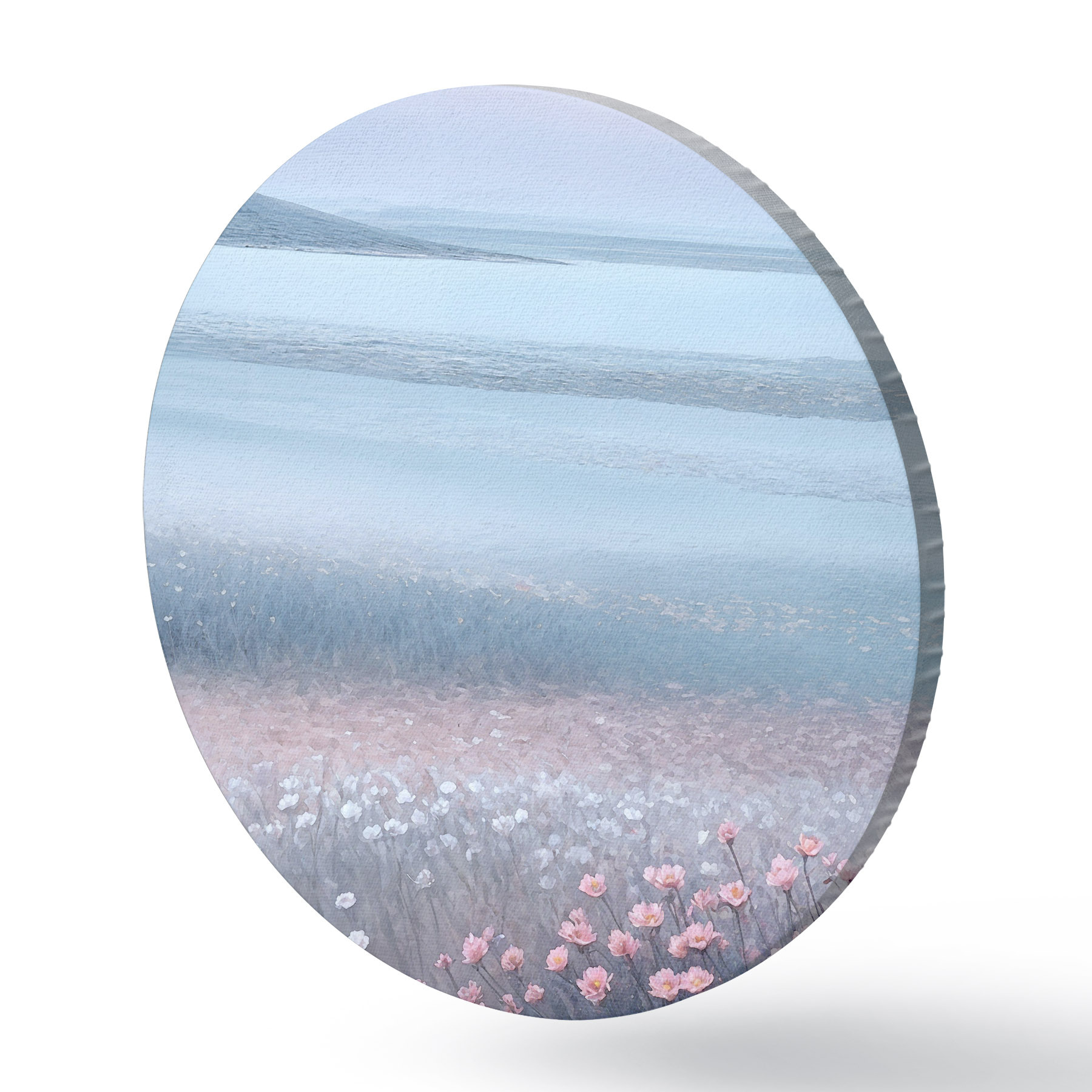 Nuotrauka Peizažas su ramiu lauku su rožinėmis ir baltomis gėlėmis, svajingos atmosferos minimalizmo tapyba Nr r38886