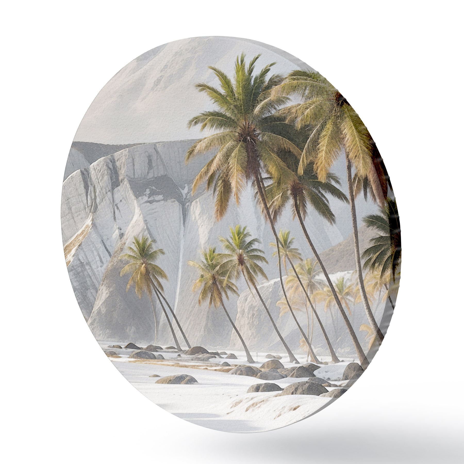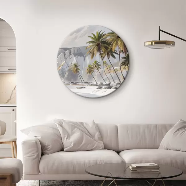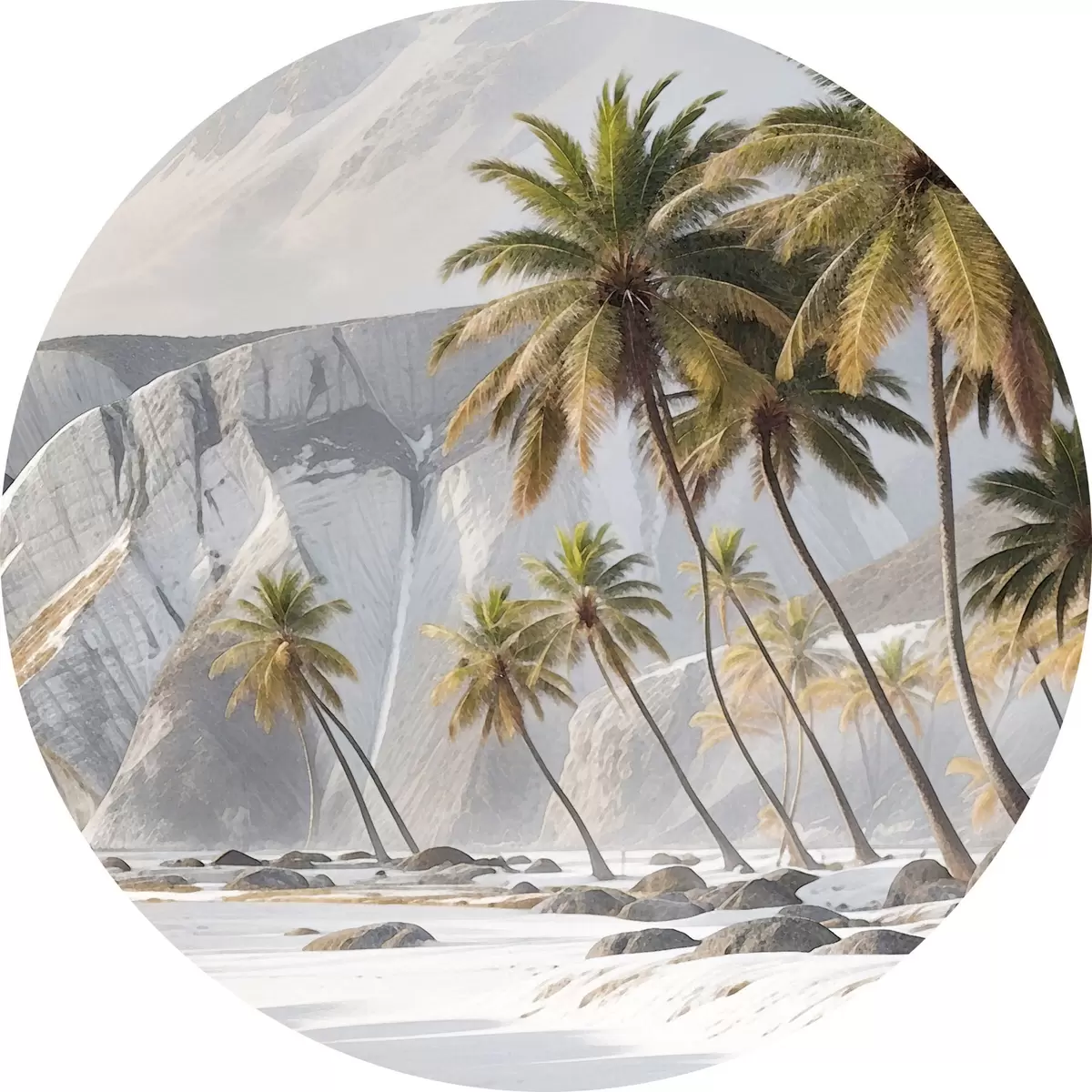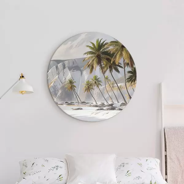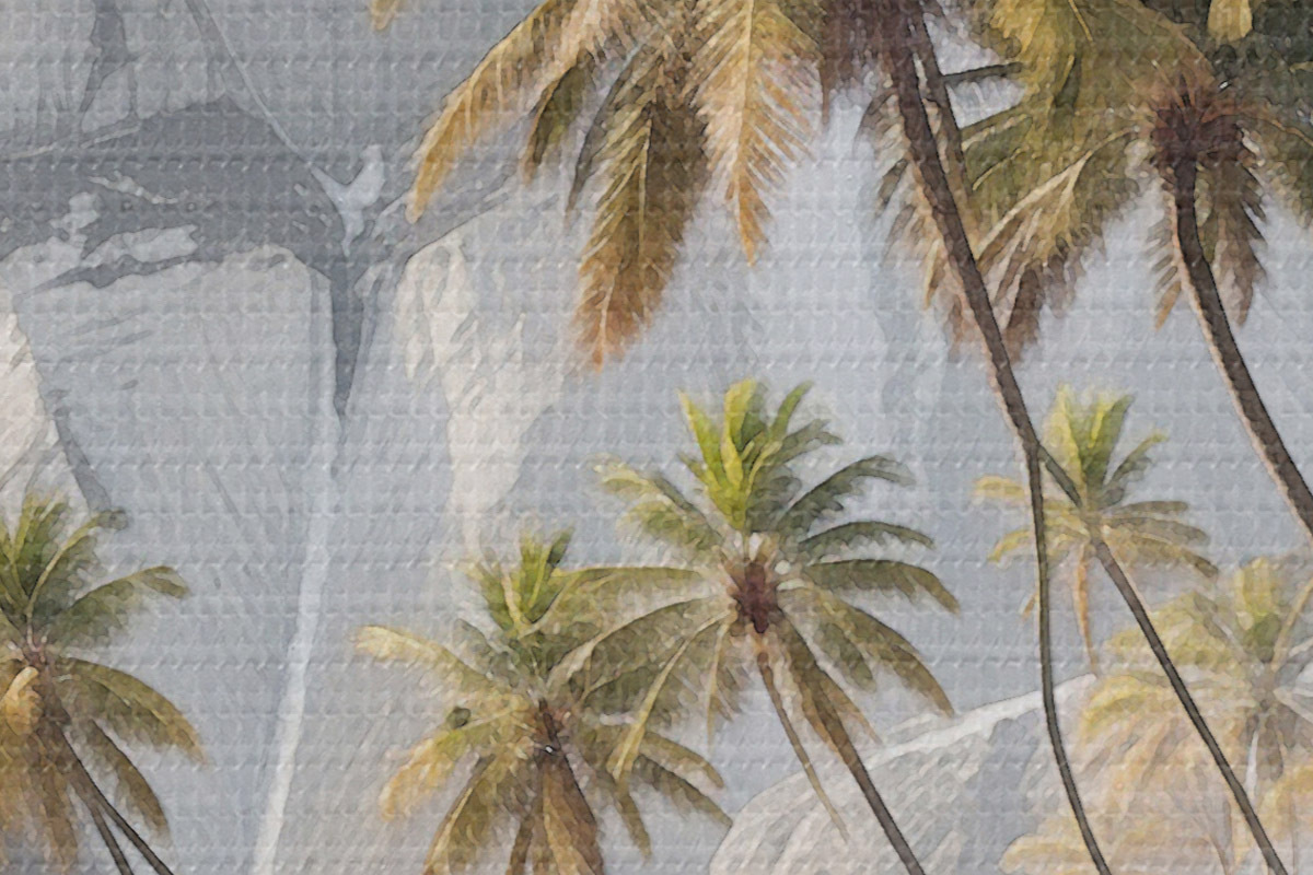 Nuotrauka Tropinis paplūdimys su didelėmis uolėtomis uolomis, palmėmis ir ramiu vandenynu su uolų abstraktaus meno atspindžiais Nr r38888