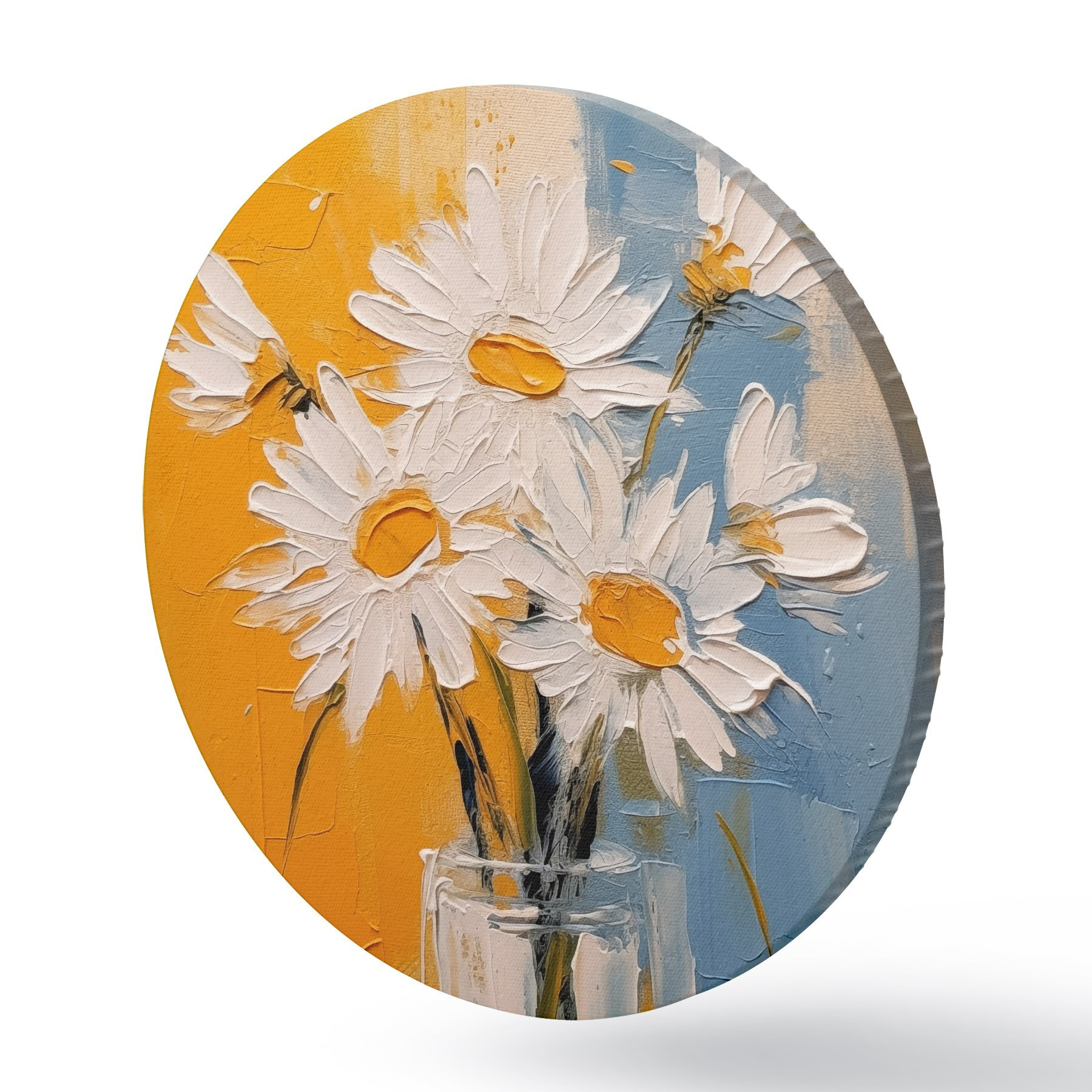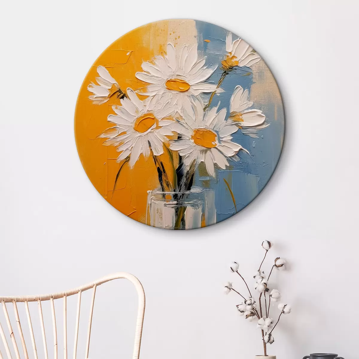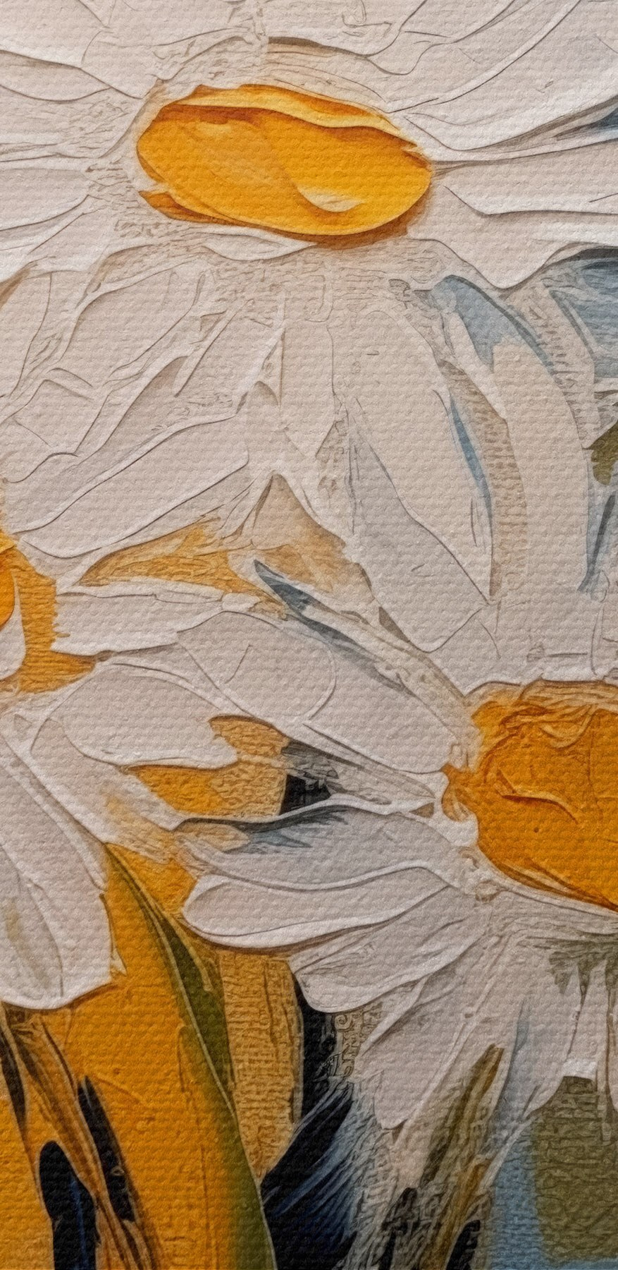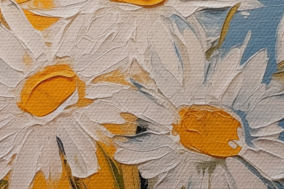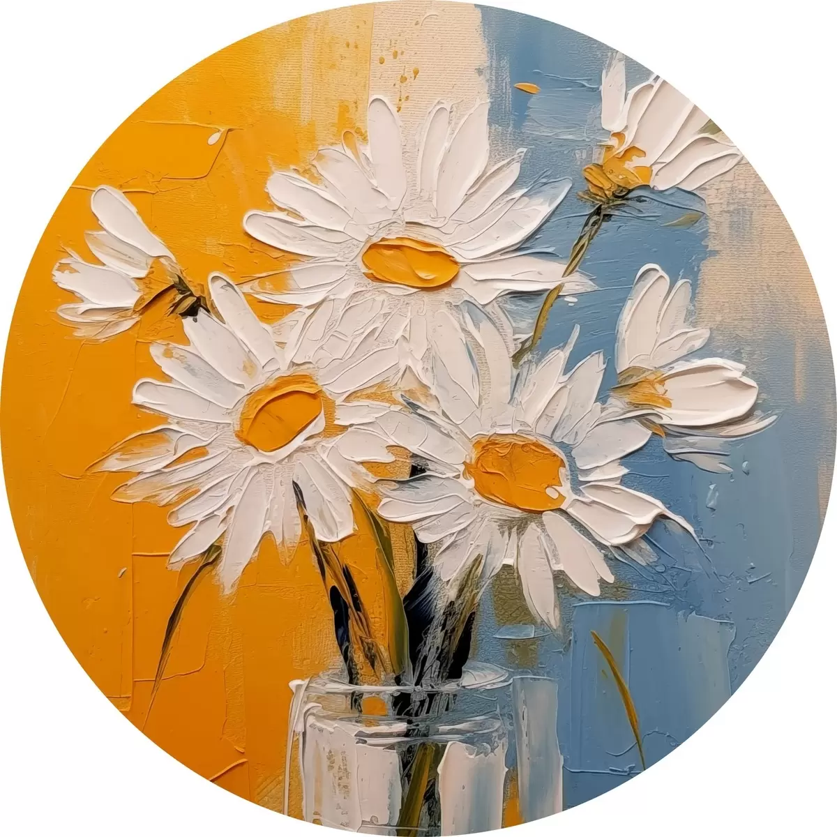 Nuotrauka Baltos ramunėlės stiklinėje vazoje mėlyname ir geltoname fone, aliejinės tapybos imitacija, dideli potėpiai Nr r38907