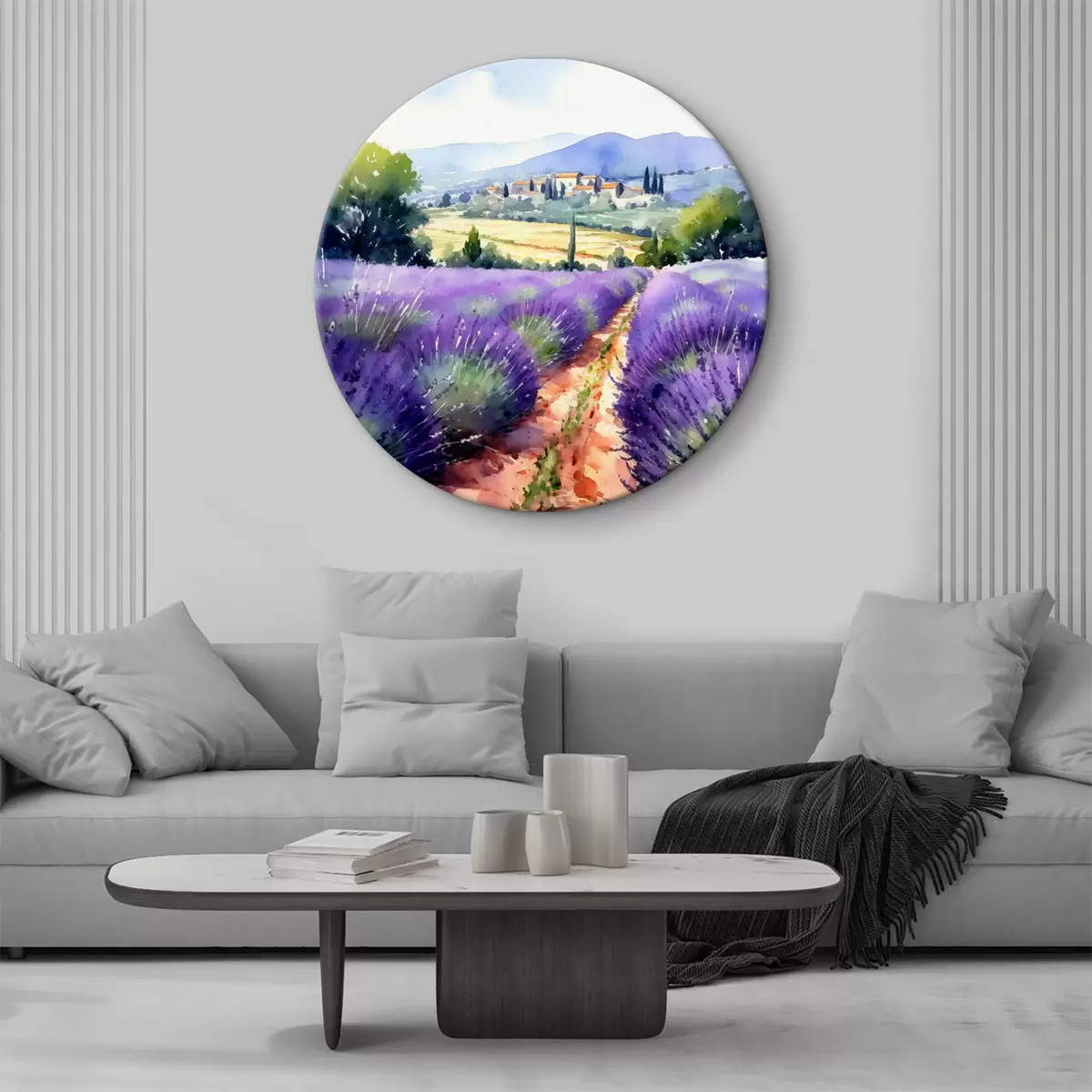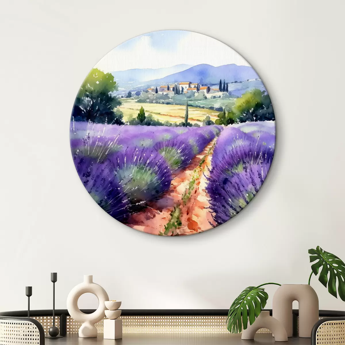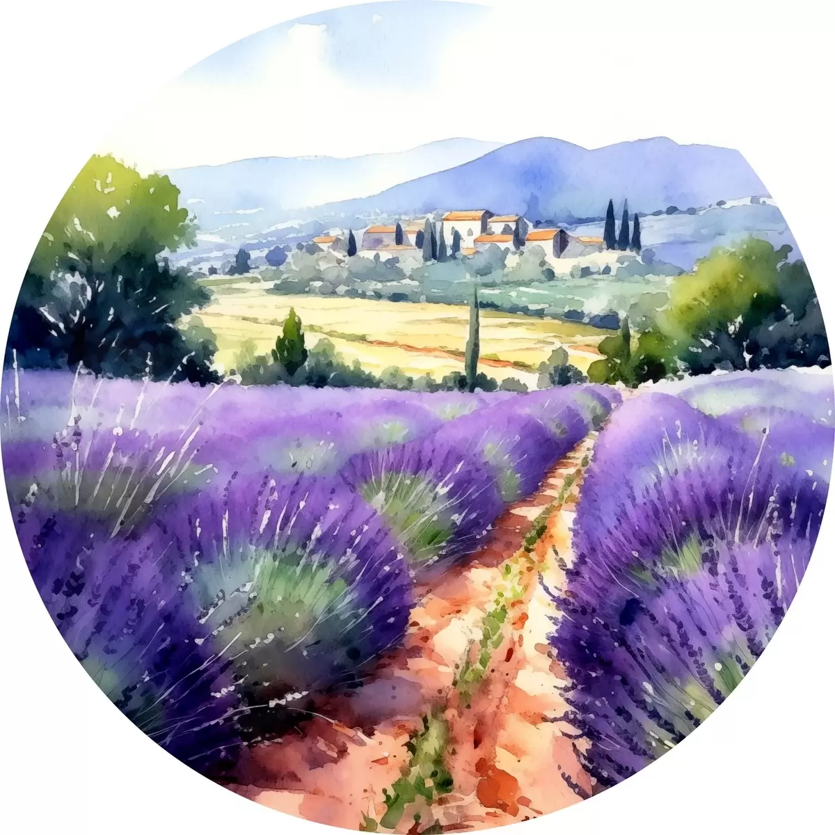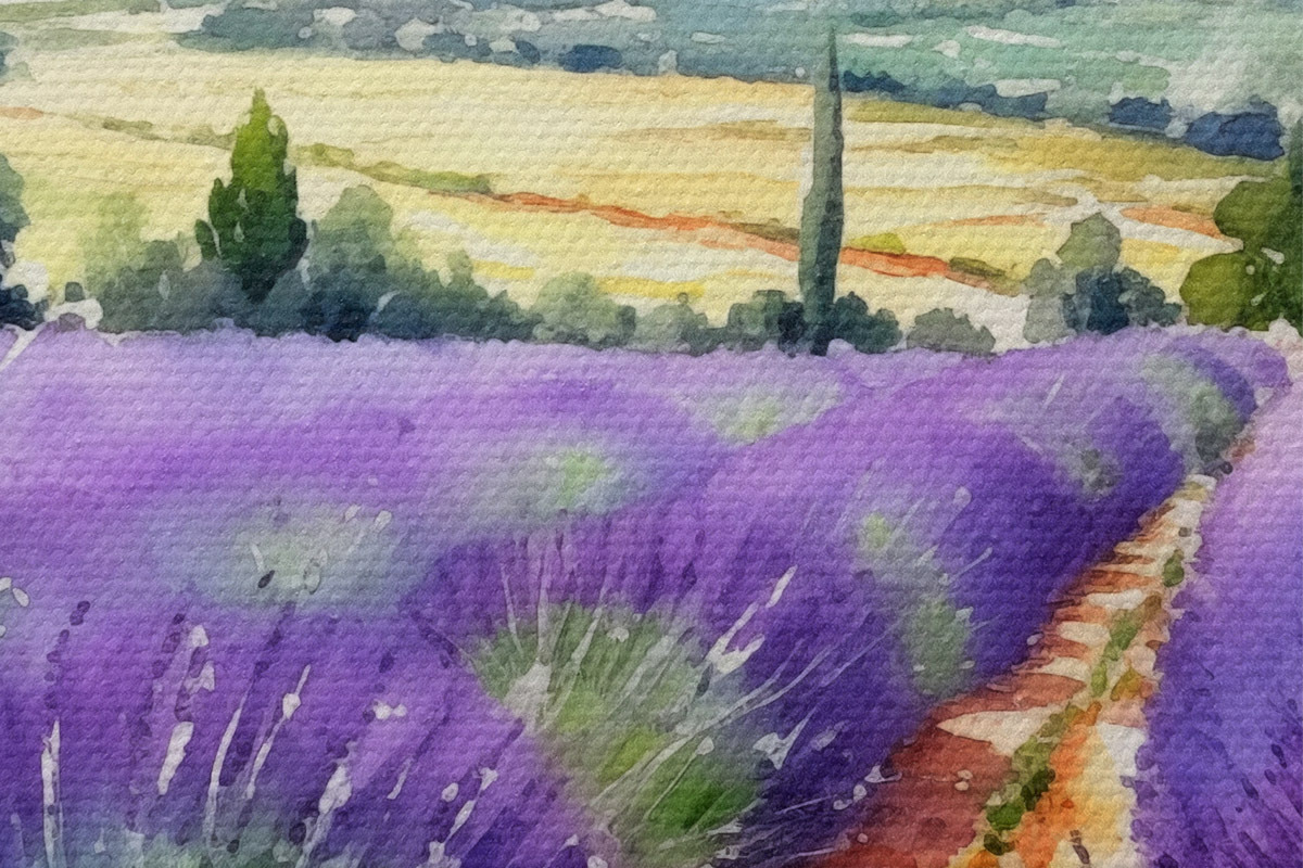 Nuotrauka Akvarelės levandų laukas kalnų ir kaimo fone Nr r38913