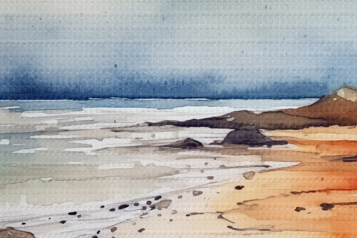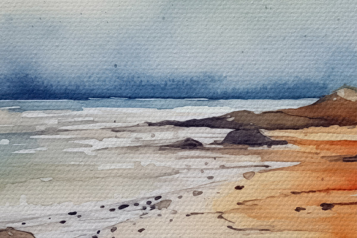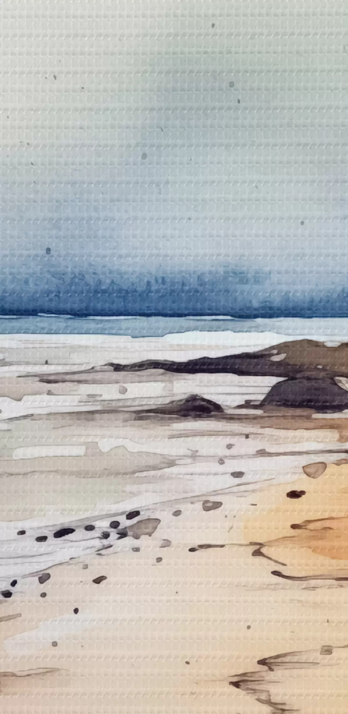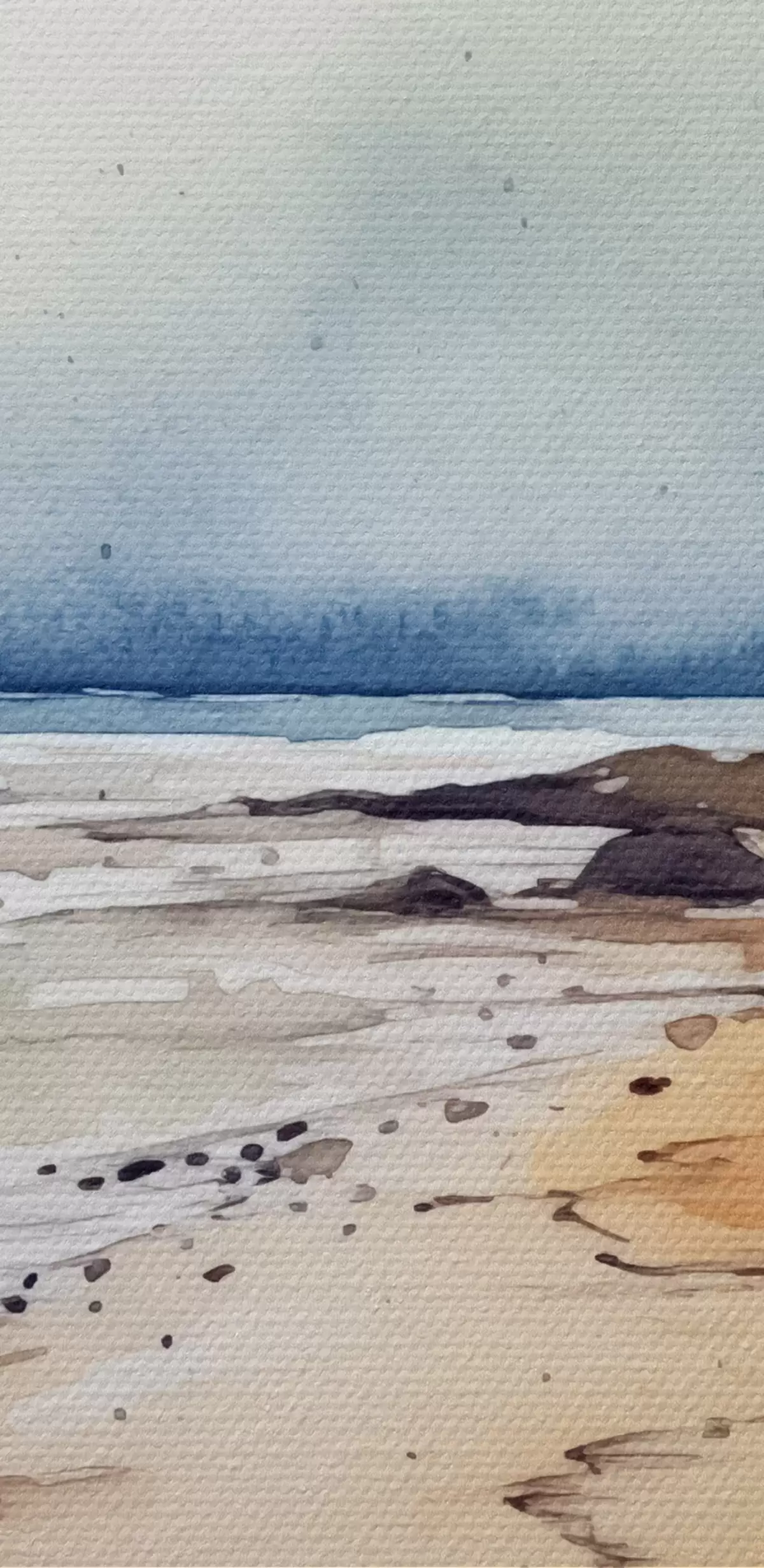 Nuotrauka Jūra ir paplūdimys, lietus, akvarelė, purslai, peizažas, peizažas, mėlyna, oranžinė spalva Nr r38936