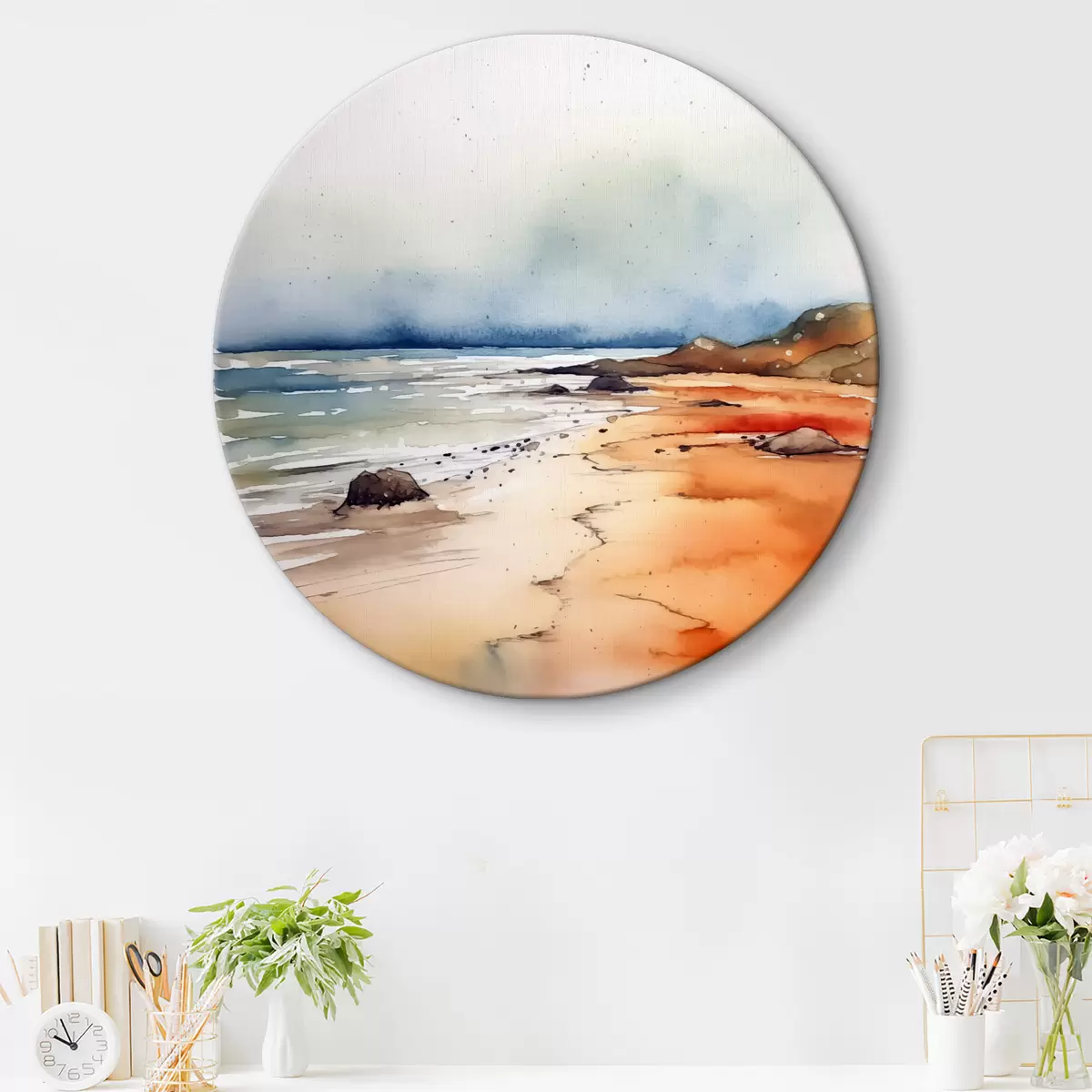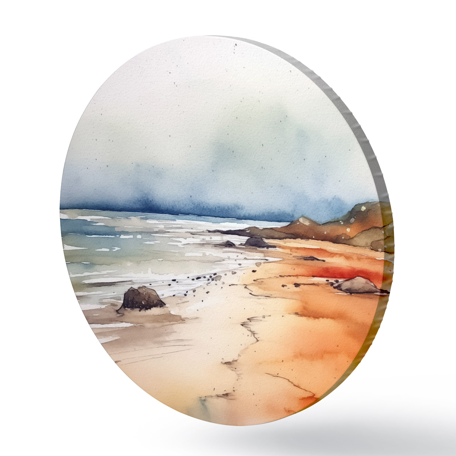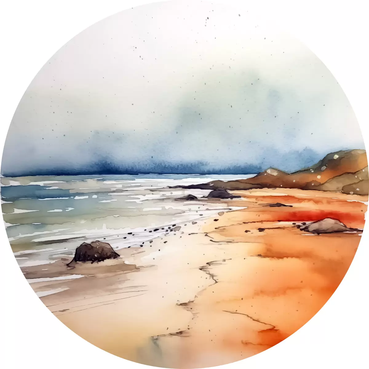 Nuotrauka Jūra ir paplūdimys, lietus, akvarelė, purslai, peizažas, peizažas, mėlyna, oranžinė spalva Nr r38936
