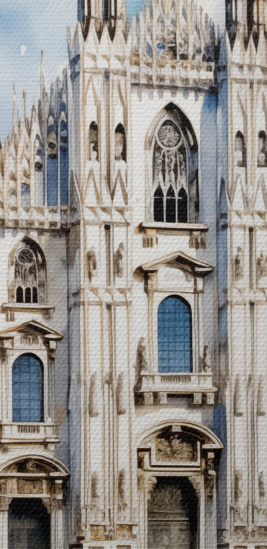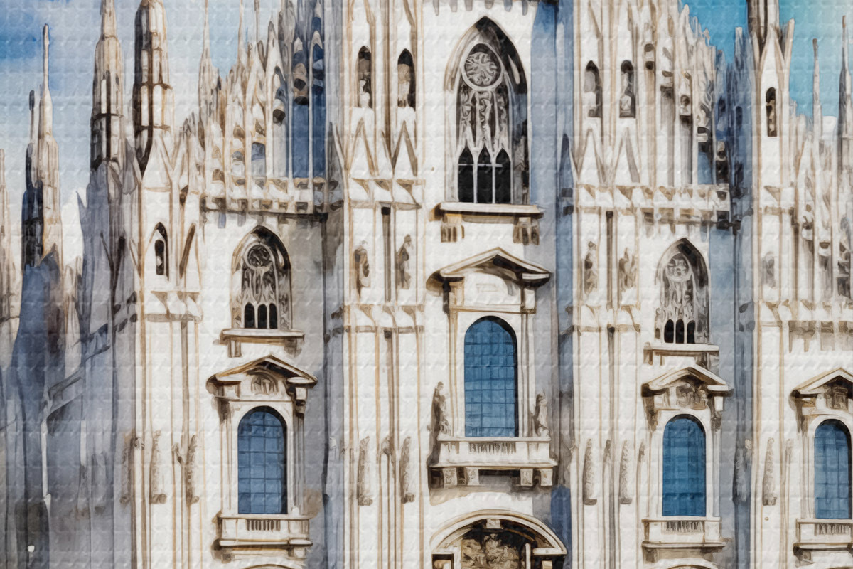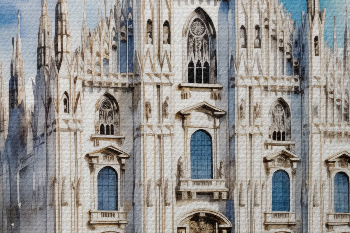 Nuotrauka Duomo katedra Milane, architektūra, miestas, lietus, akvarelė, mėlyna, pilka, vaikštantys žmonės Nr r38938