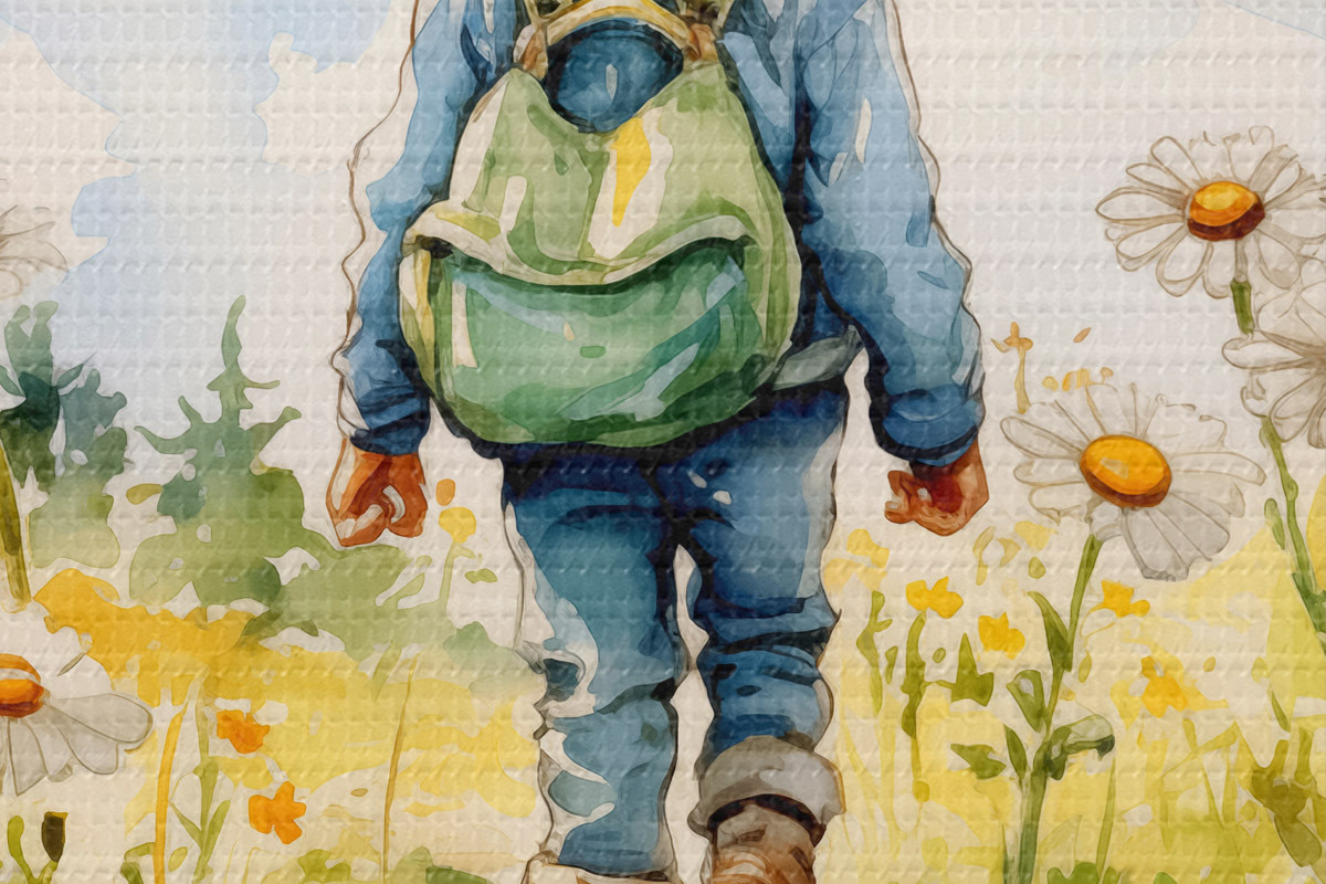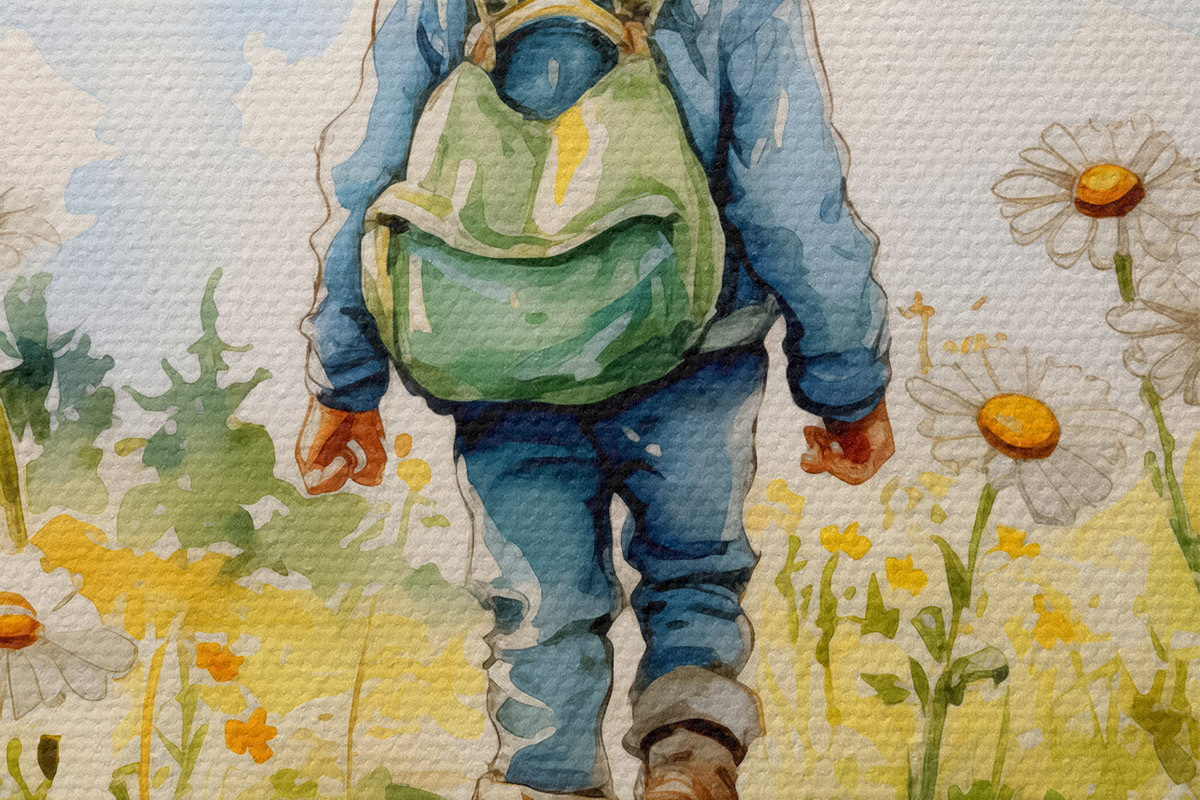 Nuotrauka Vaikinas kaubojiška kepure su žalia kuprine už nugaros ir mėlynu kostiumu eina taku ramunėlių lauke, akvarelė Nr r38946