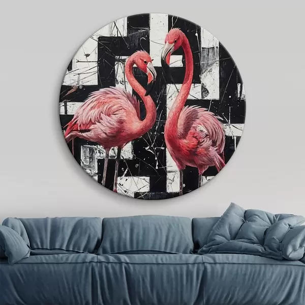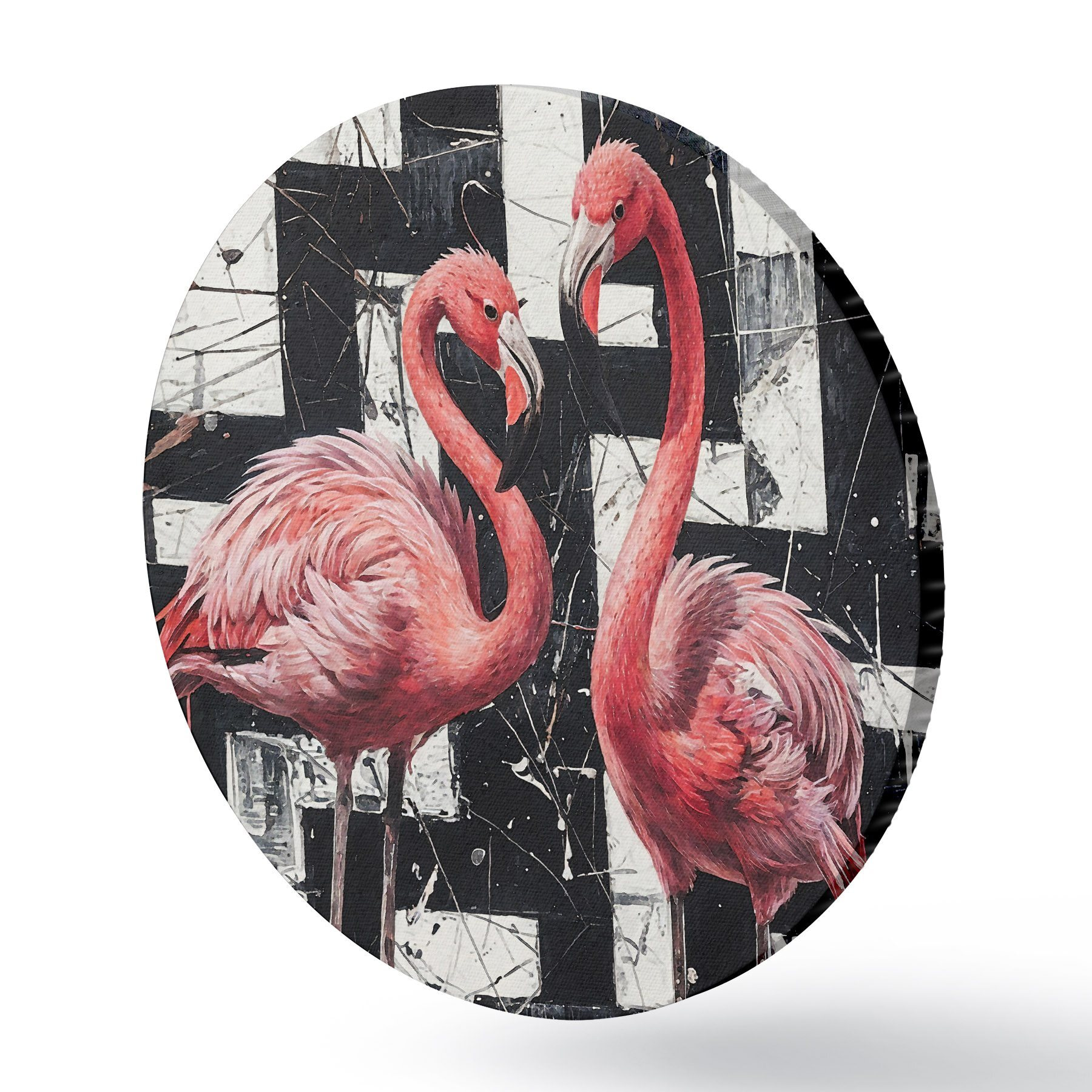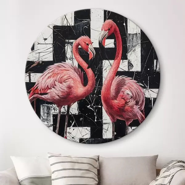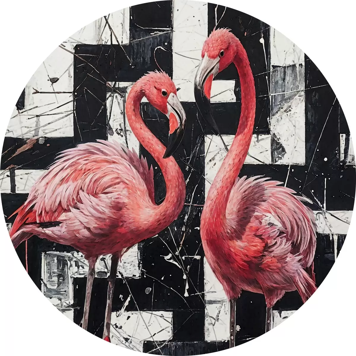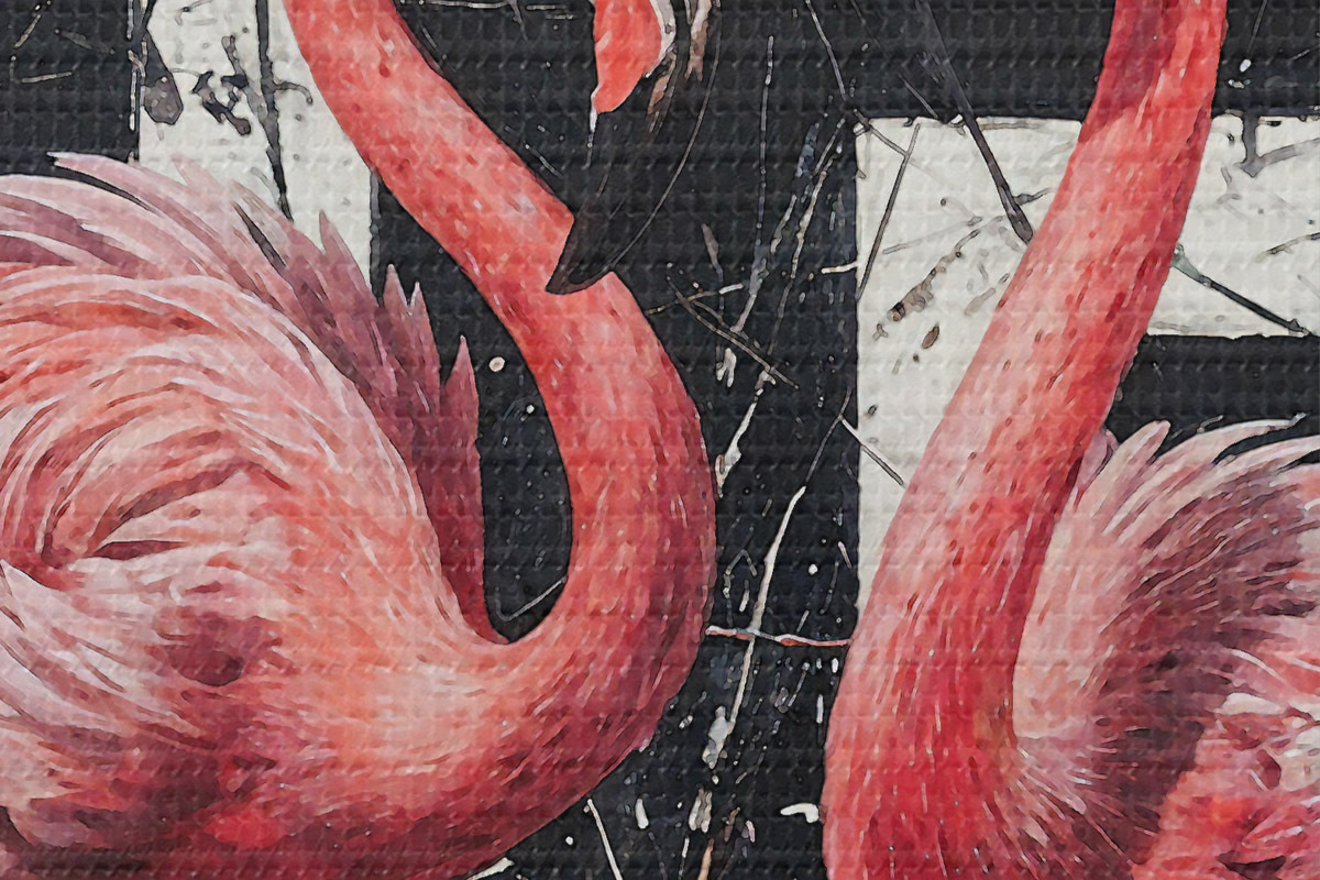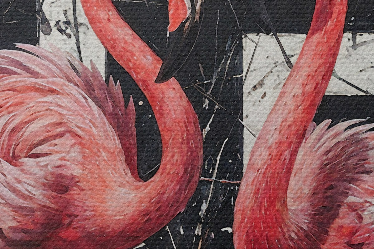 Nuotrauka Du rožiniai flamingai stovi prieš juodai baltą abstrakčių fono paveikslą Nr r38954