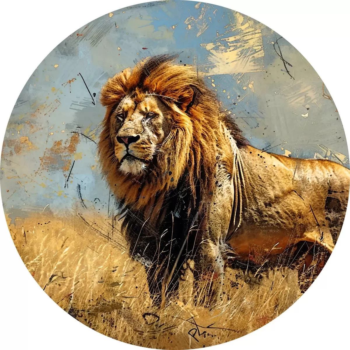 Nuotrauka Didelis liūto patinas storais tamsiais karčiais stovi žole apaugusiame lauke debesuotame dangaus fone Nr r38962