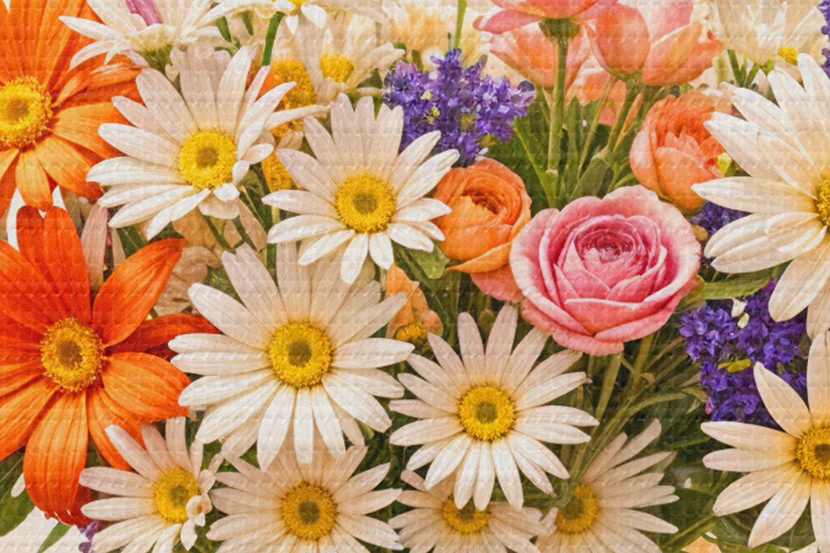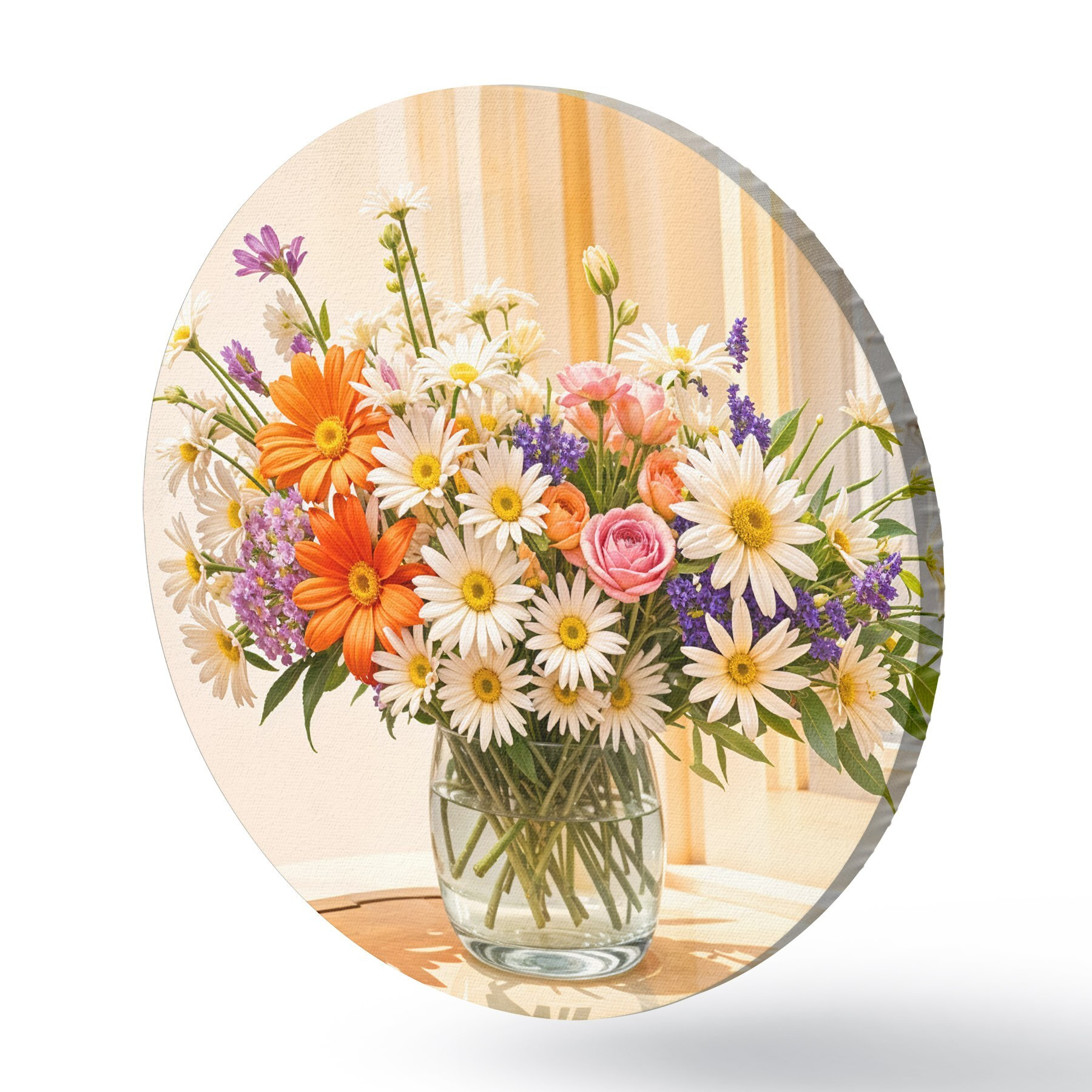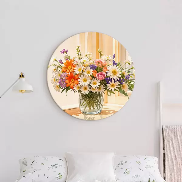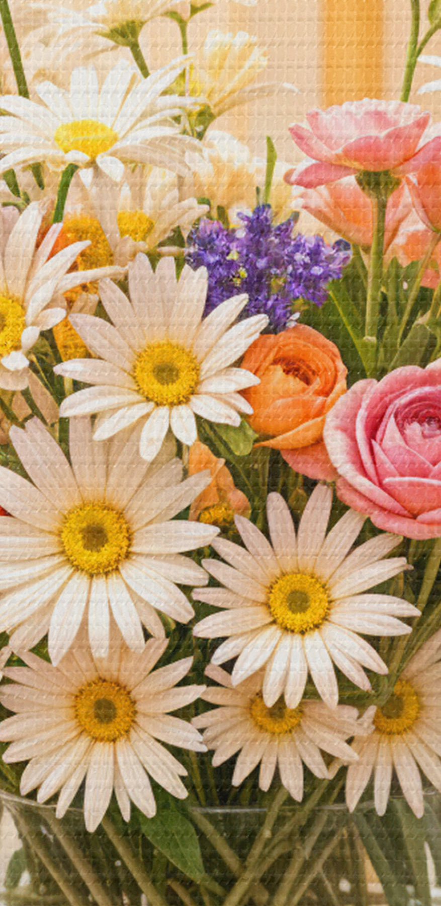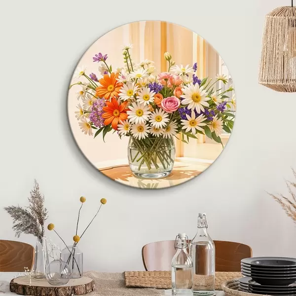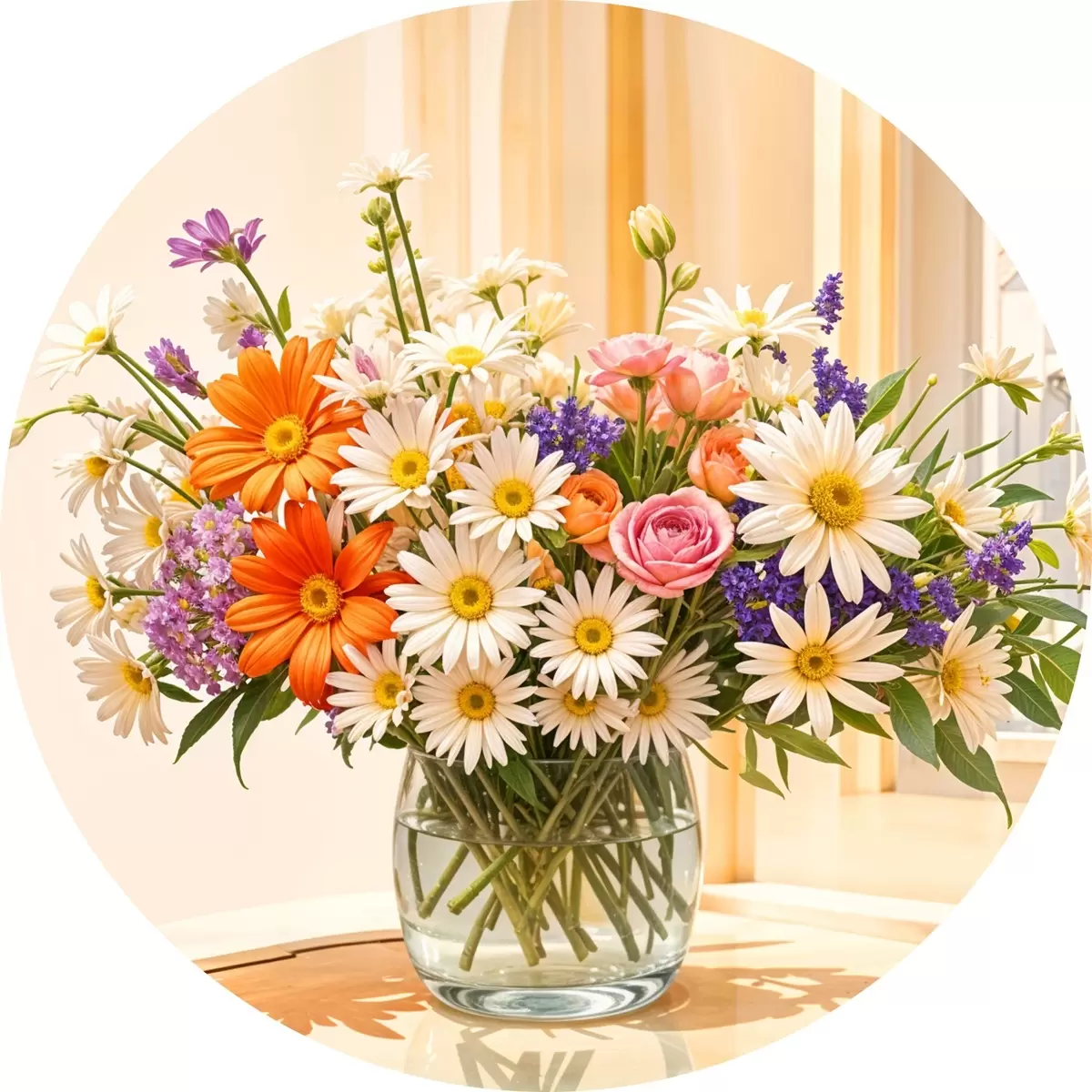 Nuotrauka Spalvinga gėlių puokštė stiklinėje vazoje ant stalo priešais langą šiltame saulėtame fone Nr r38978