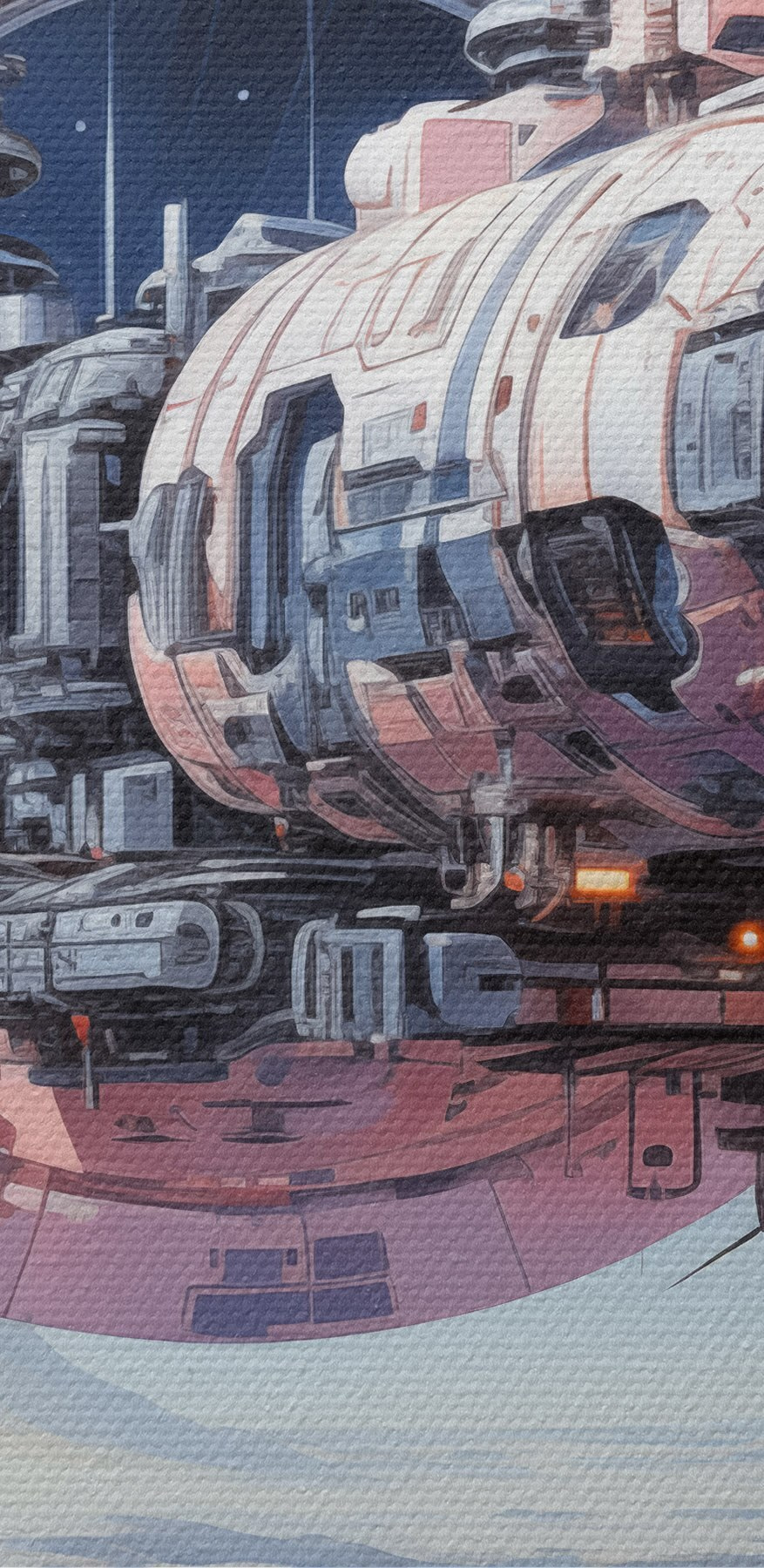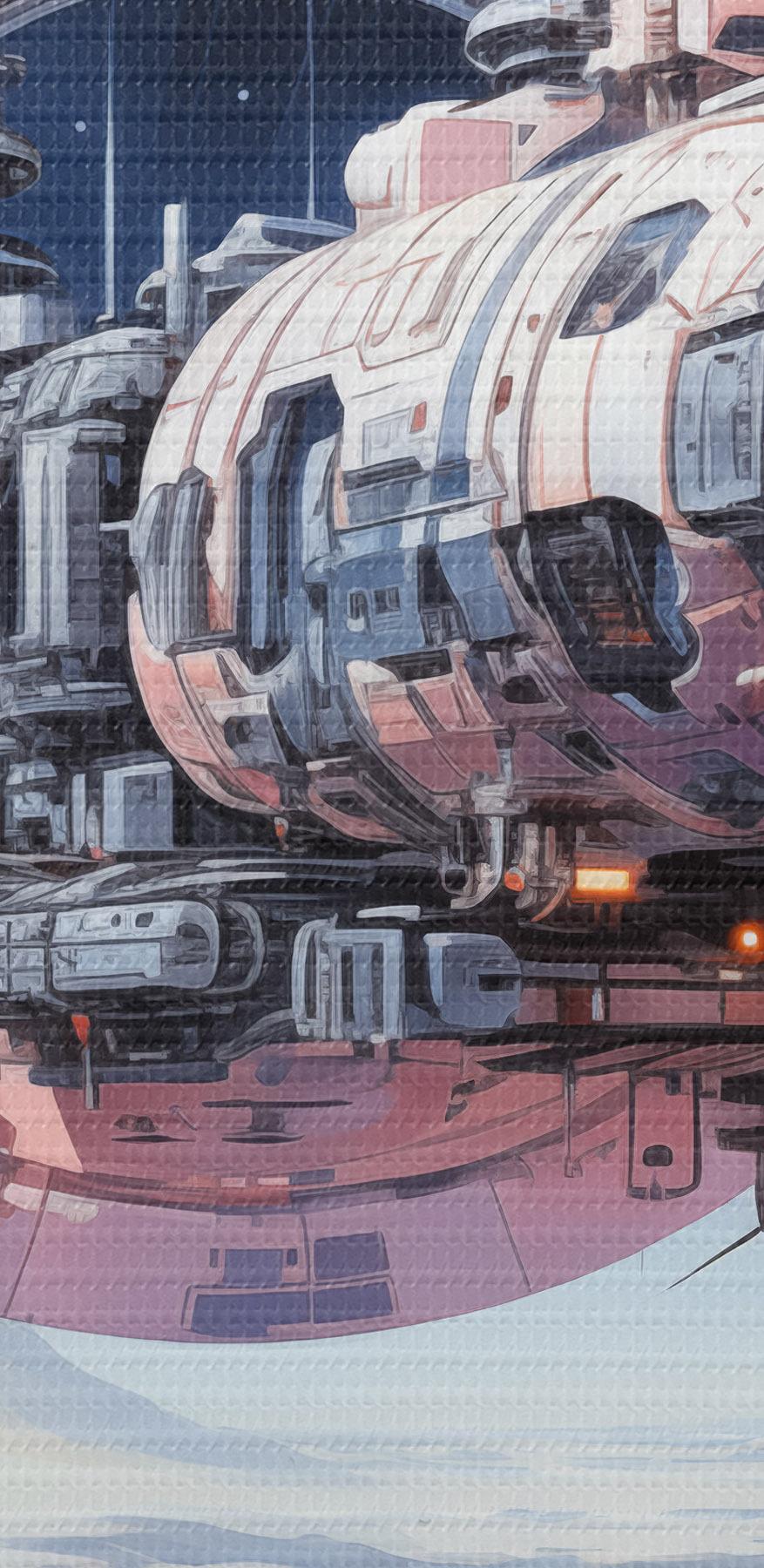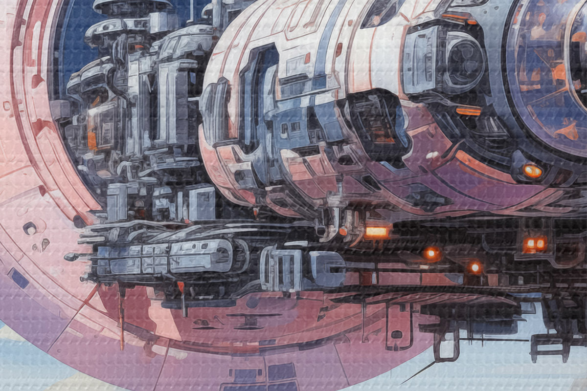 Nuotrauka Kiberpanko stiliaus erdvėlaivis skrenda erdvėje virš asteroido ir planetos, mėlynos, smėlio, rožinės, baltos spalvos Nr r39115