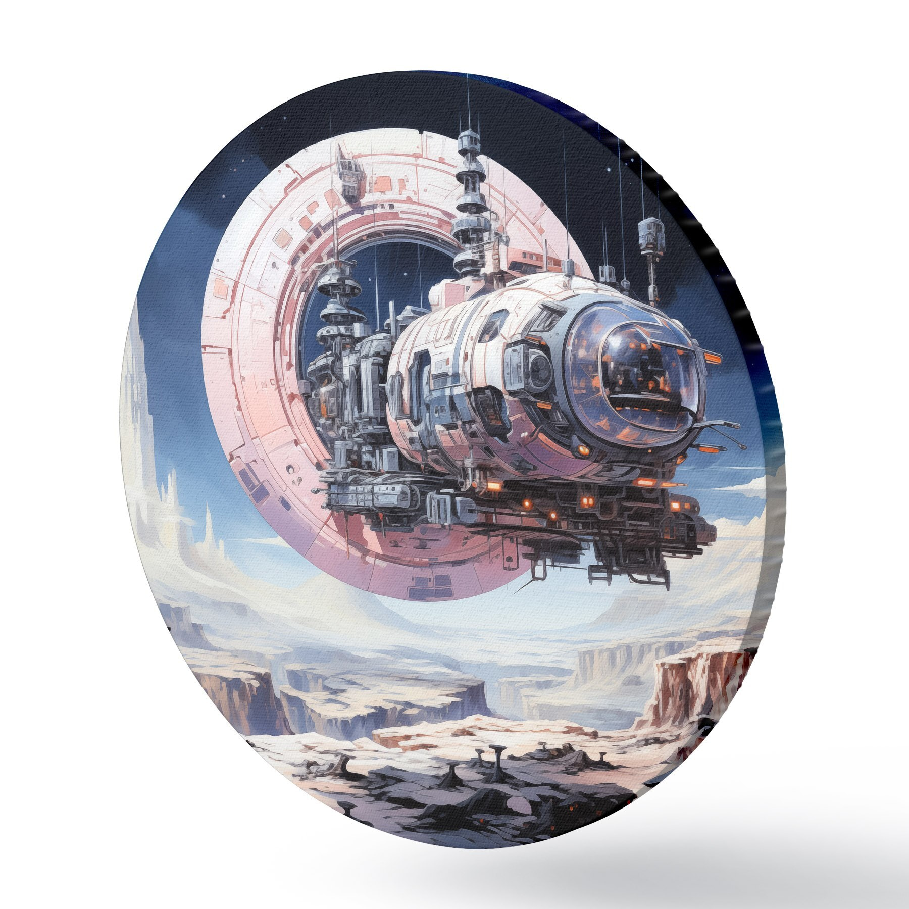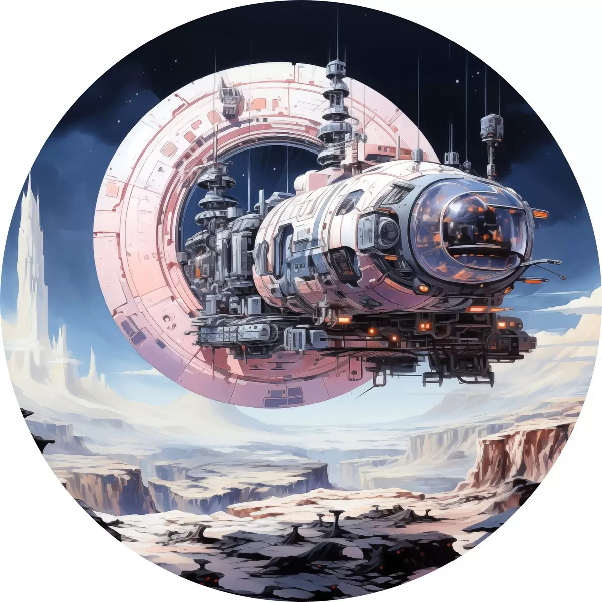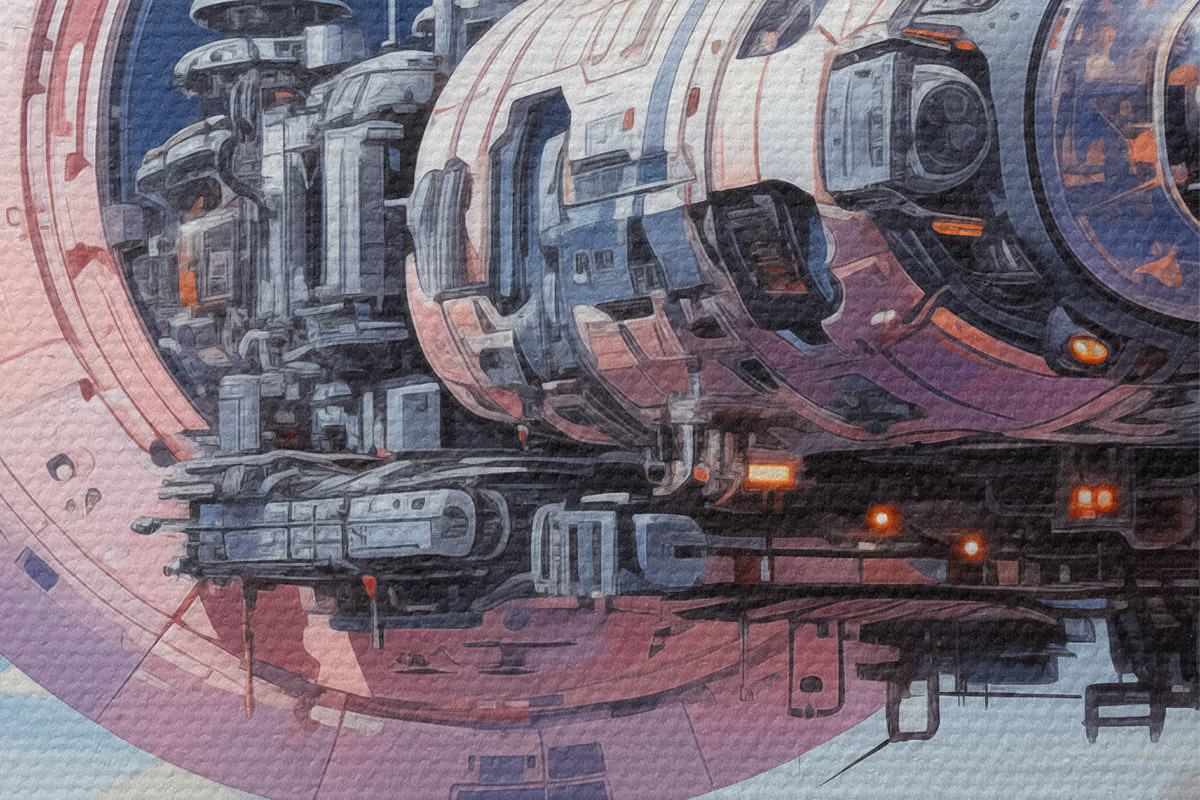 Nuotrauka Kiberpanko stiliaus erdvėlaivis skrenda erdvėje virš asteroido ir planetos, mėlynos, smėlio, rožinės, baltos spalvos Nr r39115