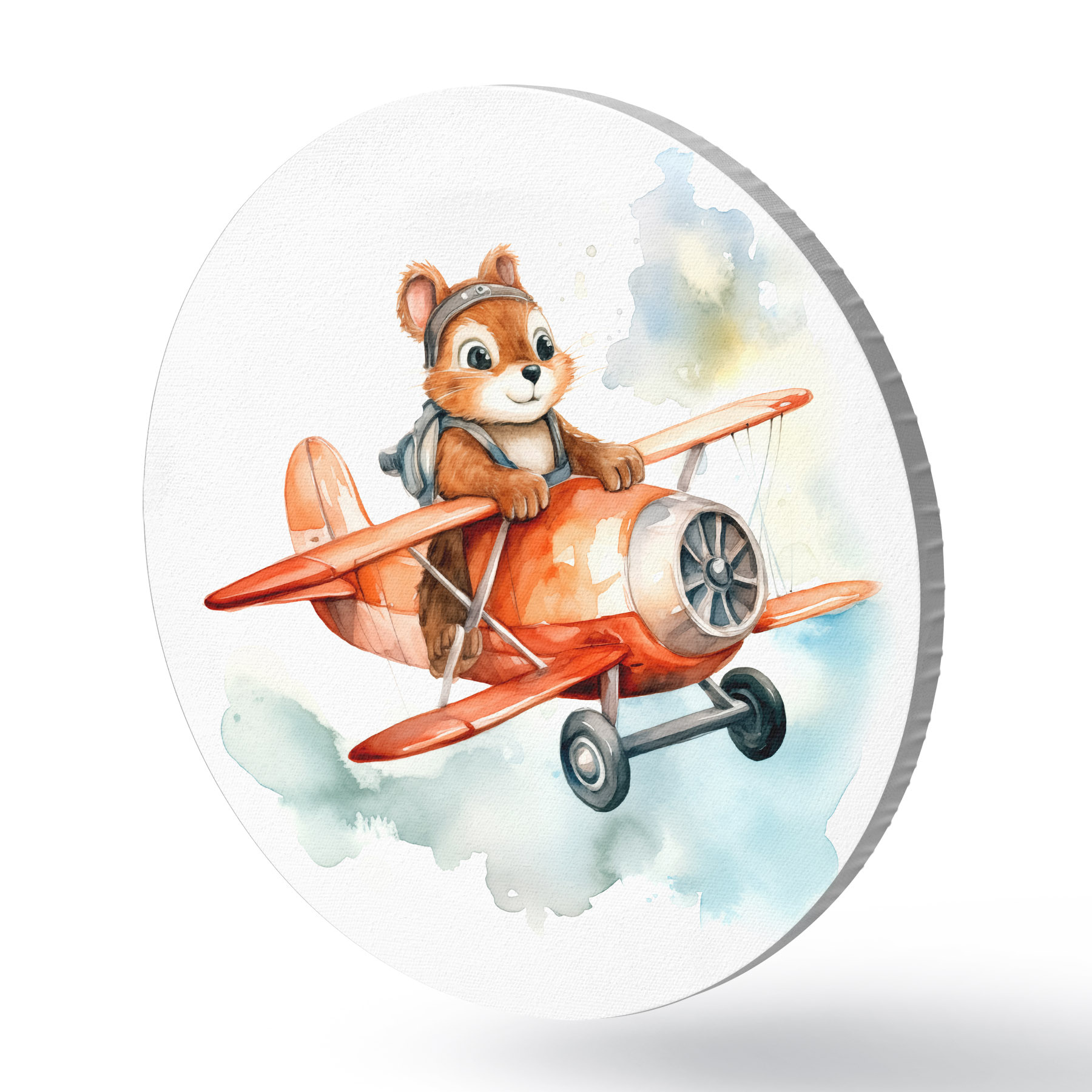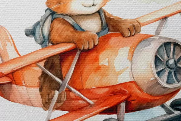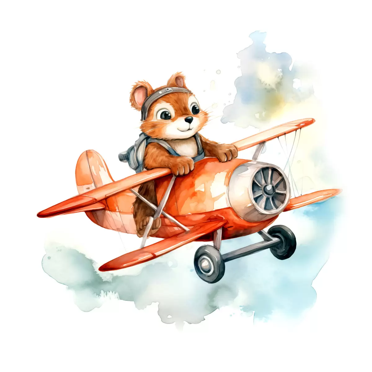 Nuotrauka Voveraitės kūdikis skraido raudonu lėktuvu, vaikiška iliustracija akvarele Nr r39116