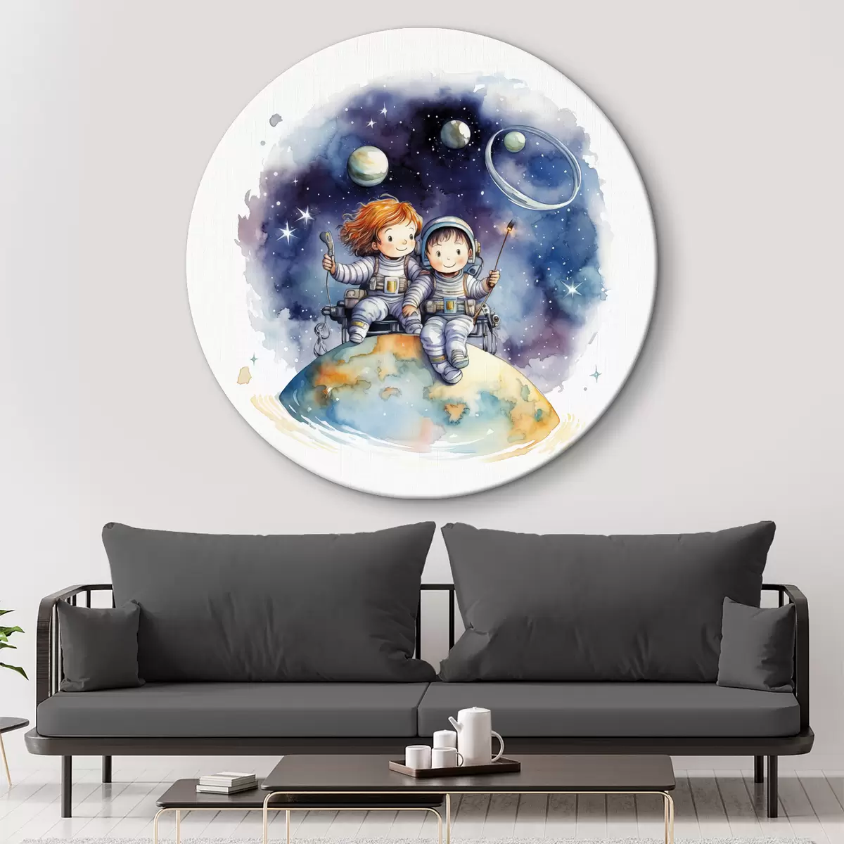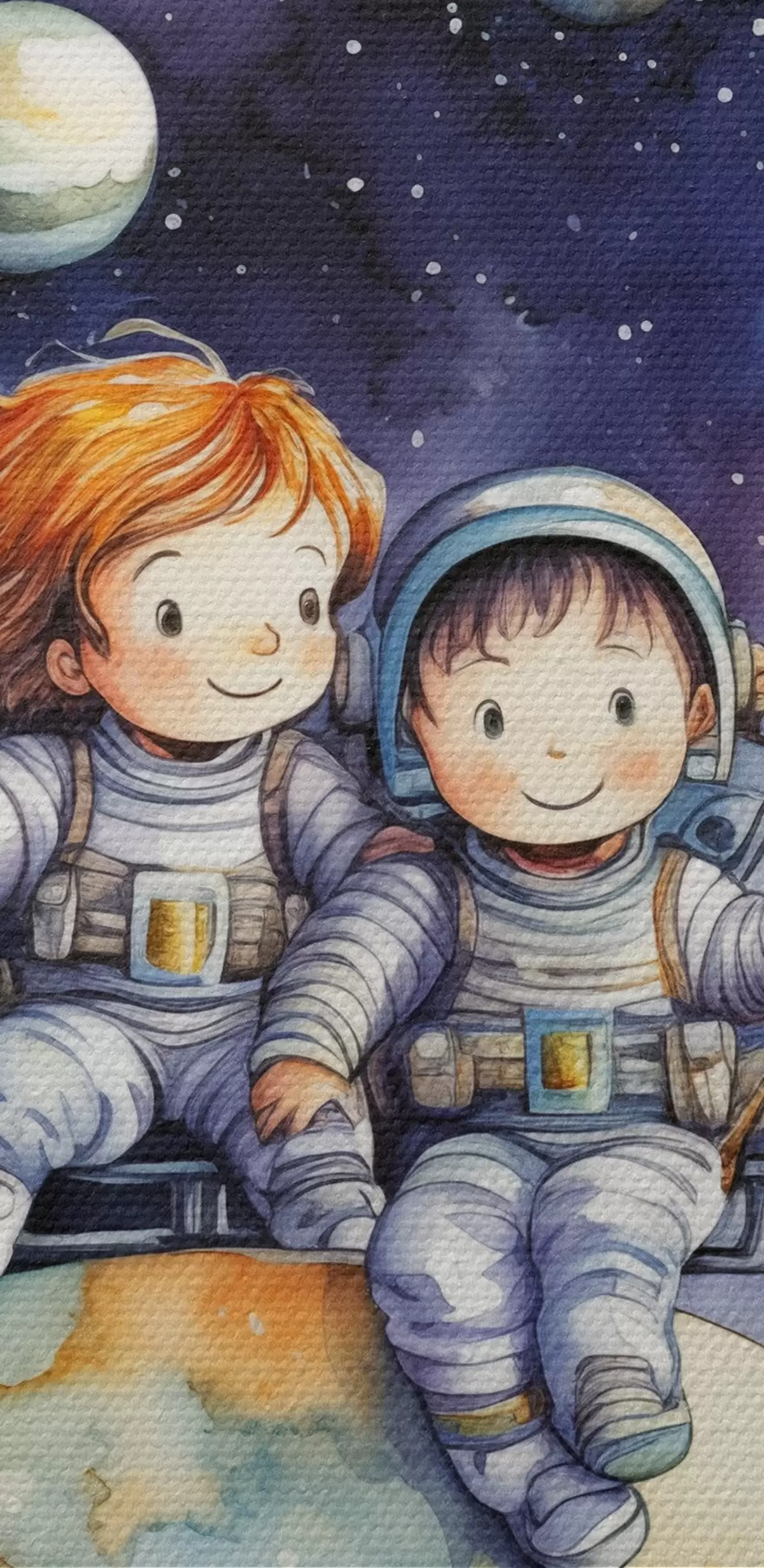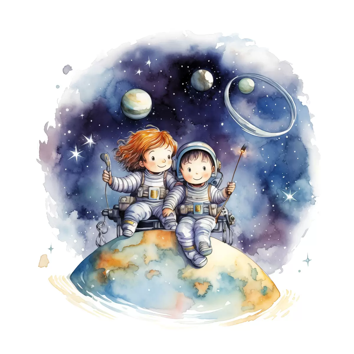 Nuotrauka Vaikai su skafandrais, sėdintys planetoje kosmose, vaikų akvarelės iliustracija Nr r39117