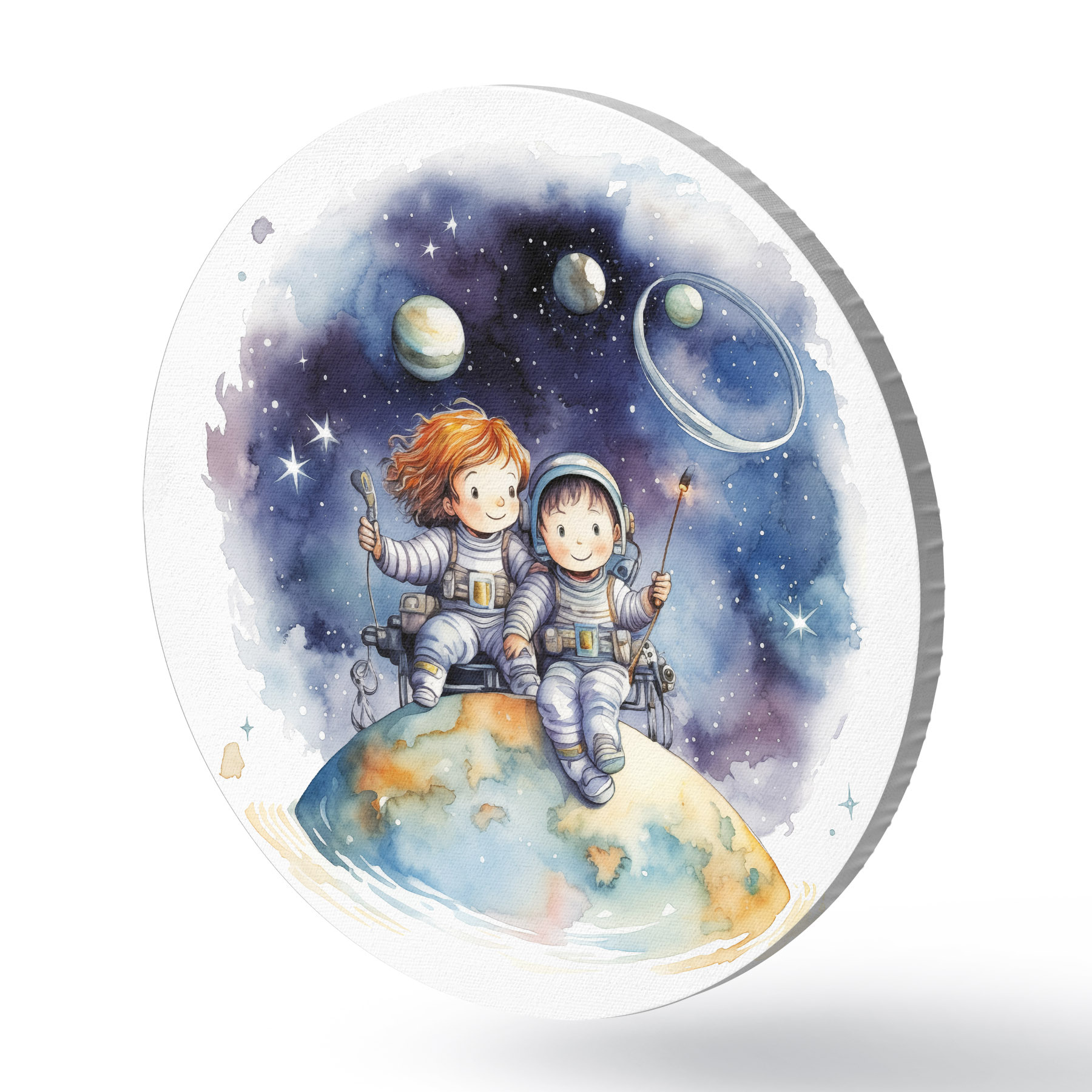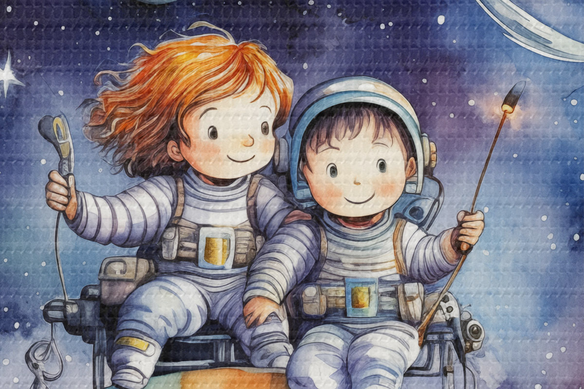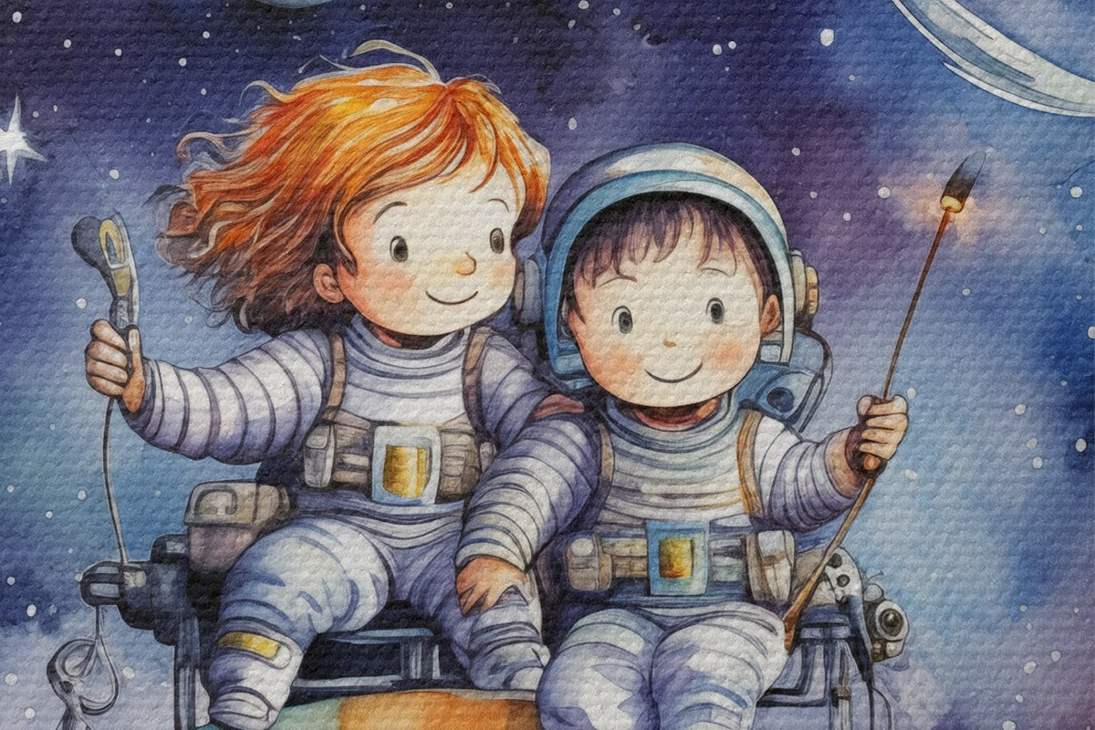 Nuotrauka Vaikai su skafandrais, sėdintys planetoje kosmose, vaikų akvarelės iliustracija Nr r39117