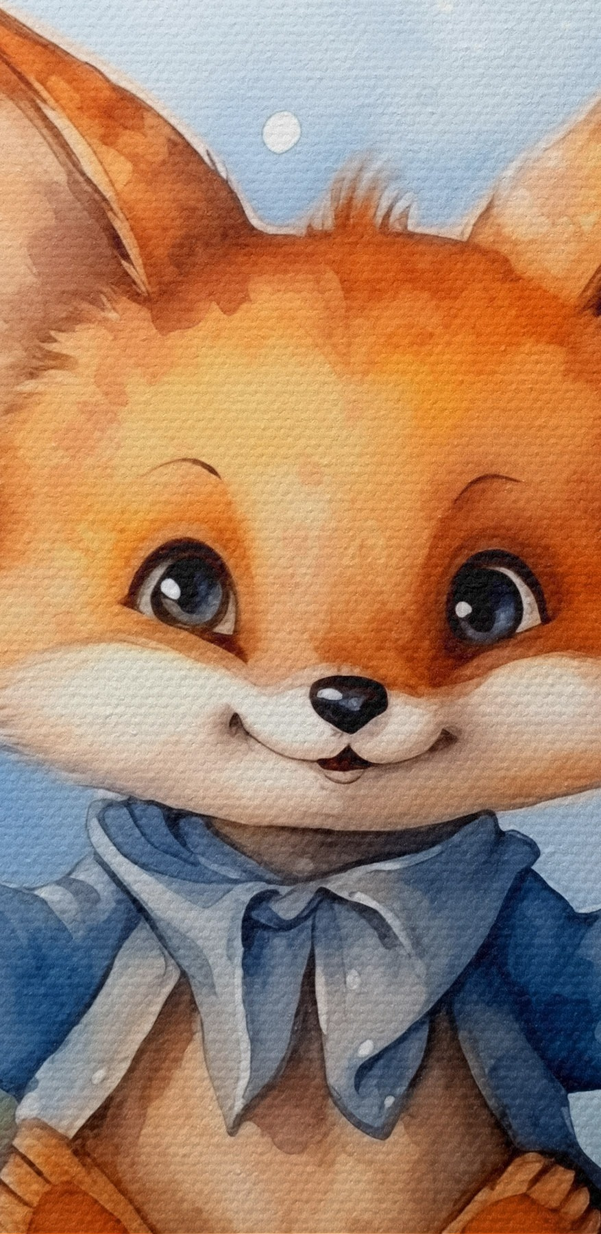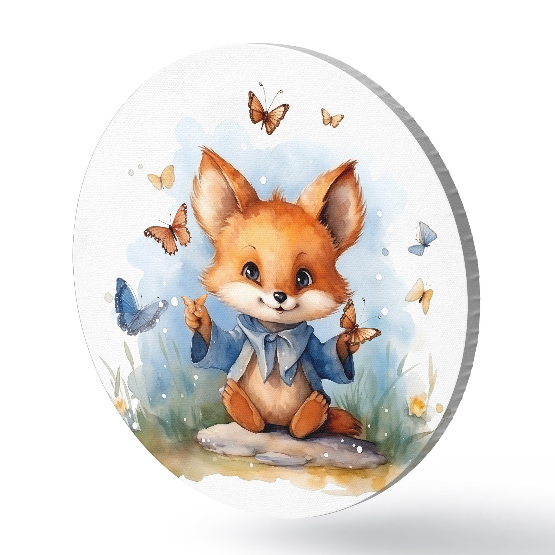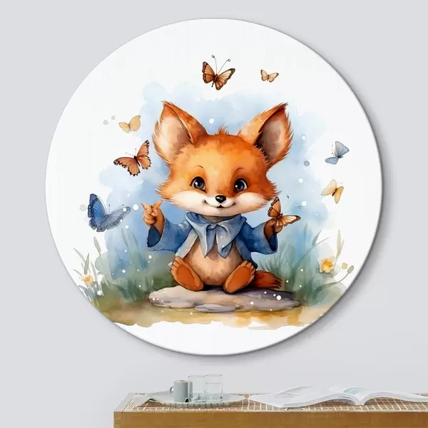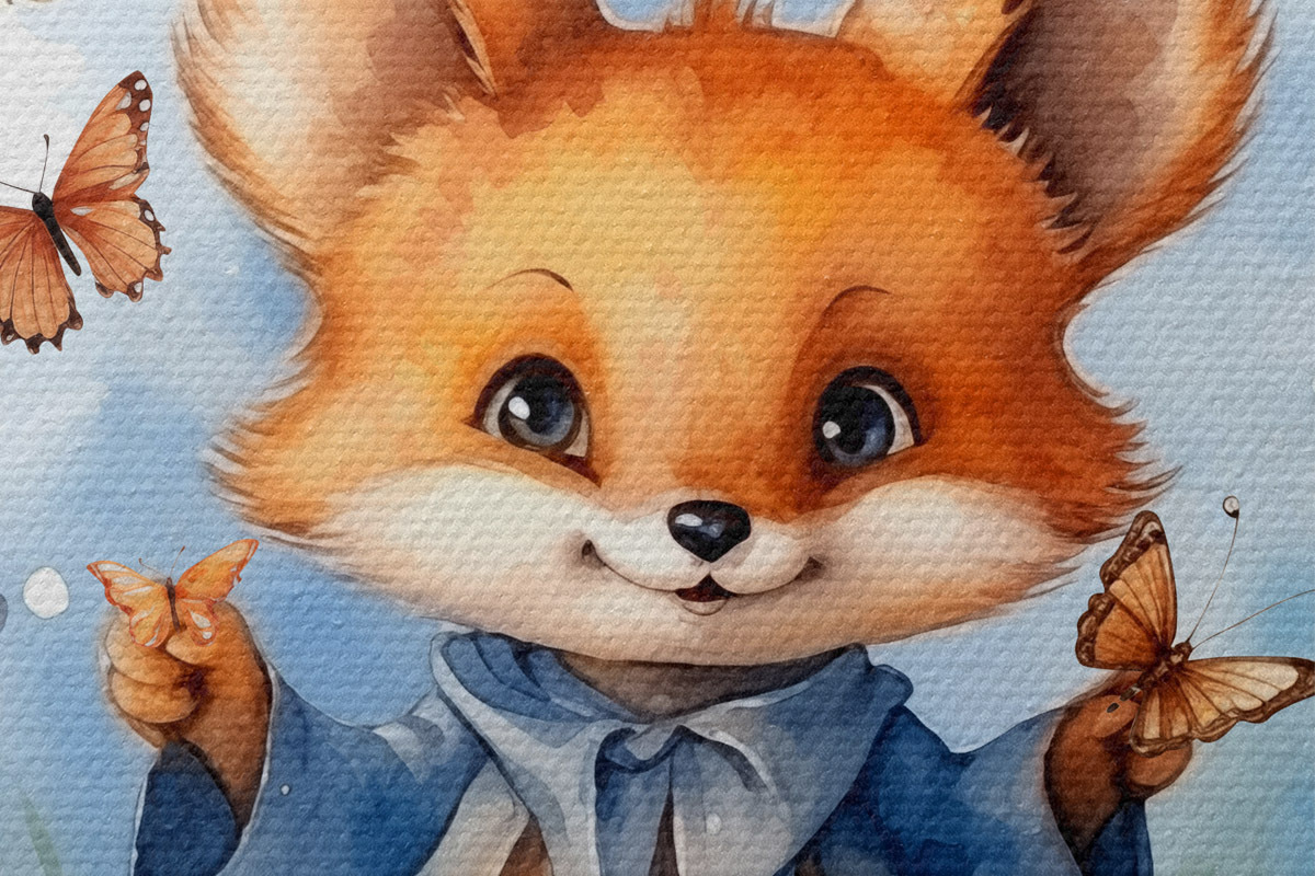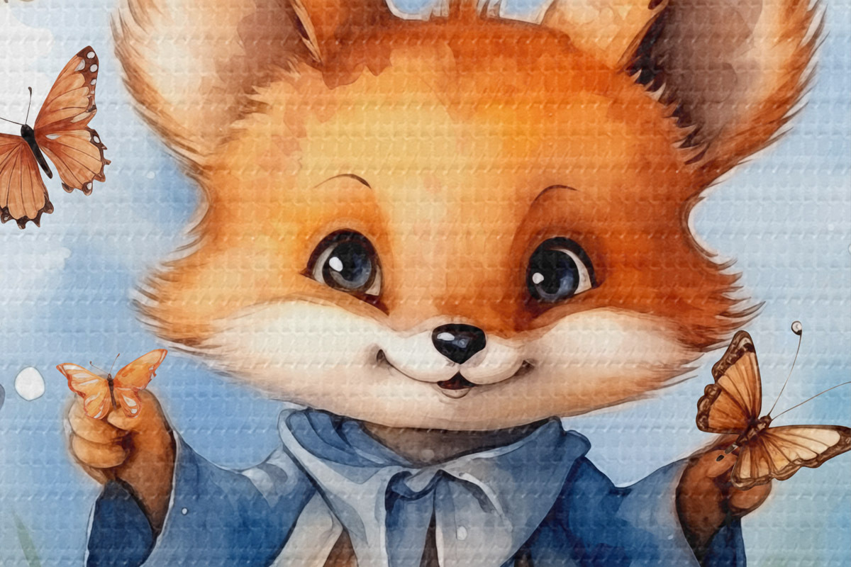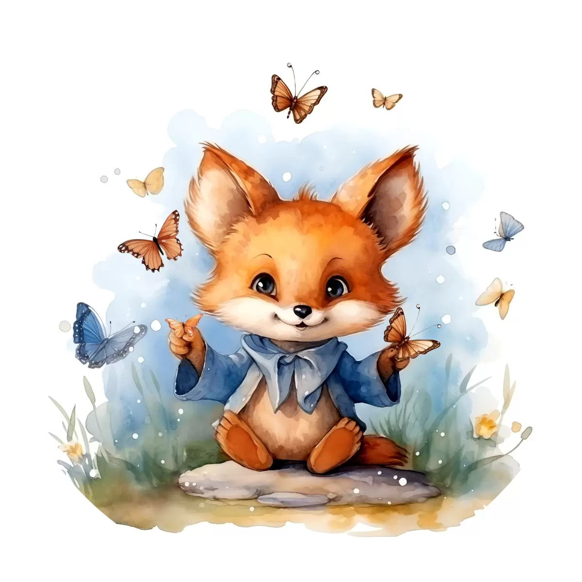 Nuotrauka Lapė mėlynu kostiumu sėdi ant pievelės tarp skraidančių drugelių, vaikiška akvarelės iliustracija Nr r39119