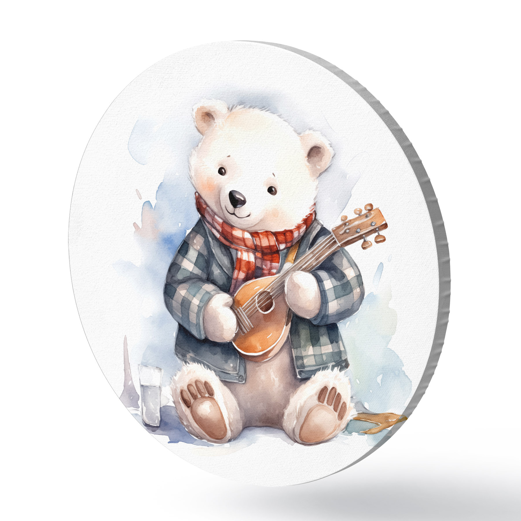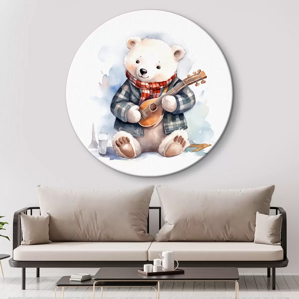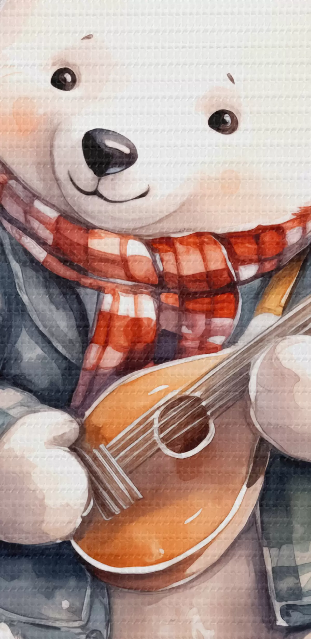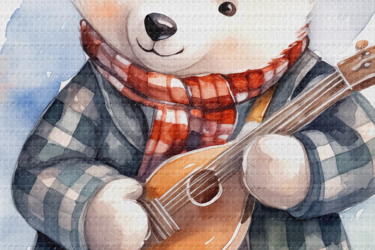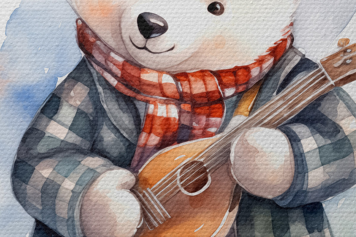 Nuotrauka Baltasis lokys muzikantas mėlynu languotu kostiumu ir raudona skarele groja gitara vaikiška akvarelės iliustracija Nr r39120