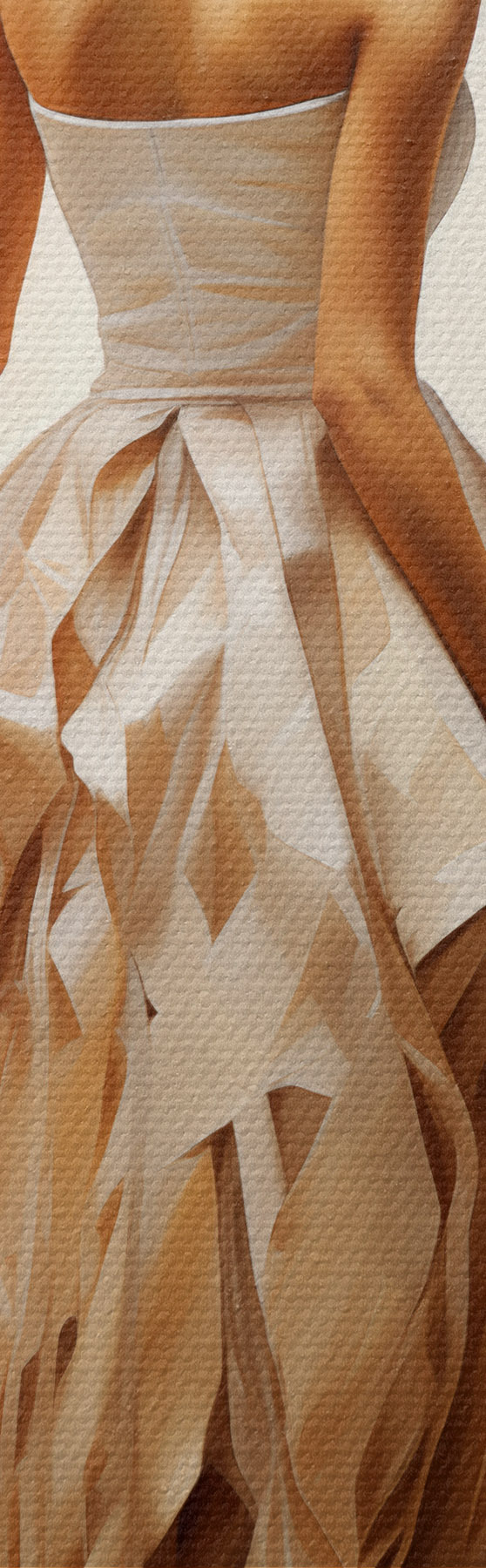 Nuotrauka Mergina balta ilga vestuvine suknele stovi prie lango tarp ugnies ir piešia rankų darbo Nr r39125