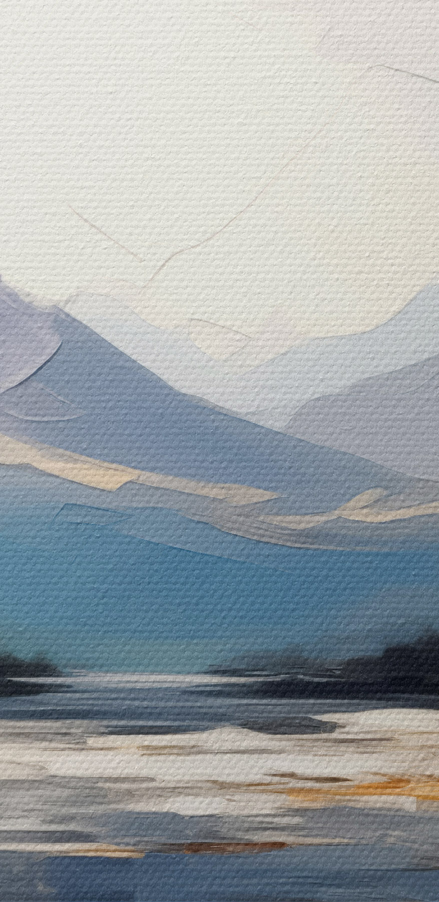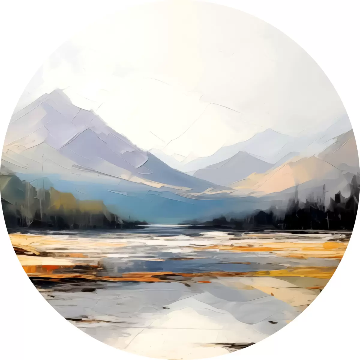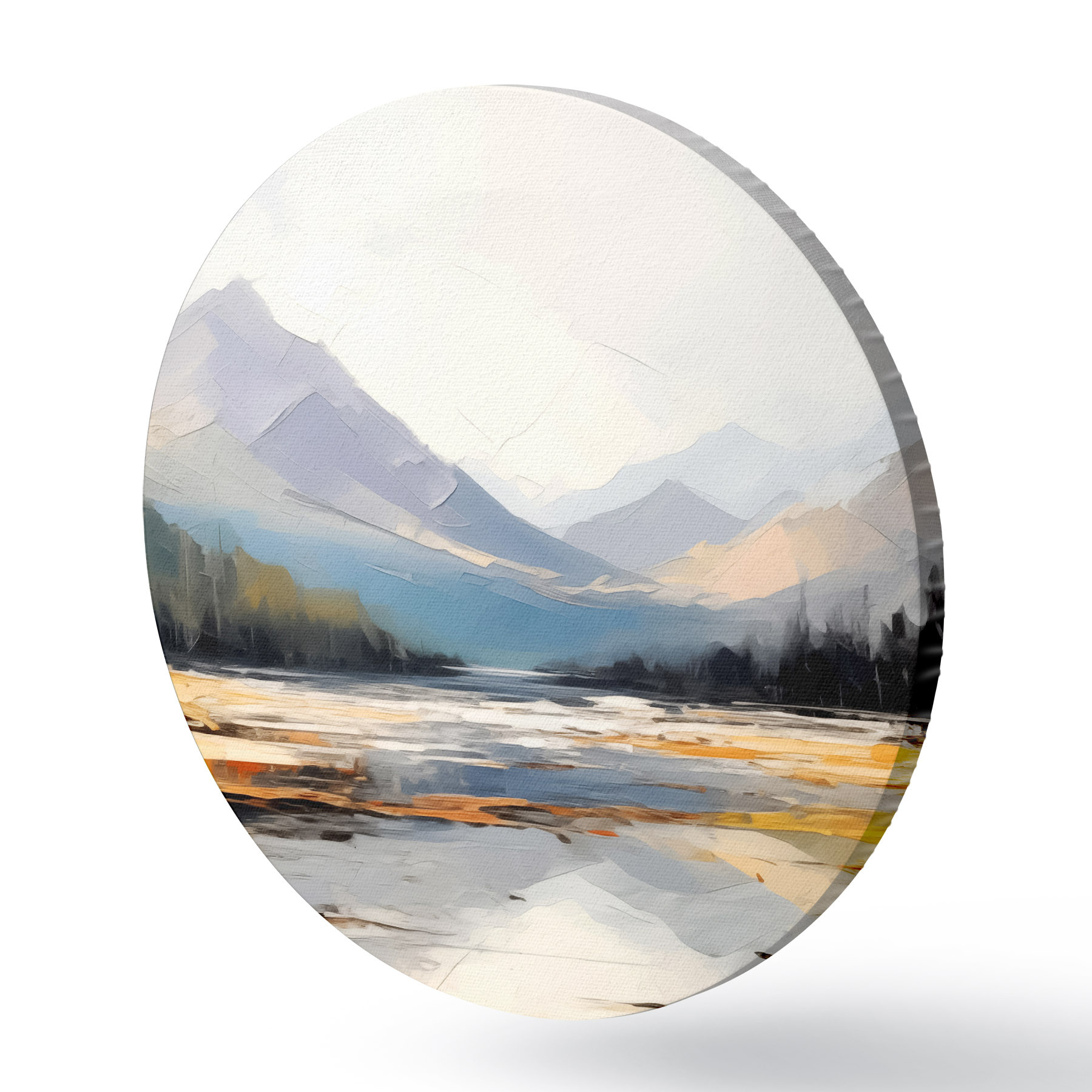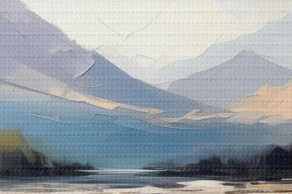 Nuotrauka Kalnų grandinės slėnyje aliejinė tapyba, peizažas, gamta, mėlyna, balta geltona spalva Nr r39128