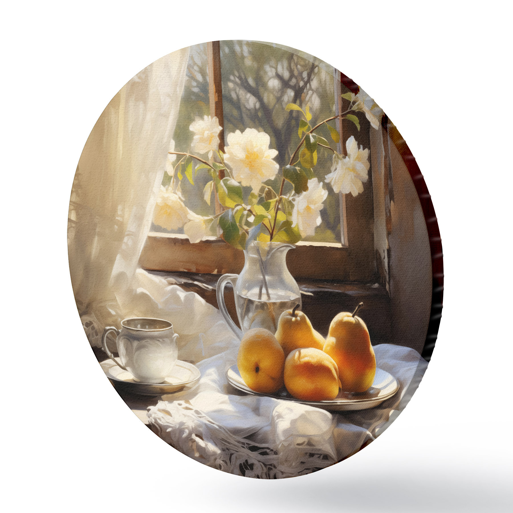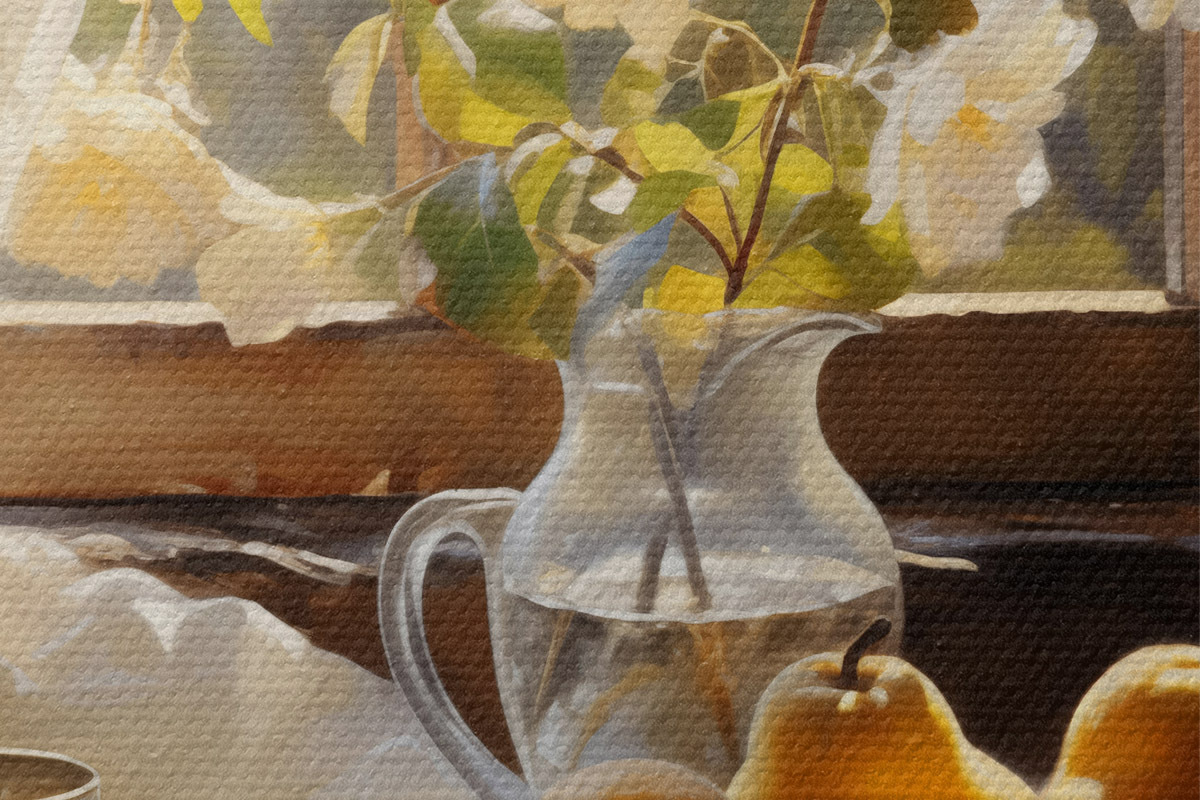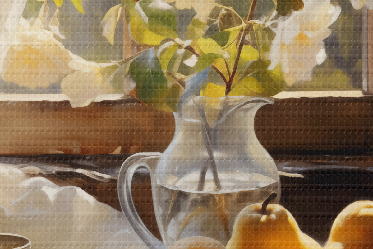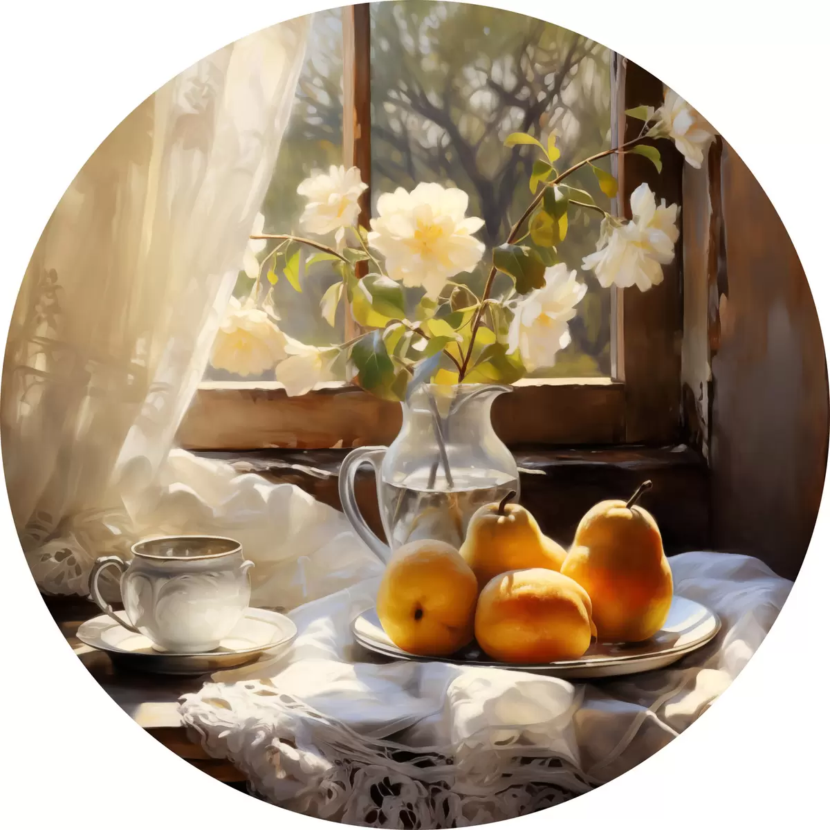Nuotrauka Kaimiškas geltonų prinokusių kriaušių natiurmortas lėkštėje ant stalo prie lango, baltos rožės stikliniame inde, baltos nėriniuotos užuolaidos Nr r39129