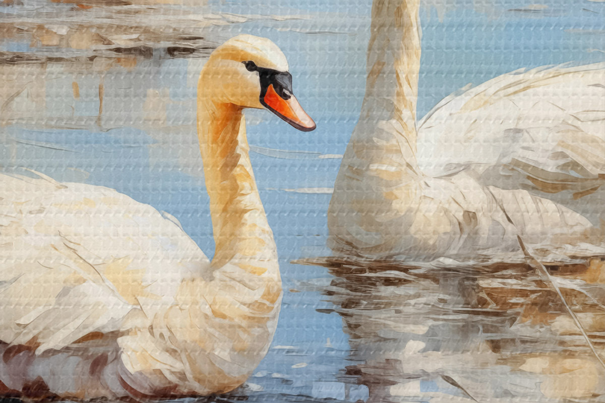 Nuotrauka Baltosios žąsys plaukia palei upę tarp nendrių, mėlynos, baltos, smėlio spalvos Nr r39130
