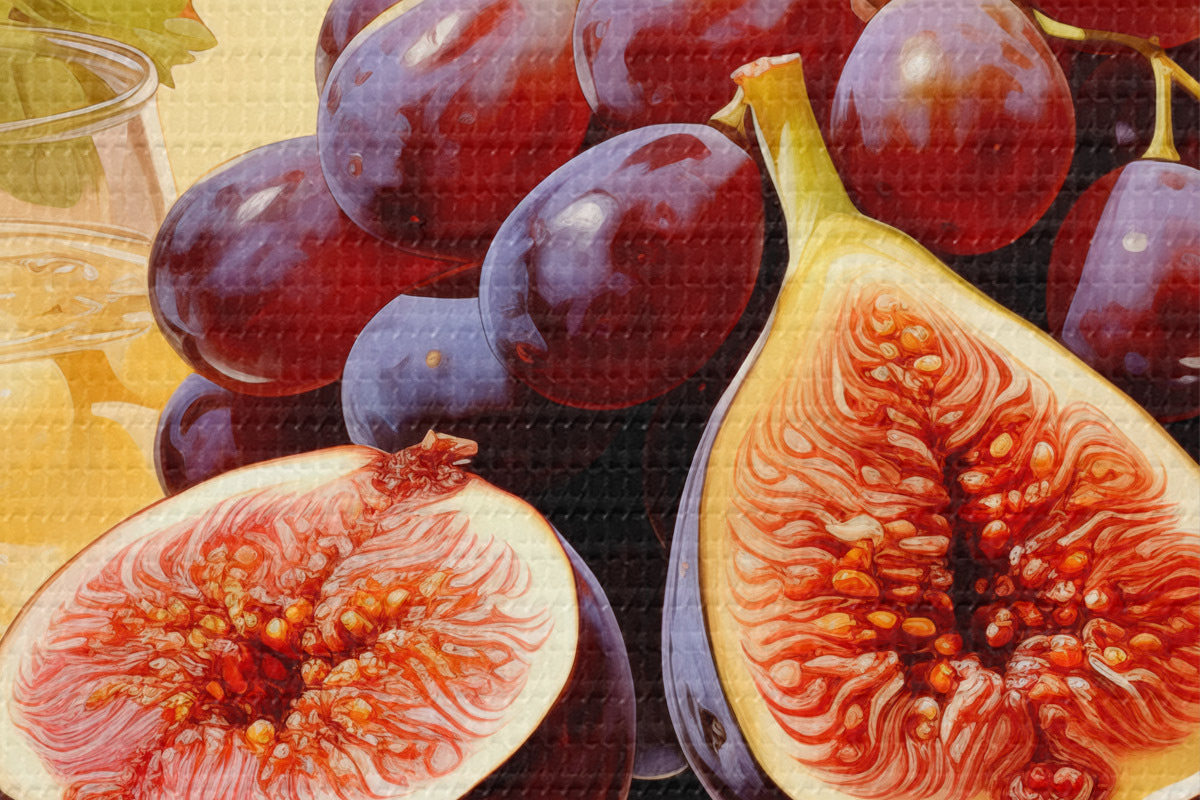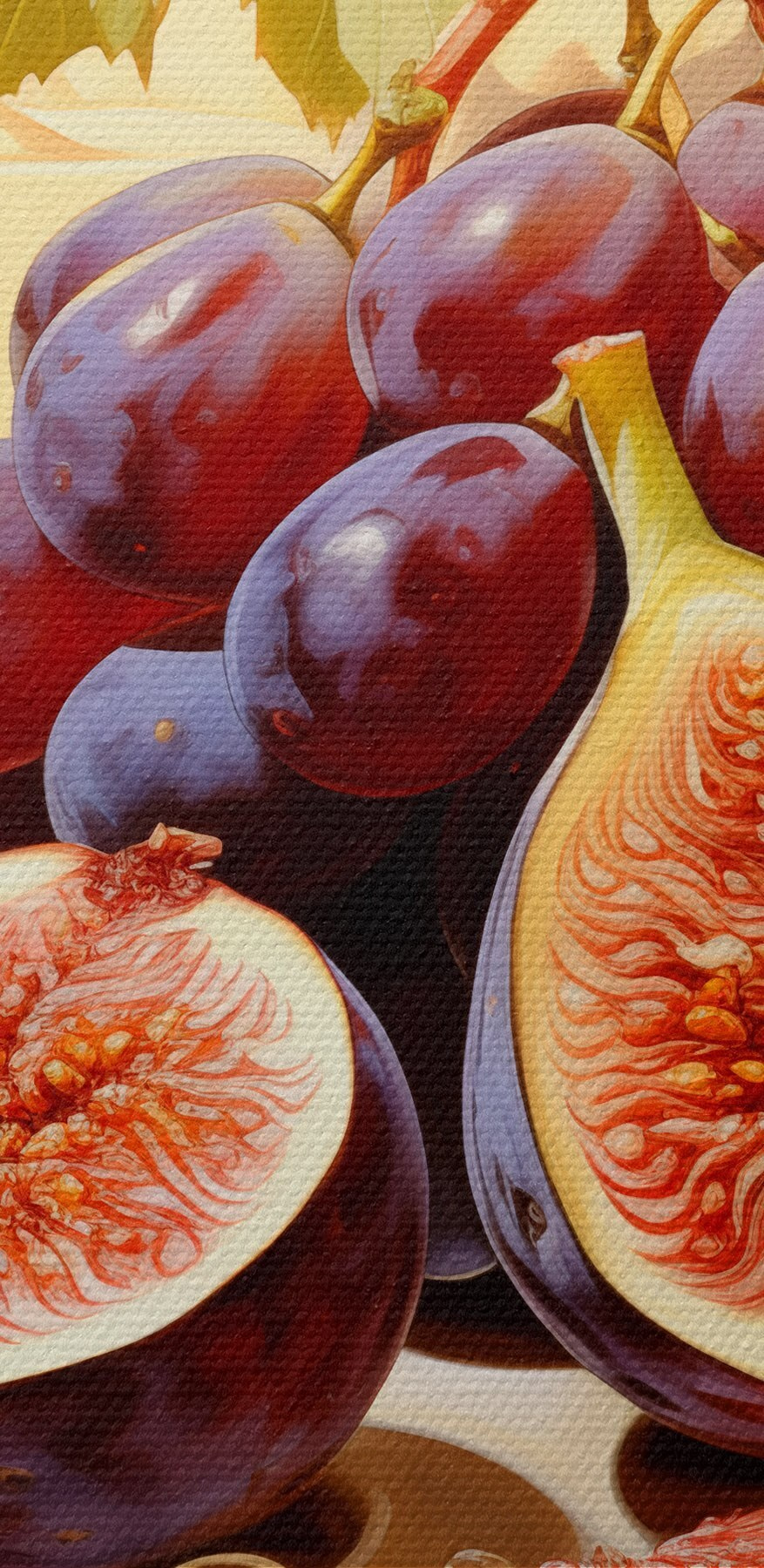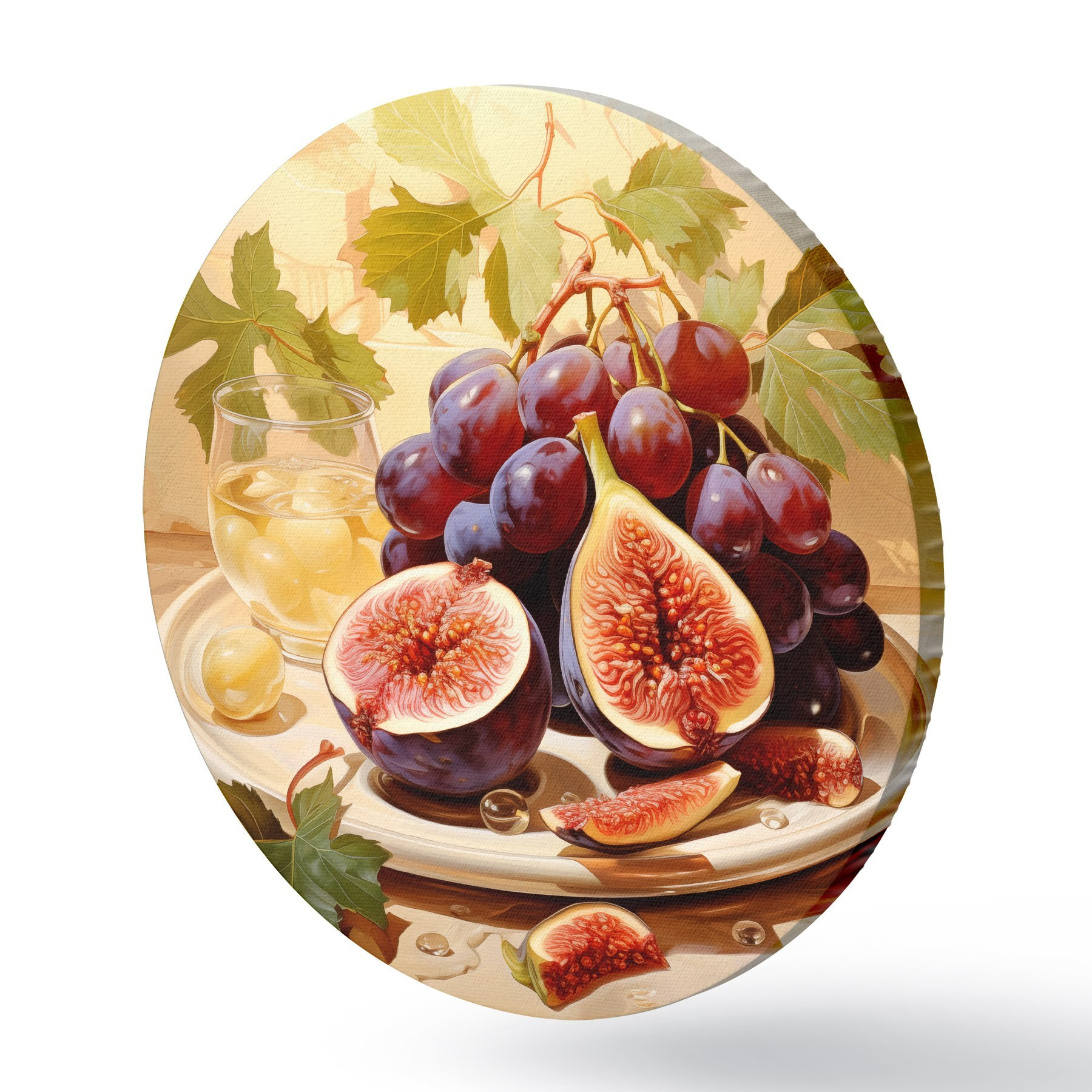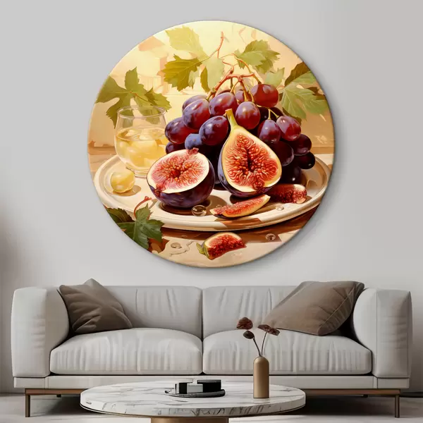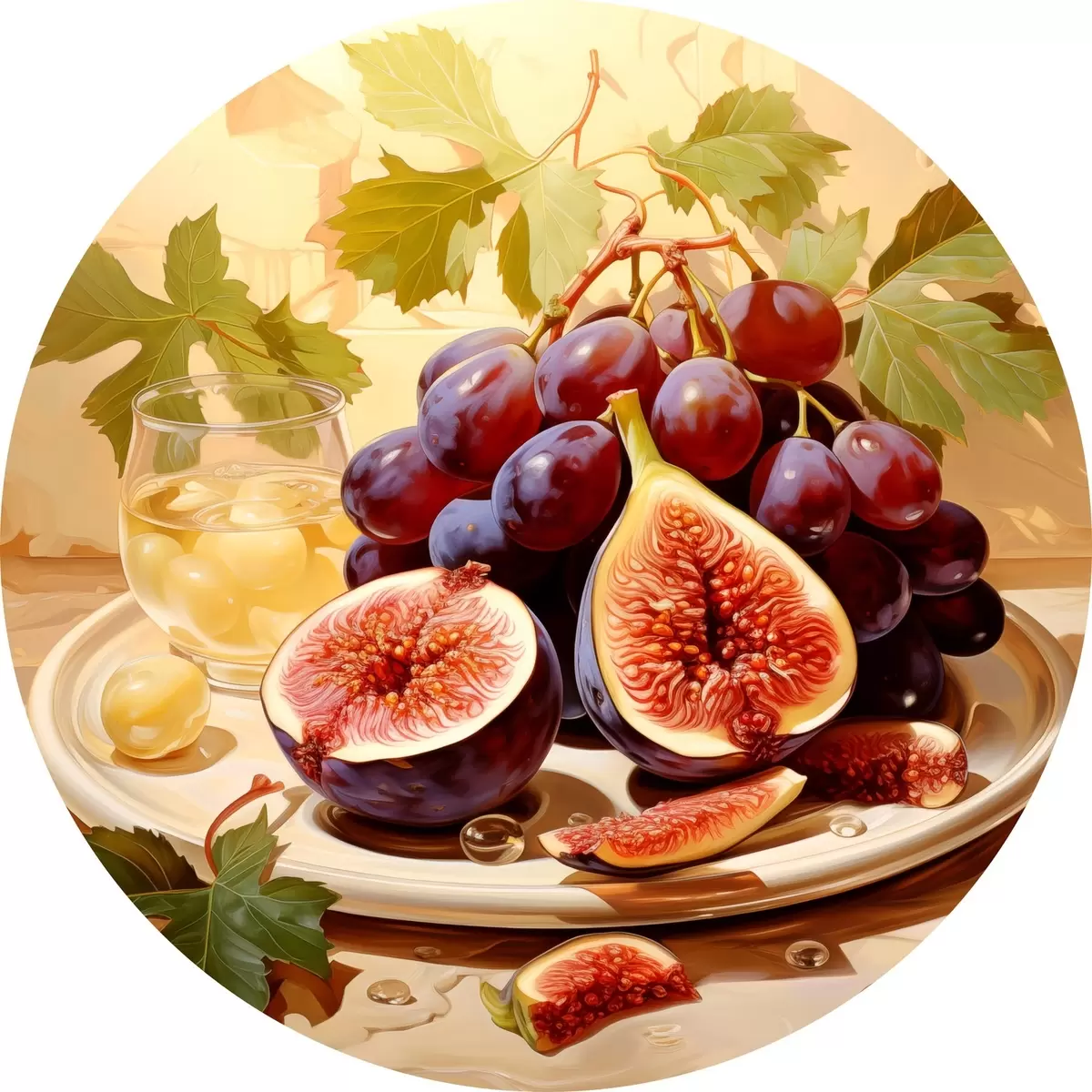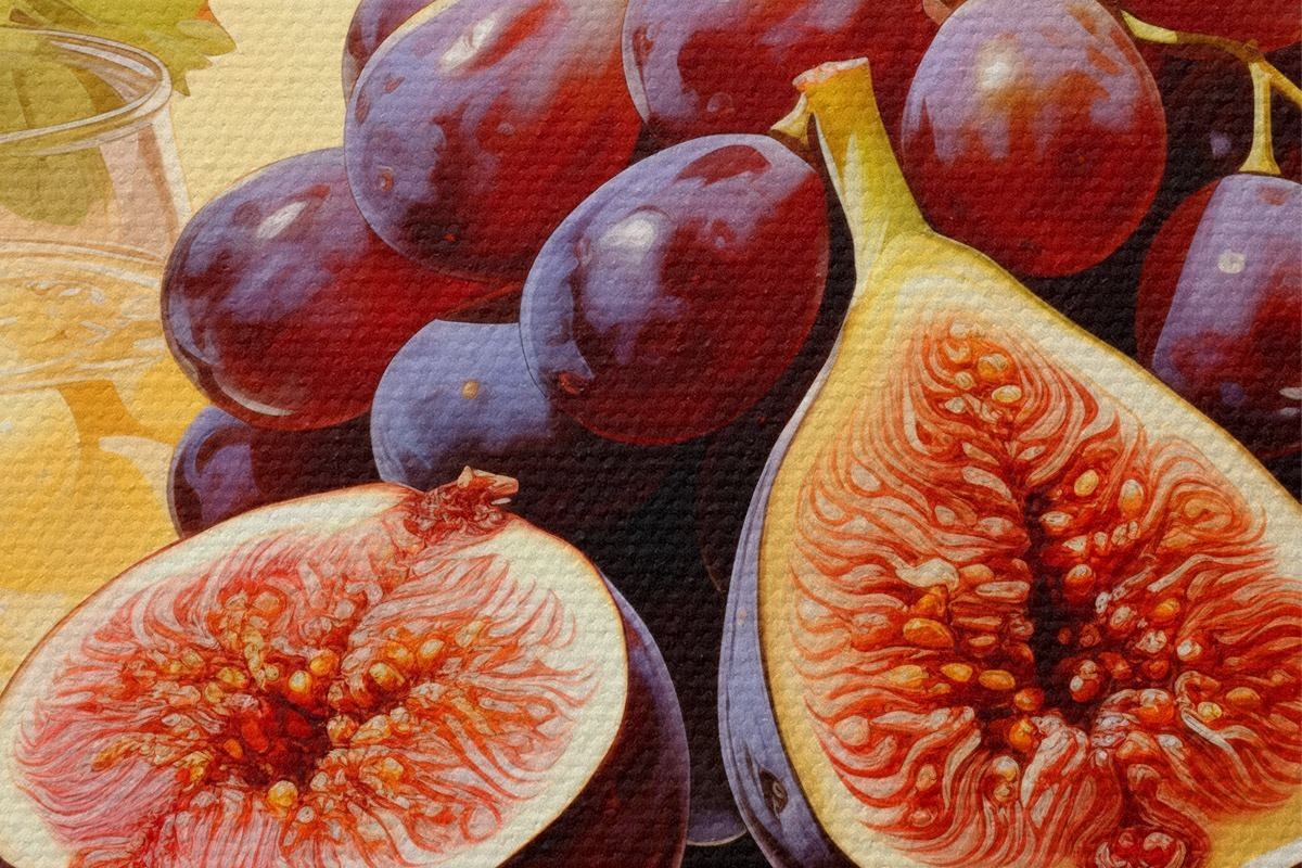 Nuotrauka Natiurmortas iš mėlynų vynuogių ir pjaustytų figų lėkštėje, aliejinis paveikslas, smėlio ir rožinės spalvos Nr r39131