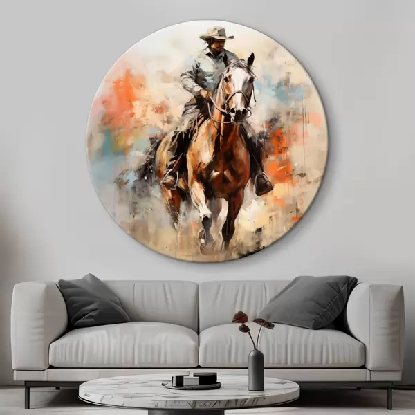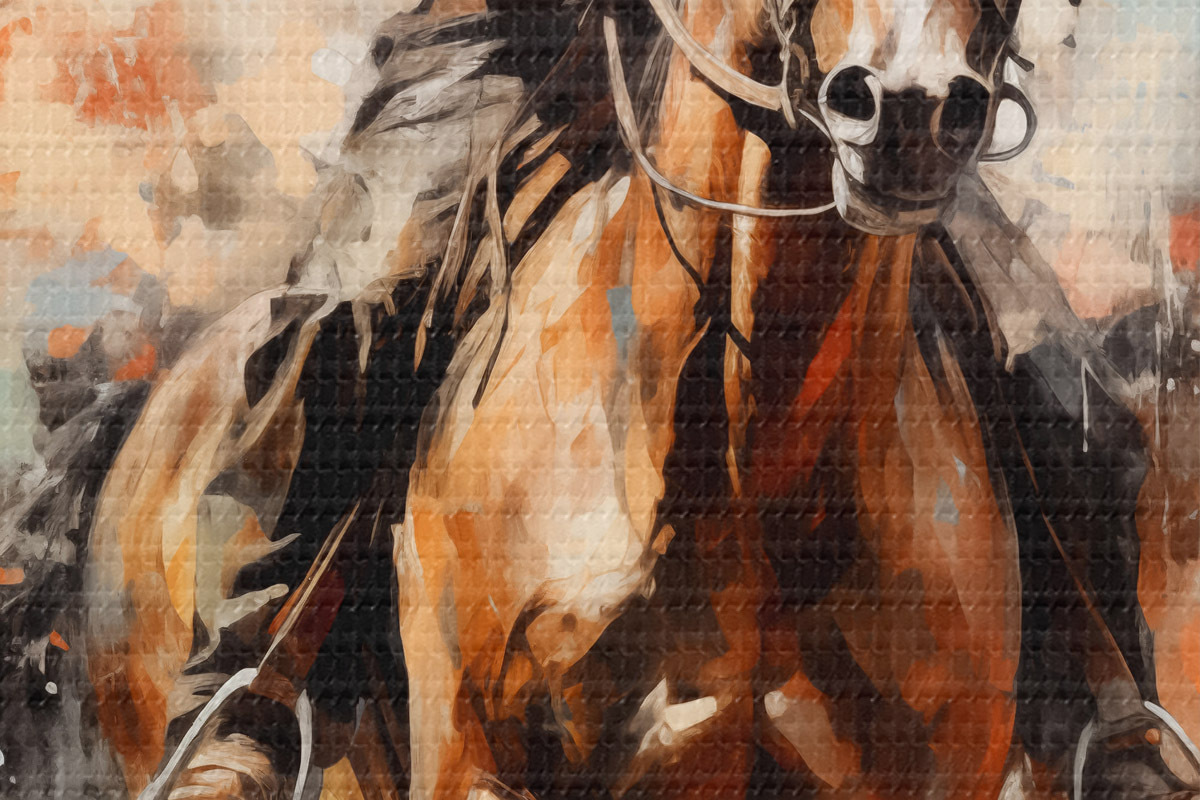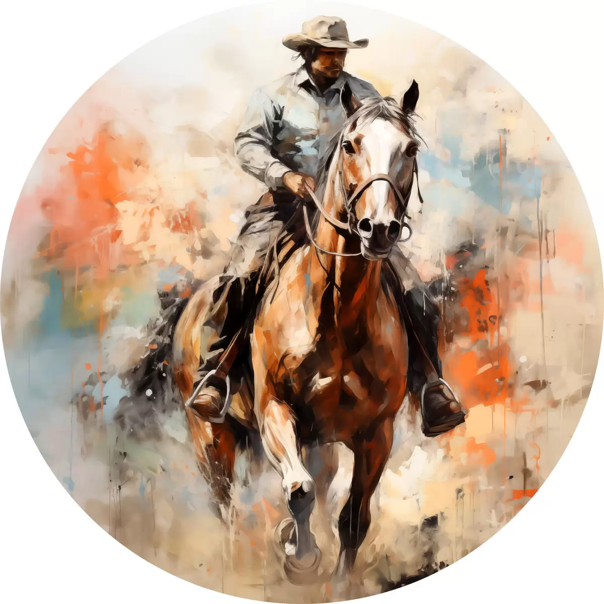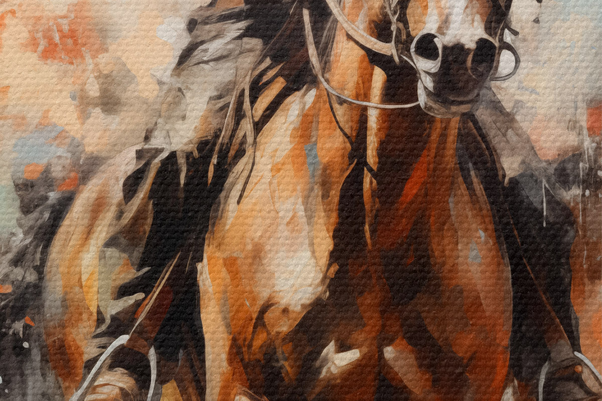 Nuotrauka Raitelis kaubojus su skrybėle šokinėja ant rudo arklio aliejumi tapyto abstraktaus meno paveikslo Nr r39181